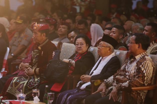 Presiden Joko Widodo bersama Ketua Umum DPP PDIP Megawati Soekarnoputri, Wakil Presiden terpilih Ma'ruf Amin dan Ketua Umum Partai Gerindra Prabowo Subianto, hadir pada pembukaan Kongres V PDIP di Sanur, Bali, Kamis (8/8/2019). Kongres V PDIP yang berlangsung 8-11 Agustus 2019 tersebut dihadiri sekitar 2.170 peserta dari 514 Dewan Pimpinan Cabang (DPC), 34 Dewan Pimpinan Daerah (DPD), para pengamat dan sejumlah pimpinan partai politik. AKTUAL/HO-Maman Error