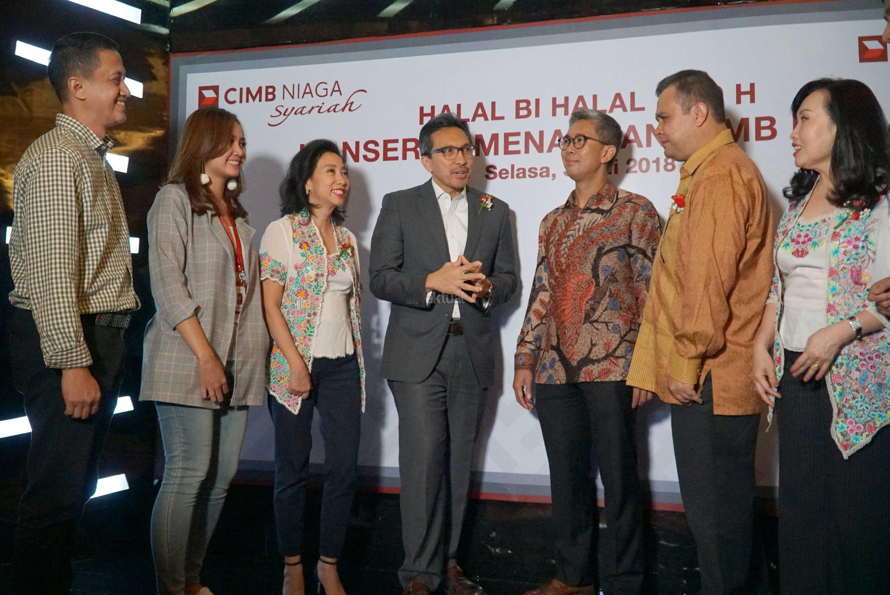 Komisaris CIMB Niaga Tengku Dato’ Sri Zafrul Tengku Abdul Aziz (ketiga kanan), Presiden Direktur Tigor M. Siahaan (keempat kiri), Direktur Human Resources Hedy Lapian, Direktur Consumer Banking Lani Darmawan dan Direktur Syariah Banking Pandji P. Djajanegara berbincang dengan karyawan di sela Konser Kemenangan CIMB Niaga di Jakarta, Selasa (3/7/2018). Konser bertujuan menjalin kebersamaan manajemen dengan karyawan, serta wujud apresiasi atas kontribusi karyawan meningkatkan kinerja perusahaan. Selain grup band NOAH, tampil juga brand ambassador CIMB Niaga Maudy Ayunda dan Sandra Dewi. AKTUAL/Eko S Hilman