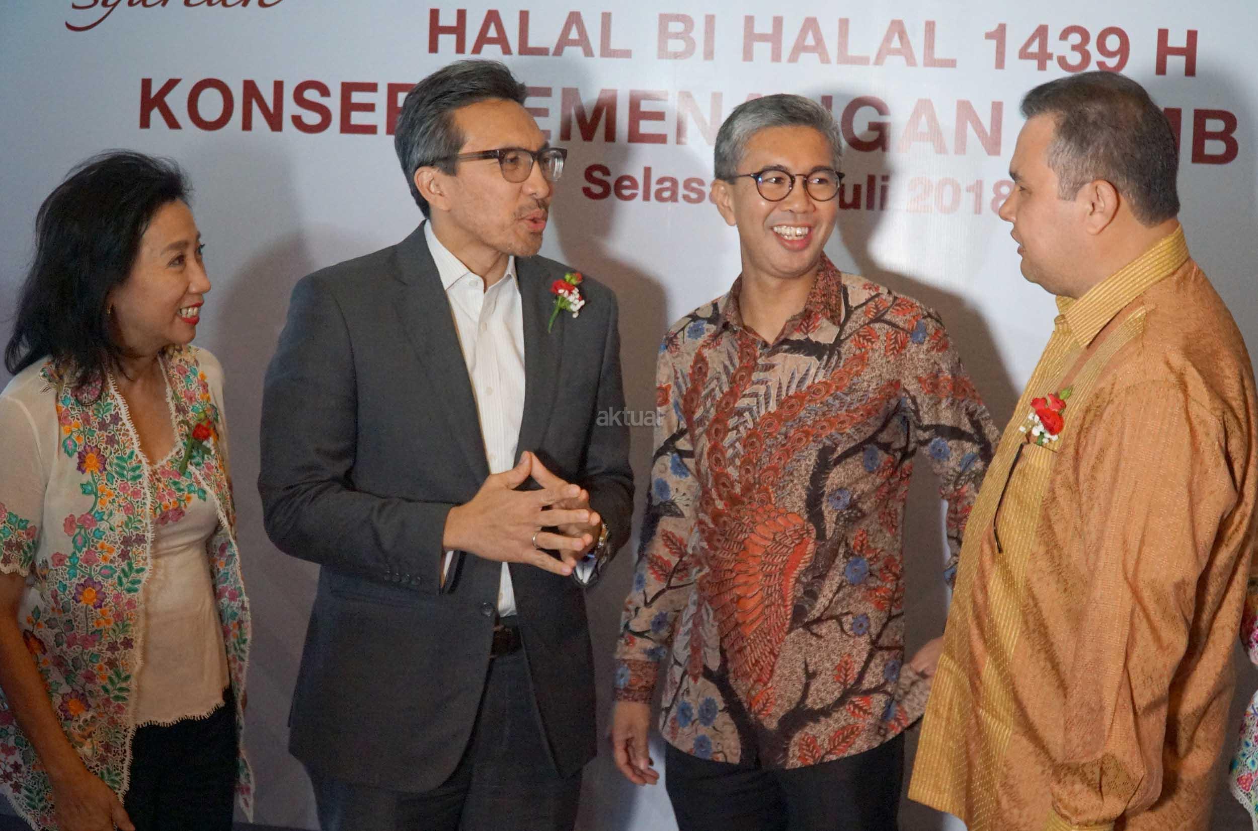 Komisaris CIMB Niaga Tengku Dato’ Sri Zafrul Tengku Abdul Aziz (kedua kanan), Presiden Direktur Tigor M. Siahaan (kedua kiri) berbincang di sela Konser Kemenangan CIMB Niaga di Jakarta, Selasa (3/7/2018). Konser bertujuan menjalin kebersamaan manajemen dengan karyawan, serta wujud apresiasi atas kontribusi karyawan meningkatkan kinerja perusahaan. Selain grup band NOAH, tampil juga brand ambassador CIMB Niaga Maudy Ayunda dan Sandra Dewi. AKTUAL/Eko S Hilman