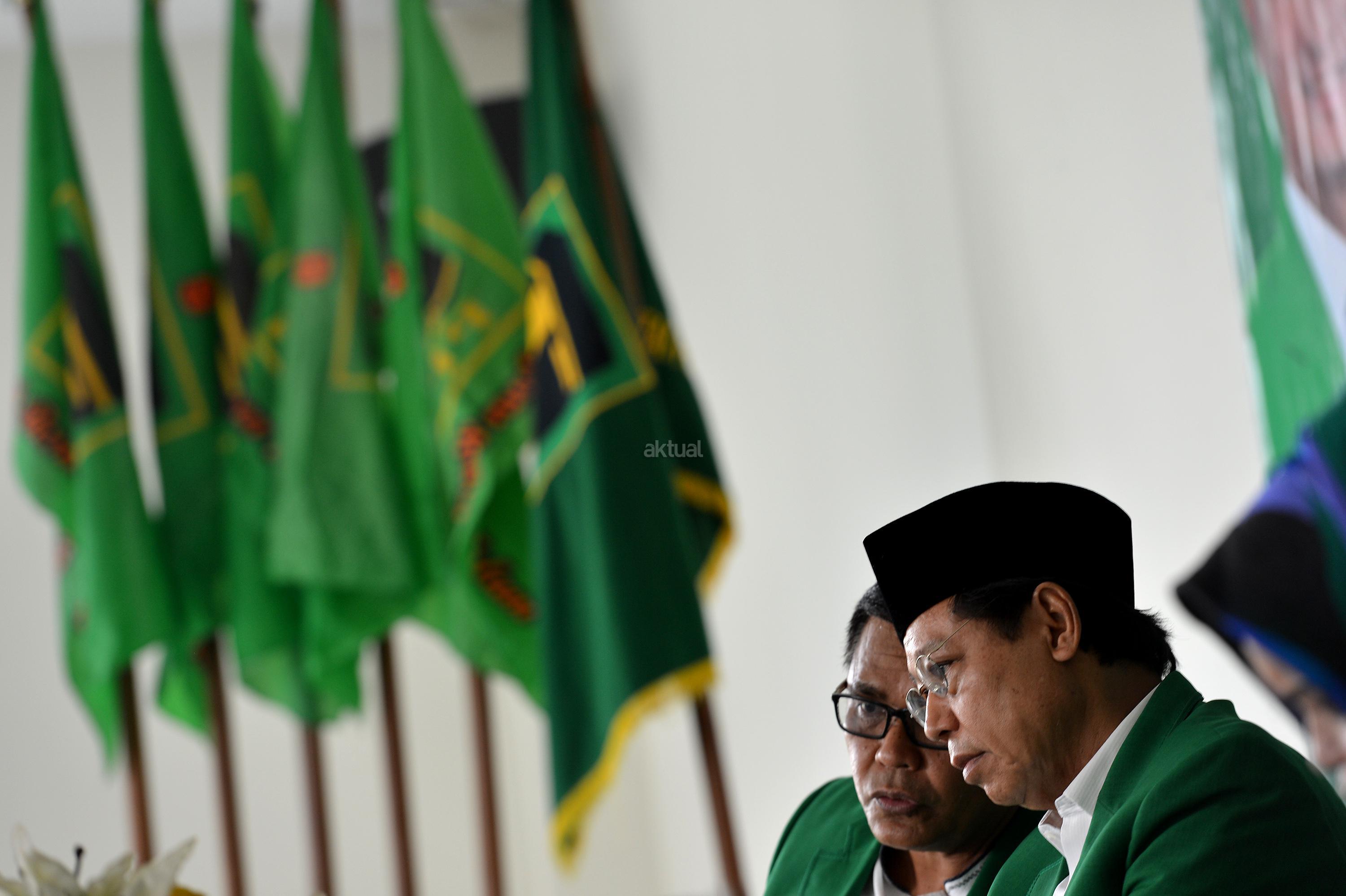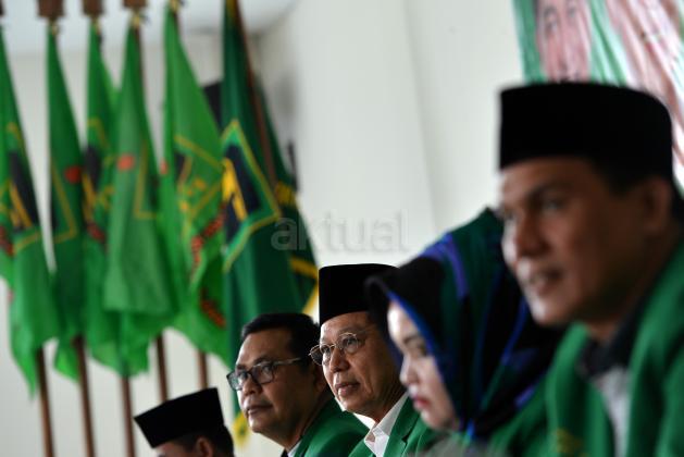 Ketua Umum PPP Djan Faridz (tengah) didampingi jajaran pengurus membuka Konsolidasi Nasional PPP di Jakarta, Kamis (22/10). Konsolidasi Nasional diikuti 34 Dewan Pimpinan Wilayah (DPW) PPP di seluruh Indonesia yang berlangsung 22- 23 Oktober 2015 yang membahas tentang keorganisasian dan posisi hukum PPP khususnya setelah keluarnya putusan kasasi Mahkamah Agung (MA). ANTARA FOTO/Prasetyo Utomo/ama/15