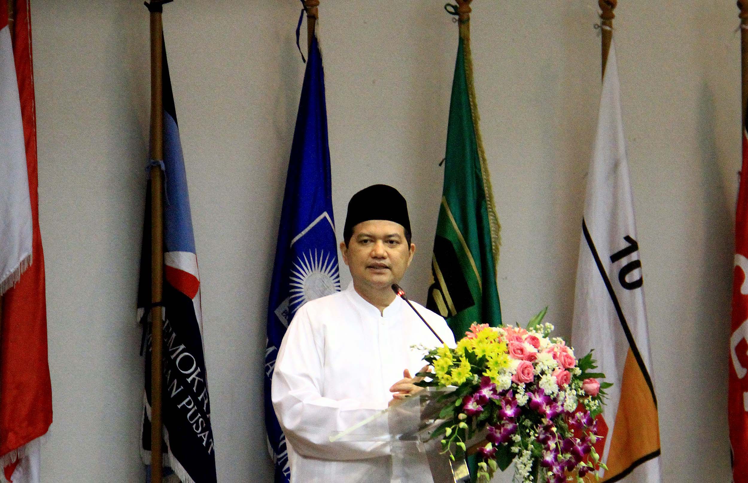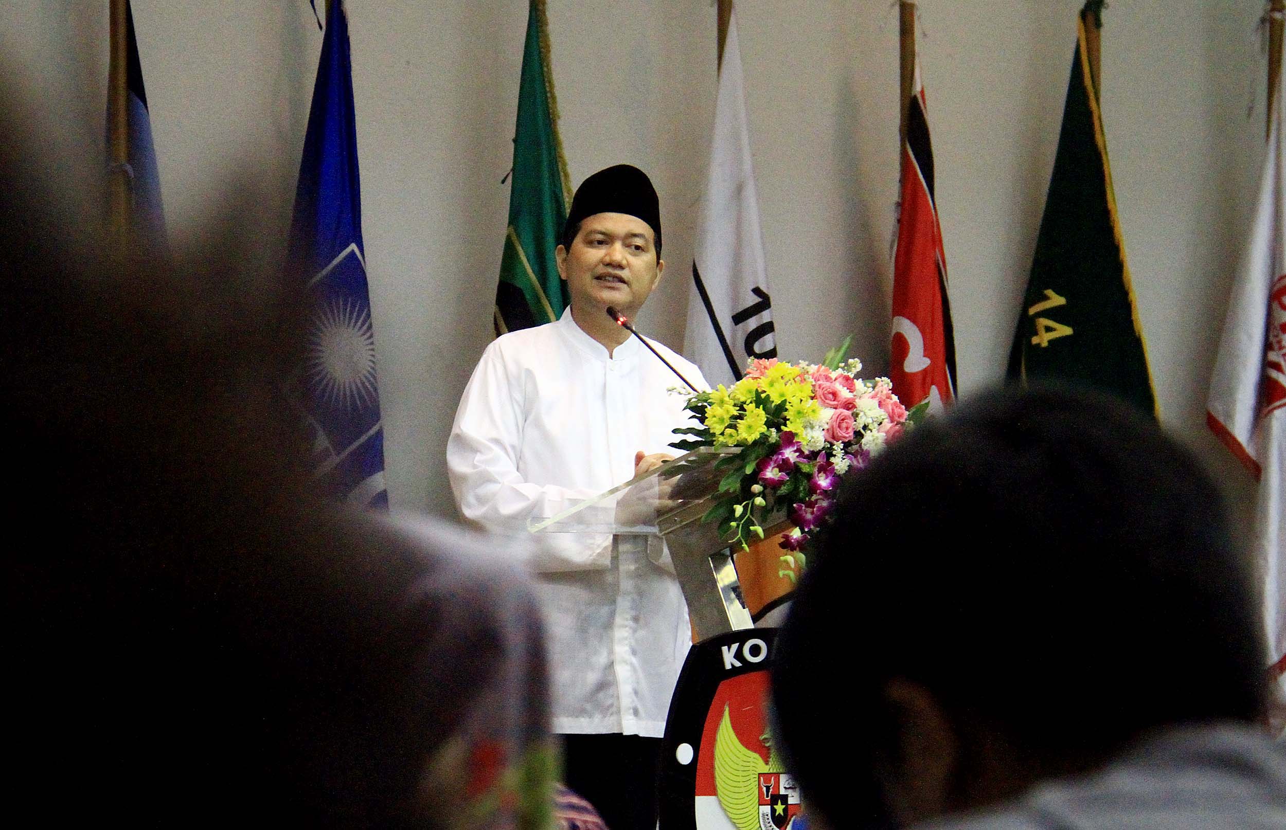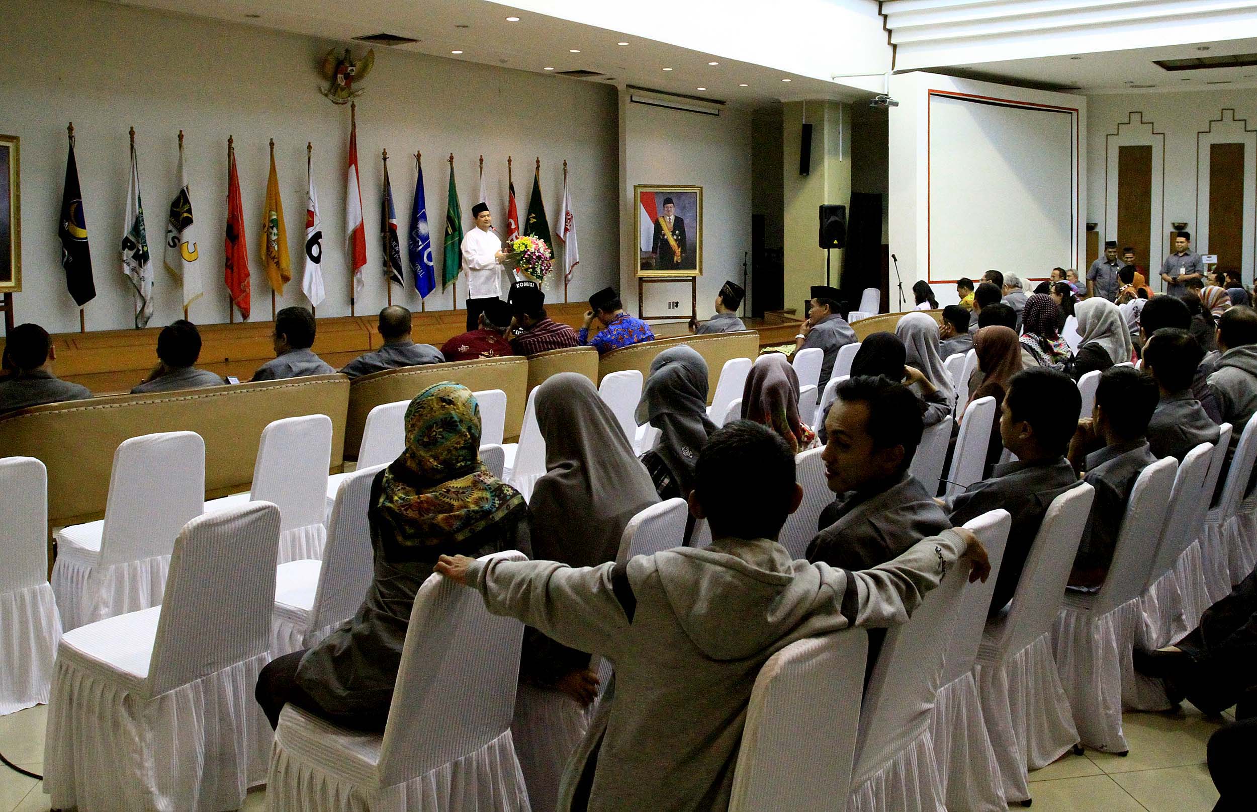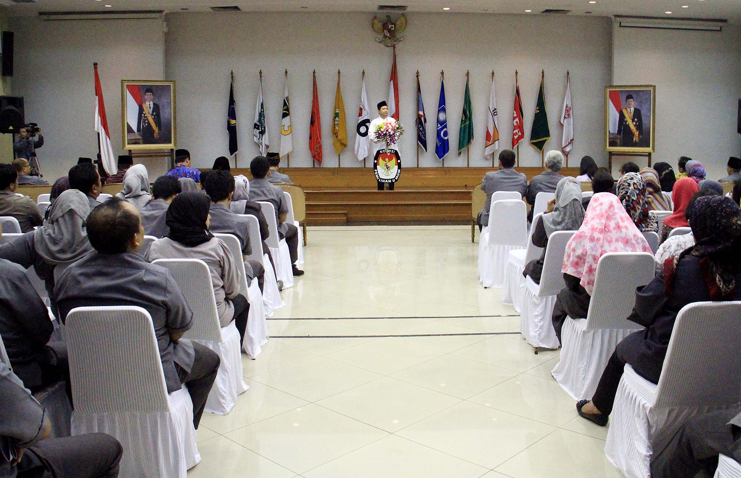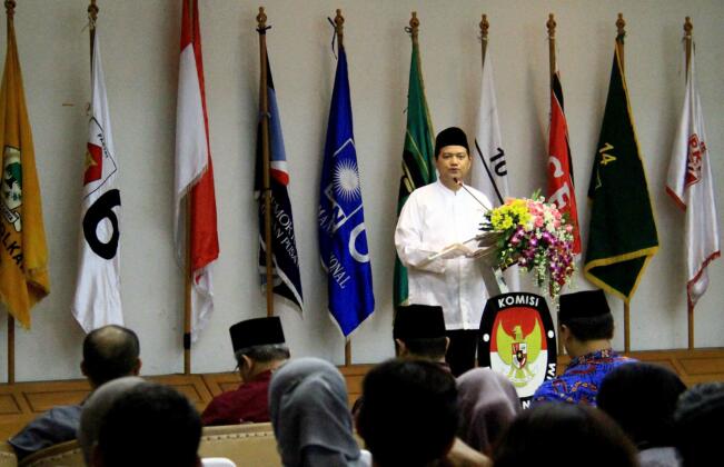 Ketua Komisi Pemilihan Umum (KPU) Husni Kamil Manik memberikan pengarahan dalam acara Silahturahmi dan Konsolidasi Organisasi di Gedung KPU, Jakarta, Senin (27/6/2016). Konsolidasi internal organisasi KPU tersebut digelar dalam rangka persiapan menjelang pilkada serentak tahun 2017