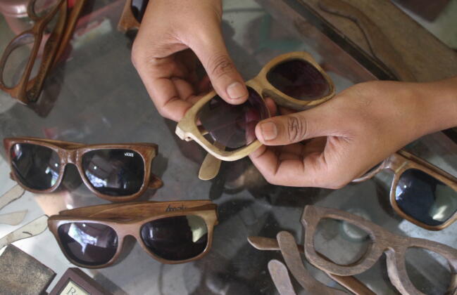 Pengrajin menyelesaikan pembuatan kacamata dari limbah kayu industri mebel sebelum dijual ke Jakarta dengan harga Rp415.000 - Rp580.000 per buah di Kebonsari, Malang, Jawa Timur, Rabu (11/5). Himpunan Pengusaha Muda Indonesia (HIPMI) mencatat, Unit Usaha Kecil Menengah (UMKM) termasuk di dalamnya industri kreatif berkontribusi terhadap investasi nasional hingga mencapai 50 persen per tahun dan mampu menyerap angkatan kerja mencapai 97 persen dengan kontribusi terhadap Produk Domestik Bruto (PDB) rata-rata diatas 50 persen. ANTARA FOTO/Ari Bowo Sucipto/foc/16.