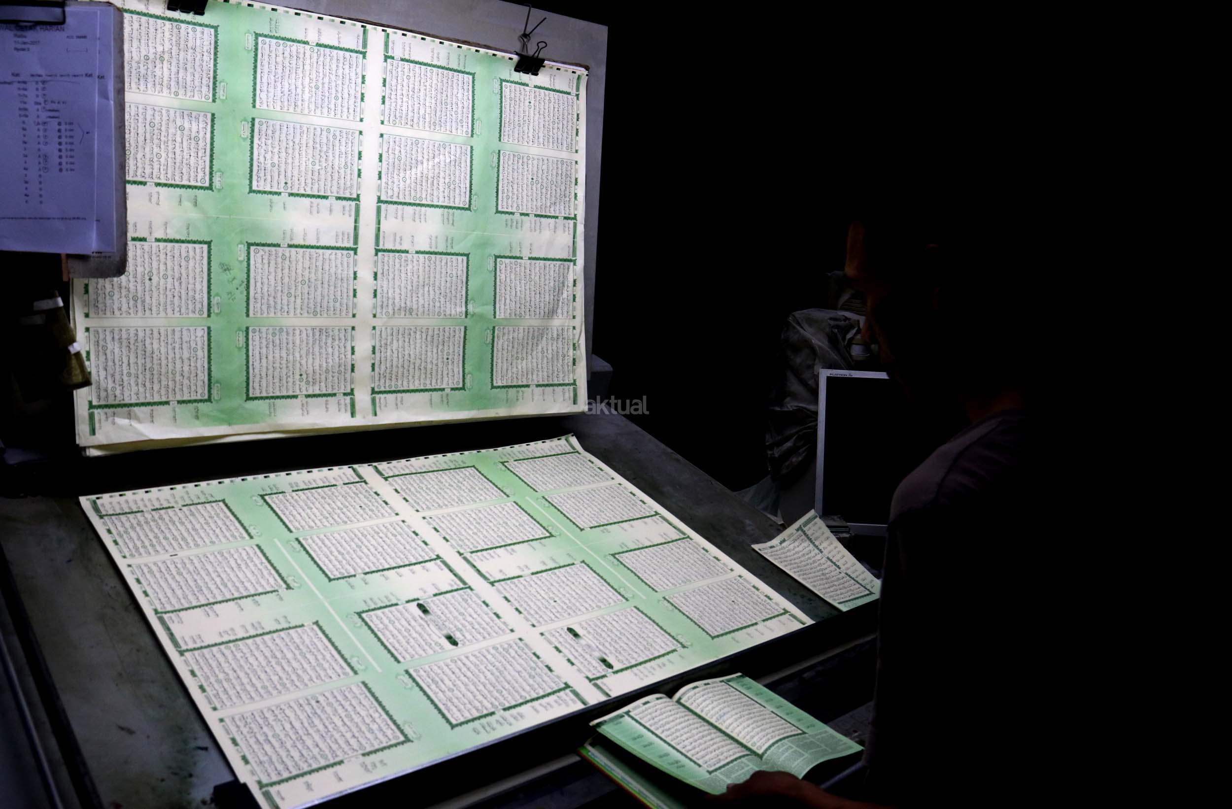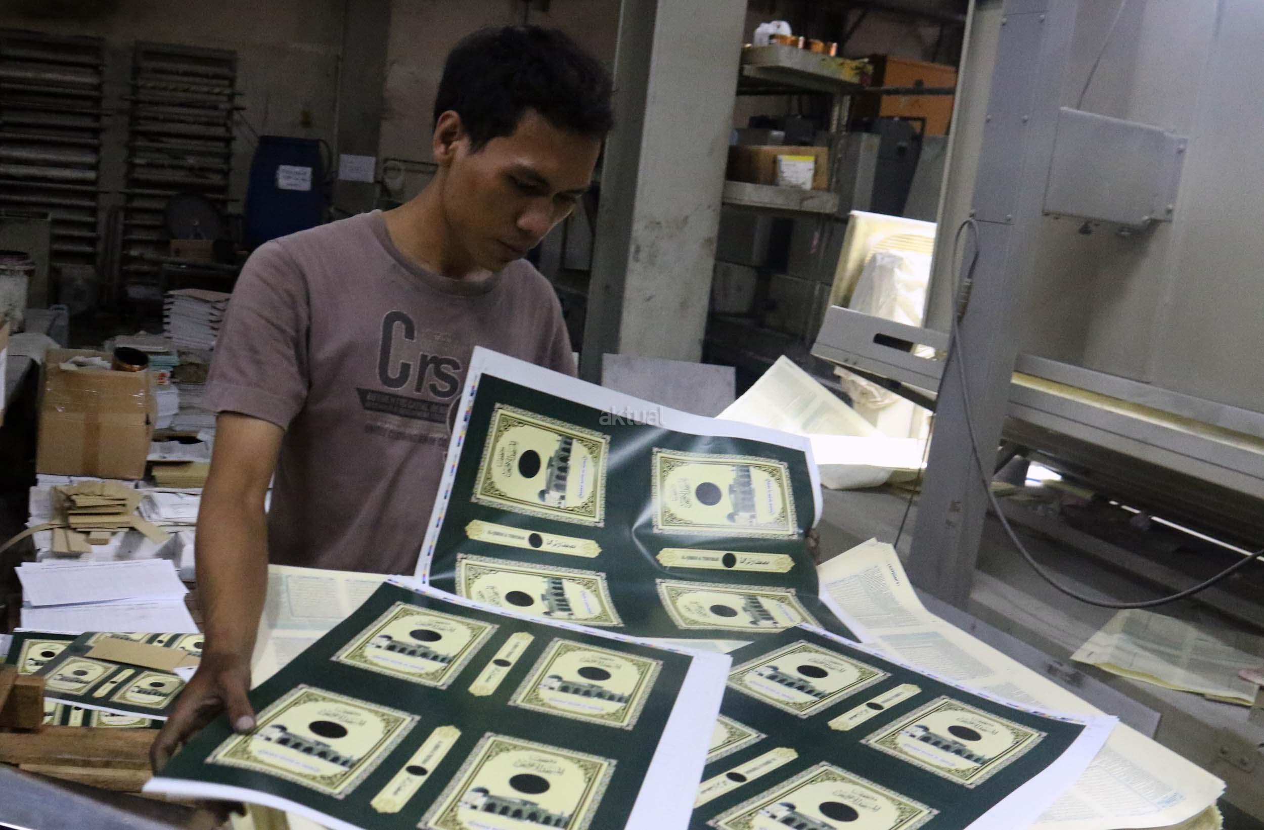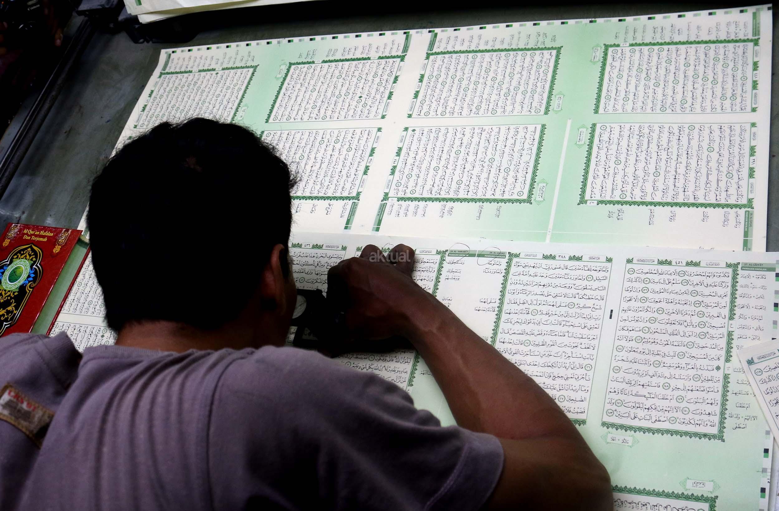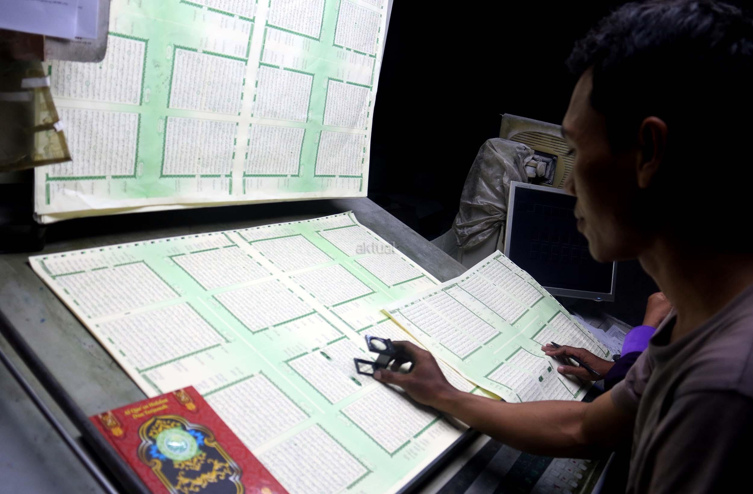 Pekerja memeriksa ketebalan warna huruf Al Quran yang dicetak di Jakarta, Jumat (13/1/2017). Kementerian Agama meminta agar penerbit dan percetakan lebih berhati-hati dalam mengontrol penanganan limbah Al Quran, sesuai dengan peraturan yang dikeluarkan Kementerian Agama, agar tidak ada lagi penyalahgunaan limbah kertas percetakan Al Quran. AKTUAL/Munzir