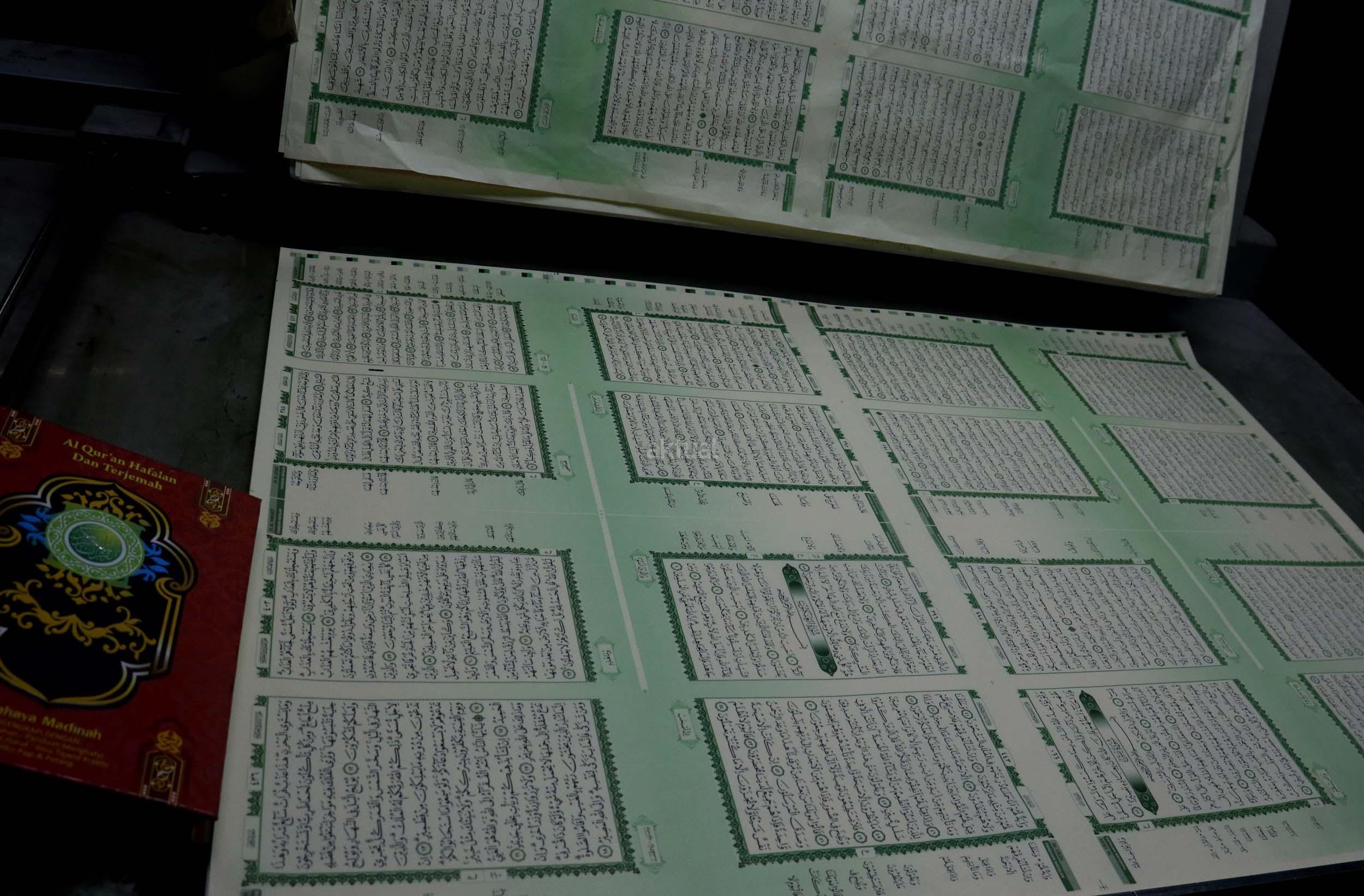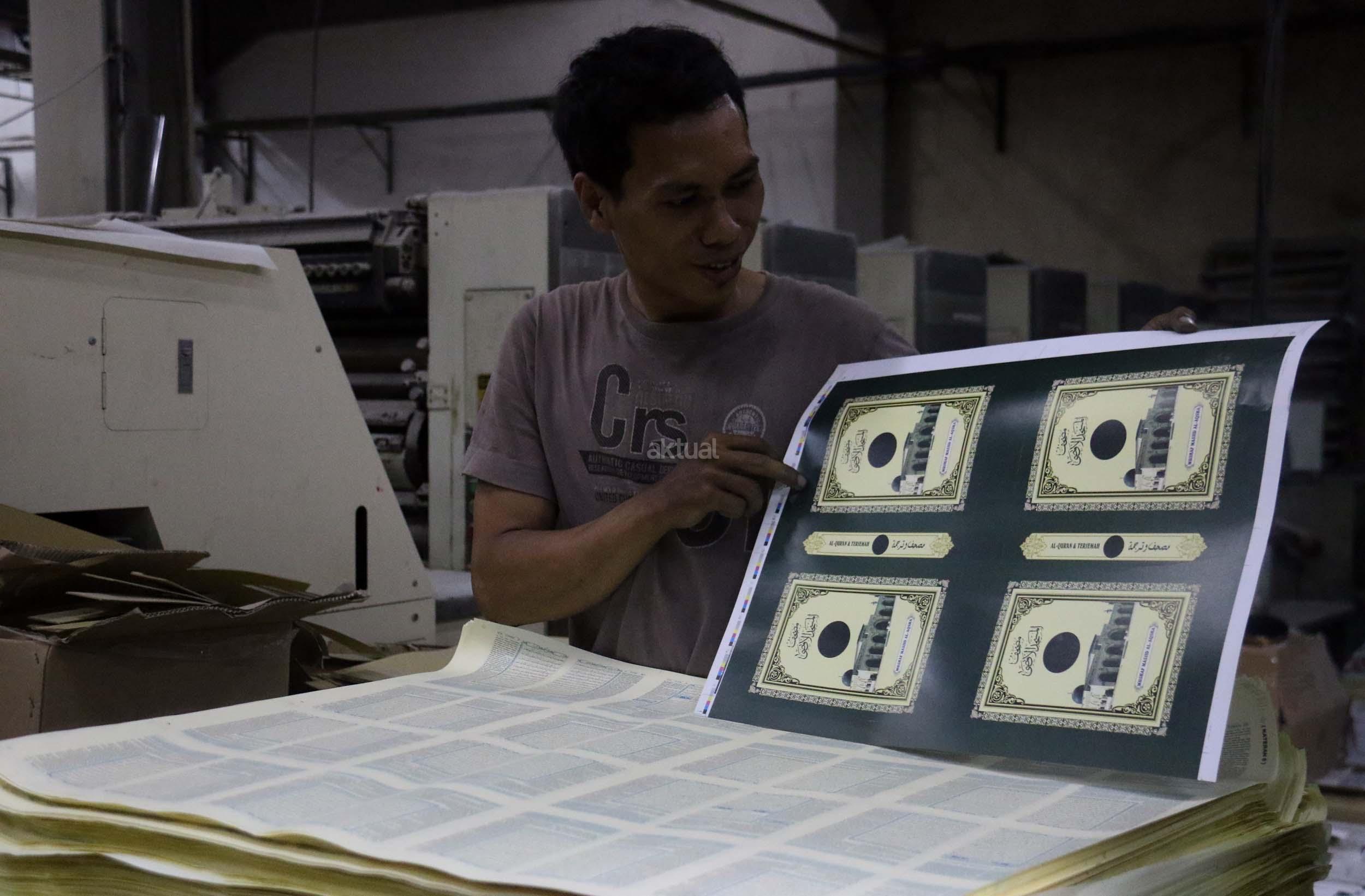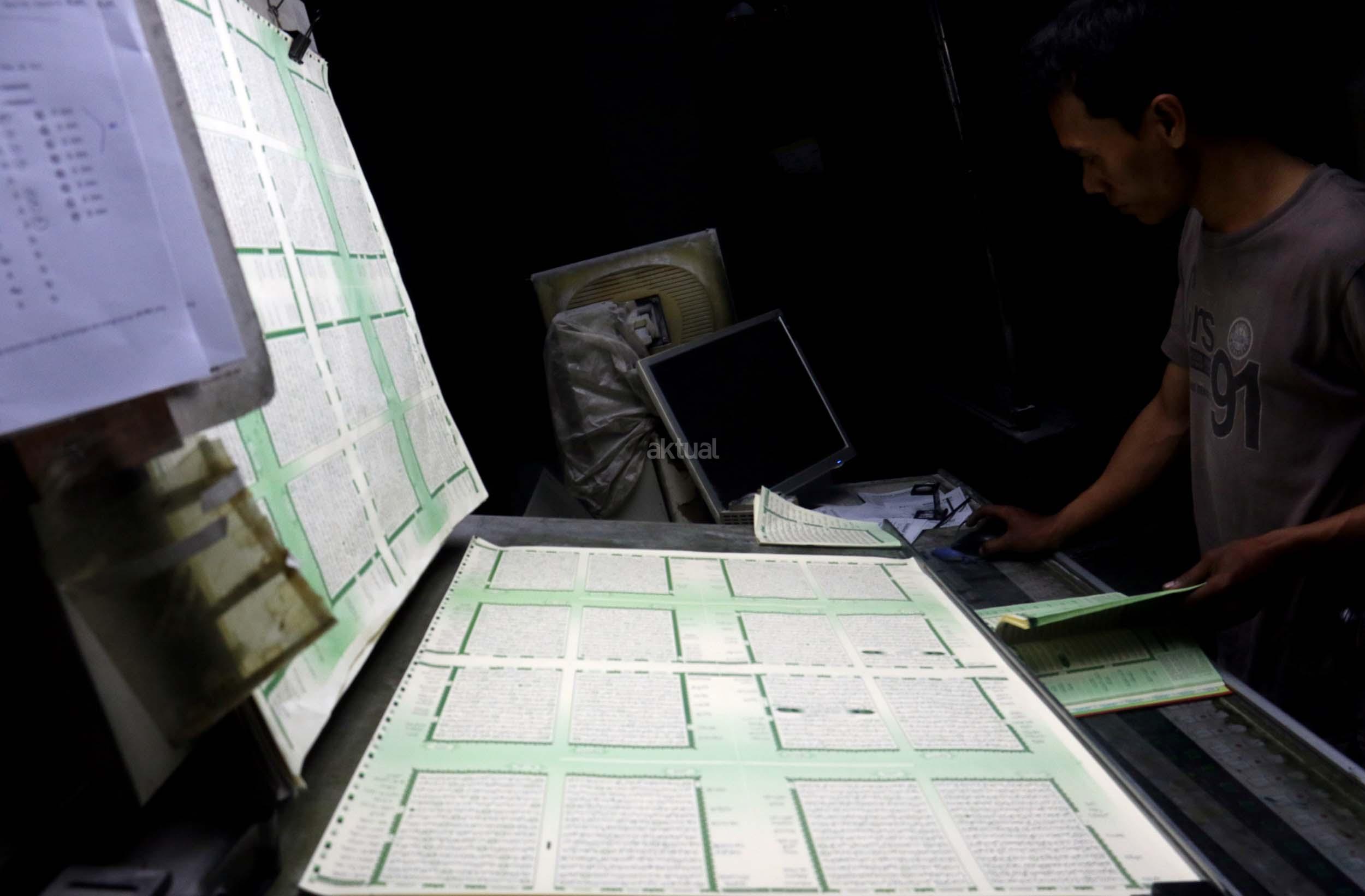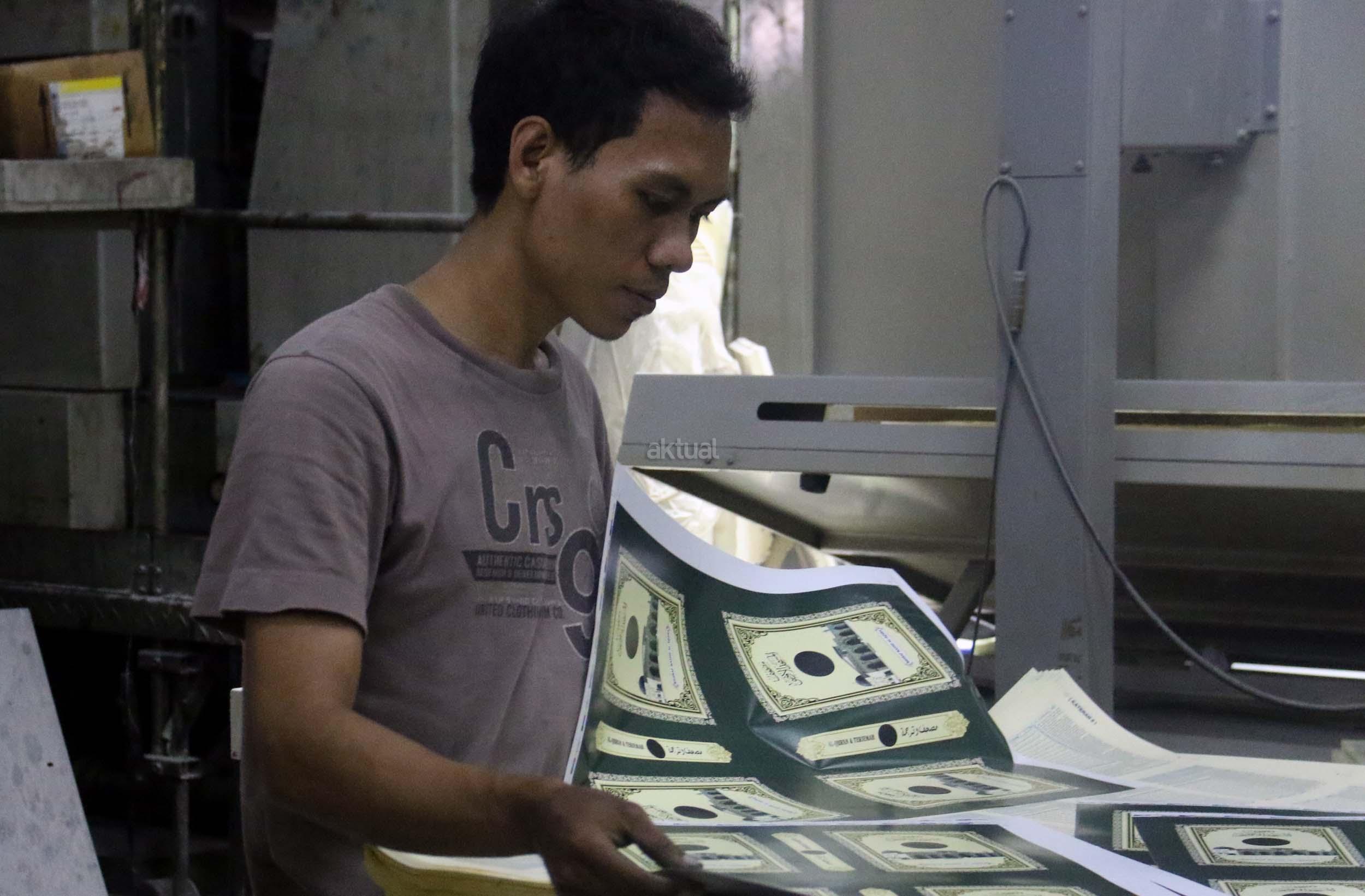 Pekerja memeriksa ketebalan warna huruf Al Quran yang dicetak di Jakarta, Jumat (13/1/2017). Kementerian Agama meminta agar penerbit dan percetakan lebih berhati-hati dalam mengontrol penanganan limbah Al Quran, sesuai dengan peraturan yang dikeluarkan Kementerian Agama, agar tidak ada lagi penyalahgunaan limbah kertas percetakan Al Quran. AKTUAL/Munzir