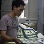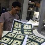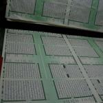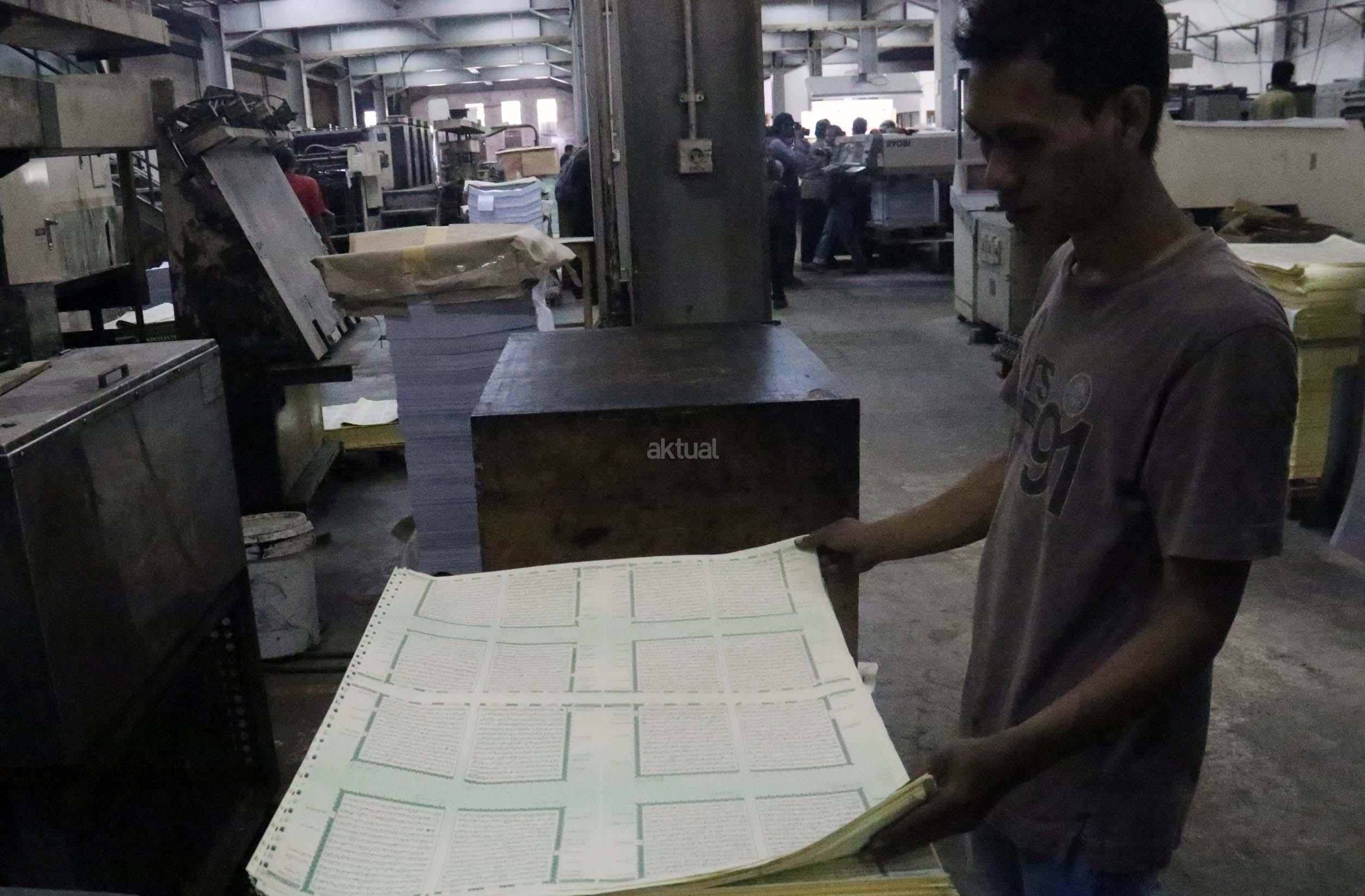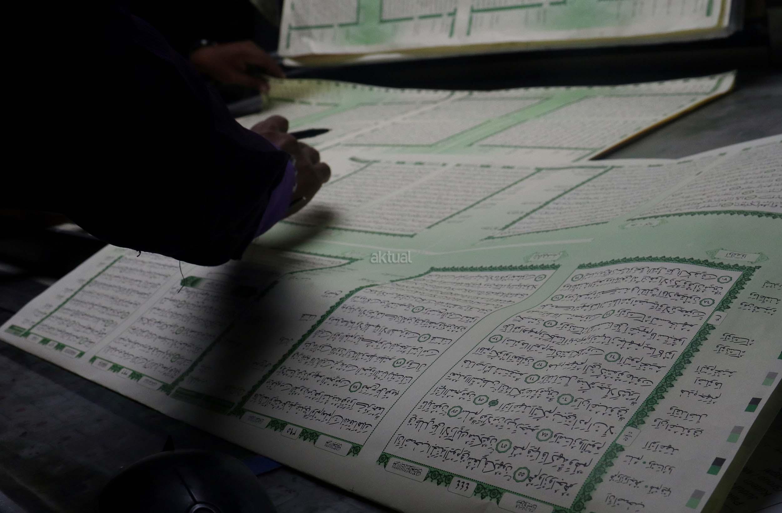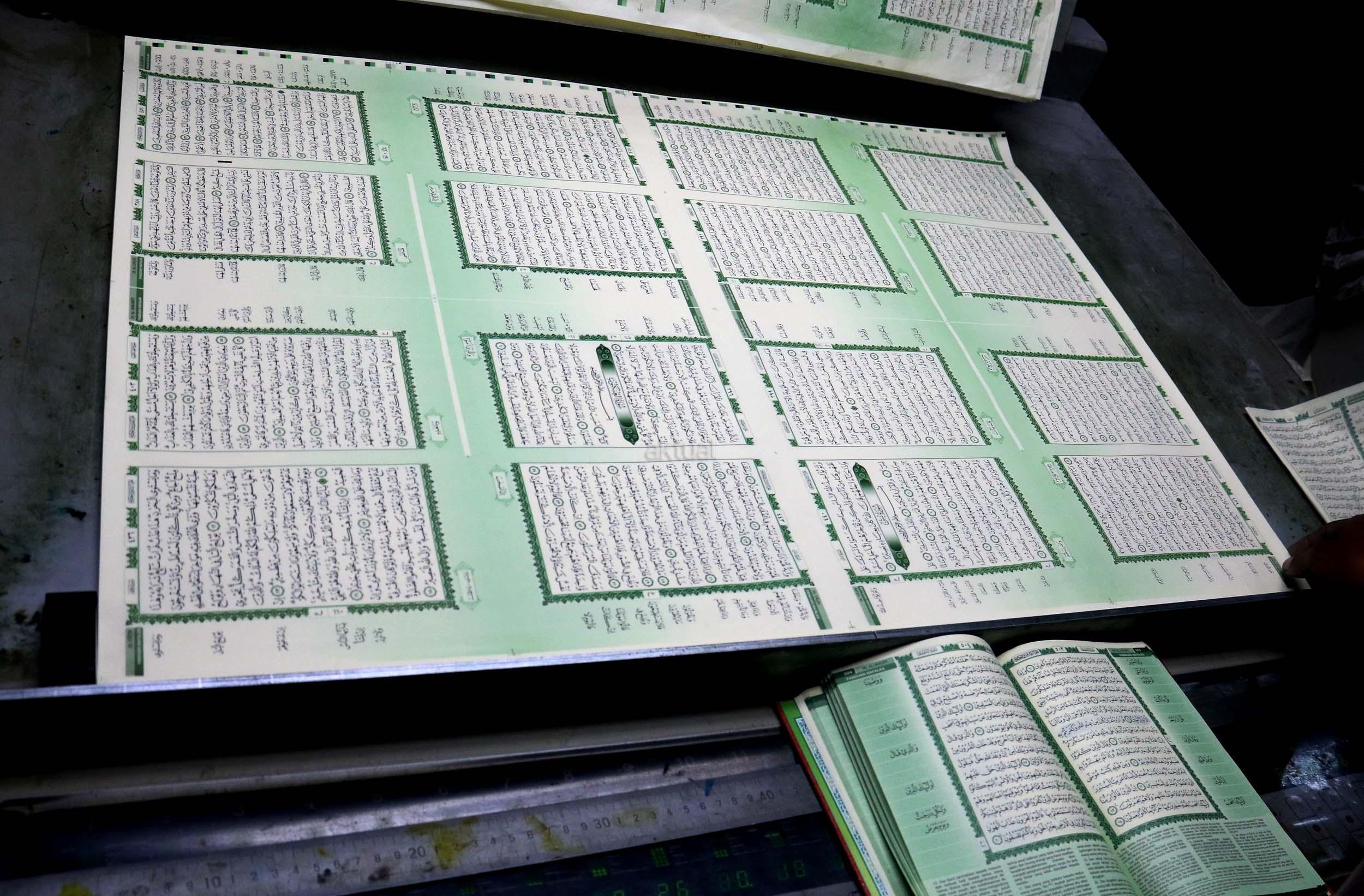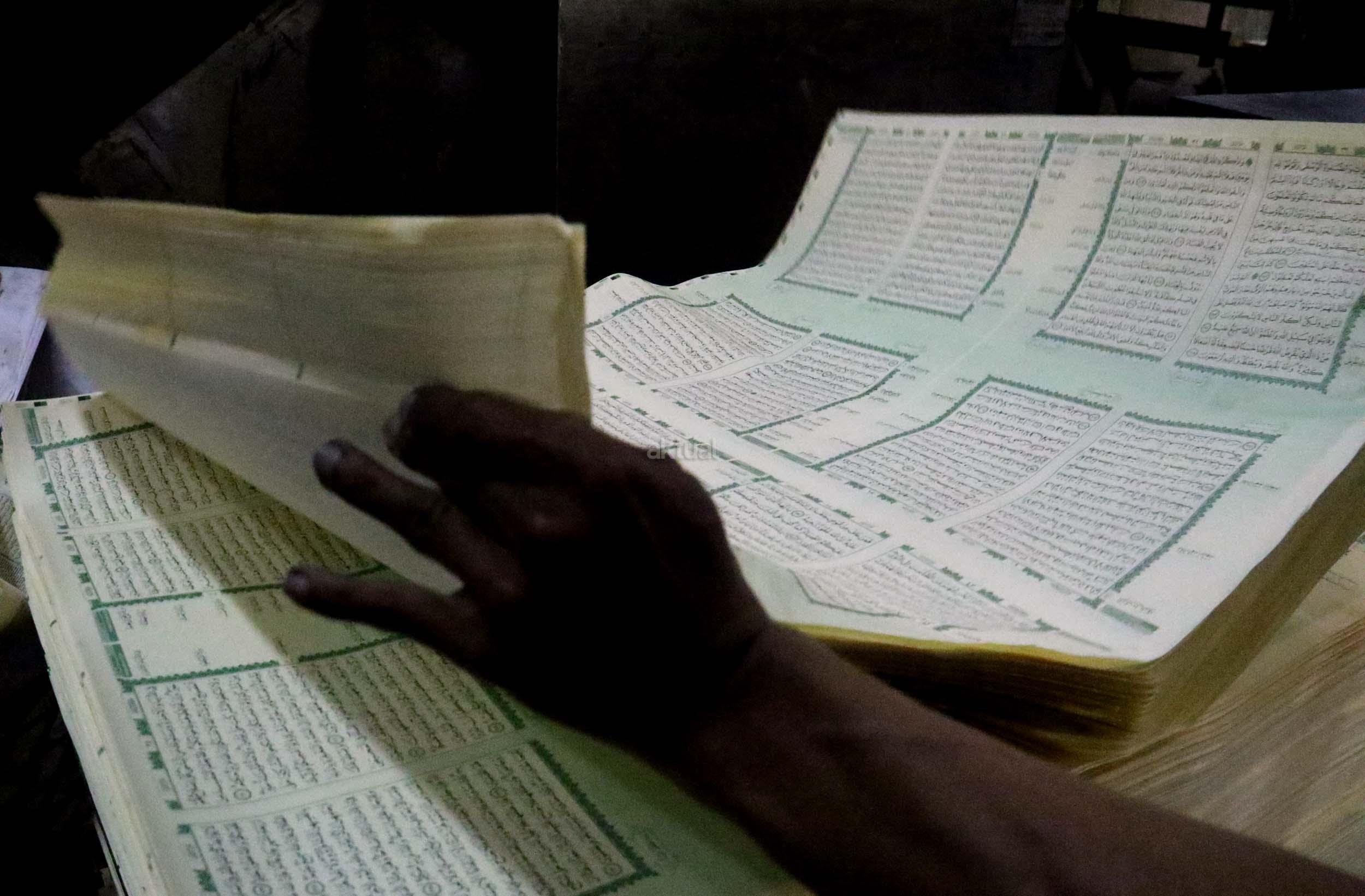 Pekerja memeriksa ketebalan warna huruf Al Quran yang dicetak di Jakarta, Jumat (13/1/2017). Kementerian Agama meminta agar penerbit dan percetakan lebih berhati-hati dalam mengontrol penanganan limbah Al Quran, sesuai dengan peraturan yang dikeluarkan Kementerian Agama, agar tidak ada lagi penyalahgunaan limbah kertas percetakan Al Quran. AKTUAL/Munzir