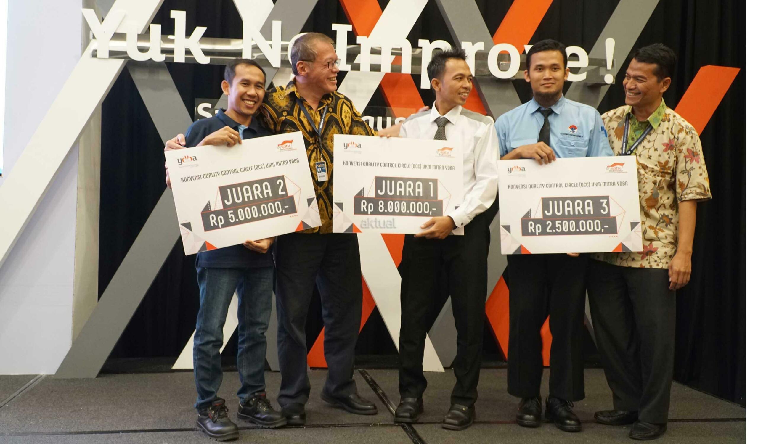 Ketua Pengurus YDBA Henry C. Widjaja (kedua kiri) bersama Sekretaris Pengurus YDBA Mohammad Iqbal (kedua dari kanan) menyerahkan hadiah ke pemenang pertama seusai Konvensi QCC (Quality Control Circle) UMKM Mitra YDBA di Indonesia Convention Exhibition,BSD City, Tangerang, Sabtu (12/8).Gelaran Konvensi QCC yang mengusung tema ” Yuk Ngimprove”dimaksudkan untuk mengajak UMKM menerapkan hal yang sederhana pada bisnis mereka.Dalam rangkaian kegiatannya Mitra UMKM ditantang untuk memaparkan kegiatan QCC yang telah dilakukan di masing masing perusahaan yang tentunya tak lepas dari pendampingan yang dilakukan YDBA. Melalui kegiatan ini, YDBA berharap agar UMKM Mitra dapat termotivasi untuk menerapkan dan memiliki daya saing yang tinggi untuk dapat berkompetisi di era yang semakin terbuka. AKTUAL/Eko S Hilman