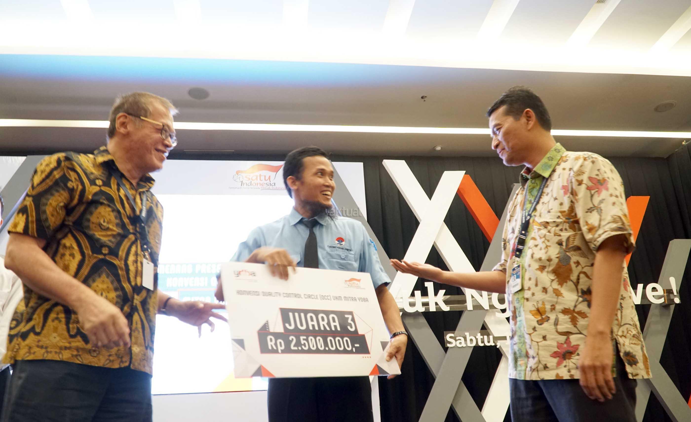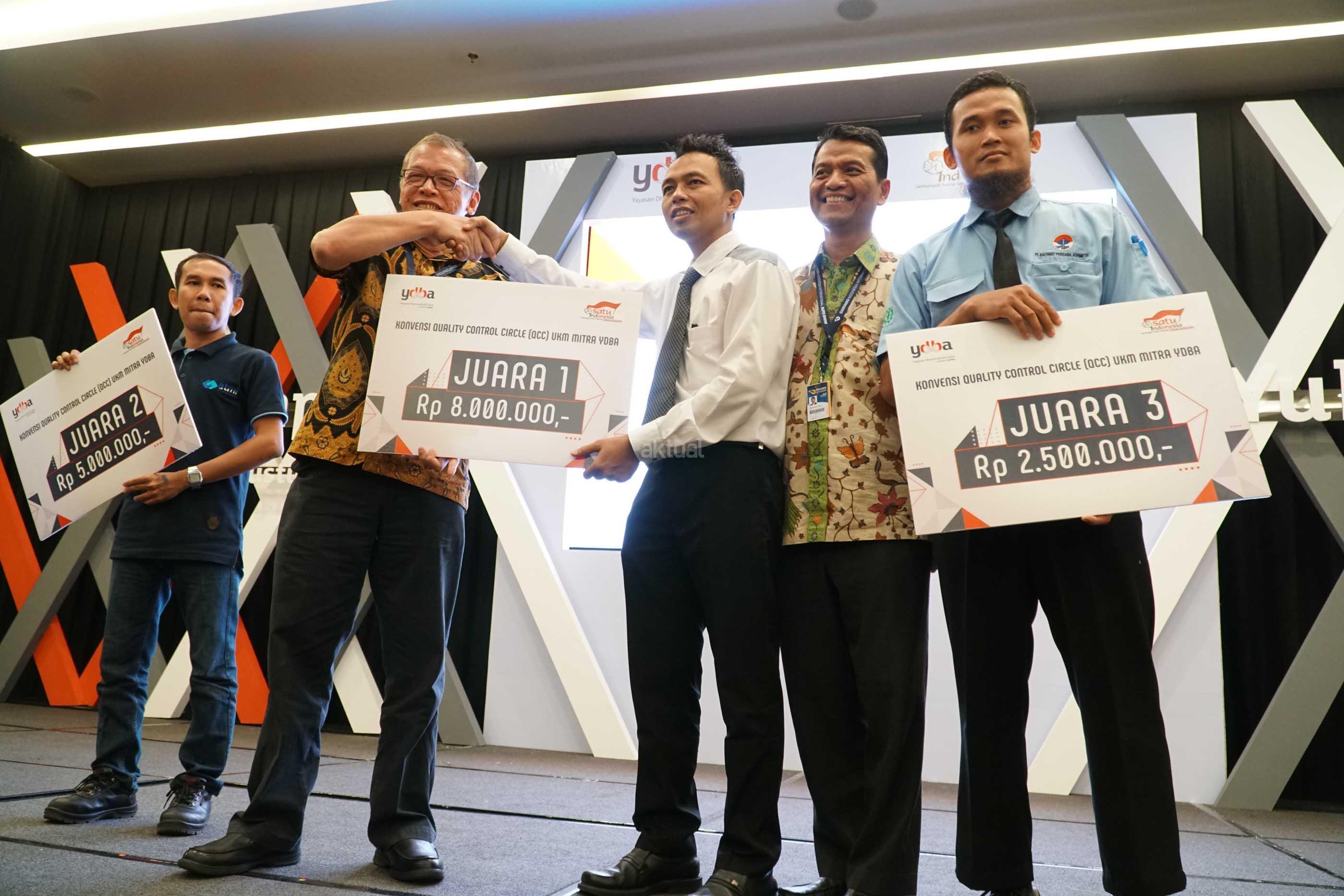 Ketua Pengurus YDBA Henry C. Widjaja (kedua kiri) bersama Sekretaris Pengurus YDBA Mohammad Iqbal ( kanan) menyerahkan hadiah ke pemenang pertama seusai Konvensi QCC (Quality Control Circle) UMKM Mitra YDBA di Indonesia Convention Exhibition,BSD City, Tangerang, Sabtu (12/8).Gelaran Konvensi QCC yang mengusung tema ” Yuk Ngimprove”dimaksudkan untuk mengajak UMKM menerapkan hal yang sederhana pada bisnis mereka.Dalam rangkaian kegiatannya Mitra UMKM ditantang untuk memaparkan kegiatan QCC yang telah dilakukan di masing masing perusahaan yang tentunya tak lepas dari pendampingan yang dilakukan YDBA. Melalui kegiatan ini, YDBA berharap agar UMKM Mitra dapat termotivasi untuk menerapkan dan memiliki daya saing yang tinggi untuk dapat berkompetisi di era yang semakin terbuka. AKTUAL/Eko S Hilman