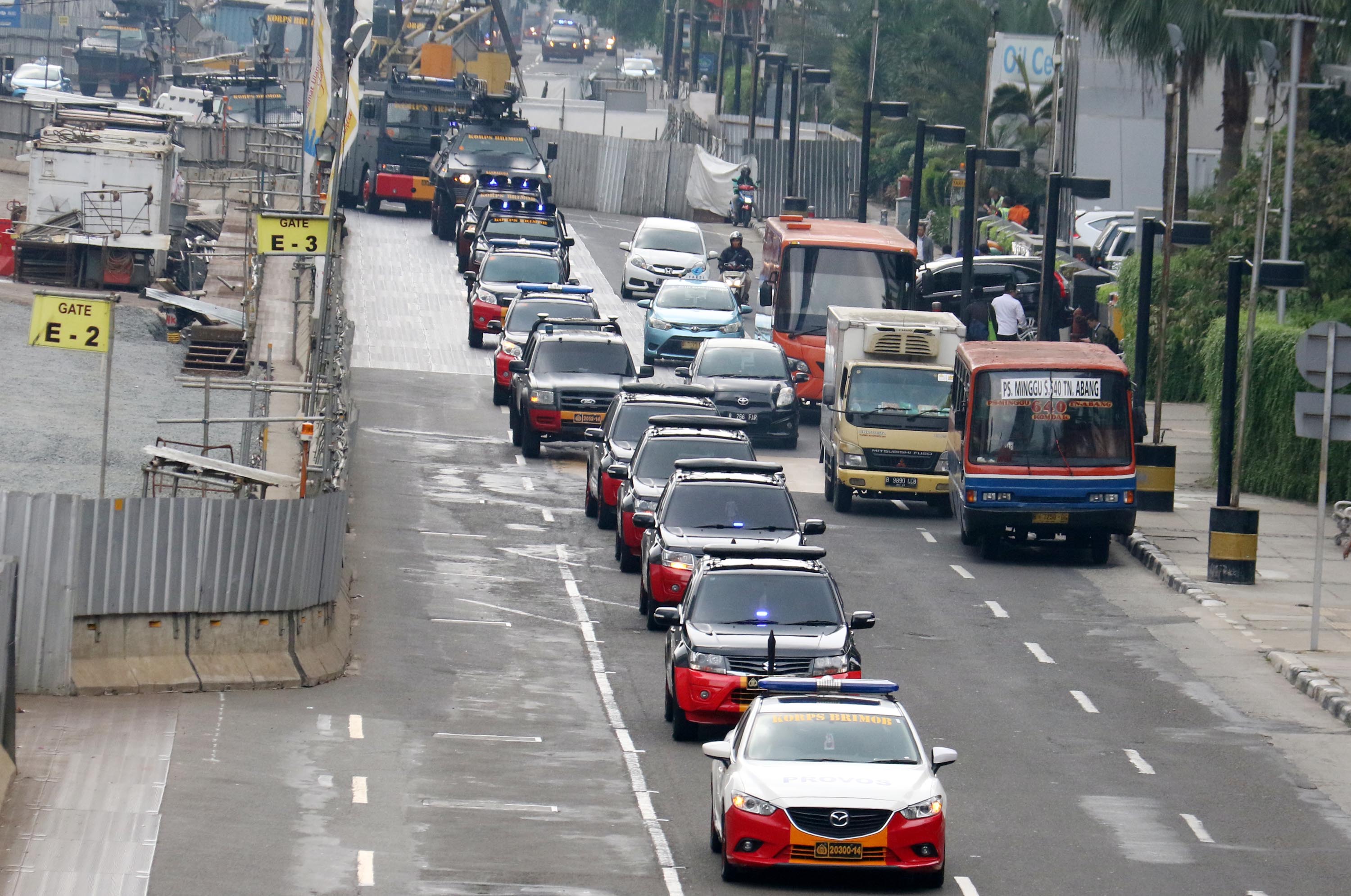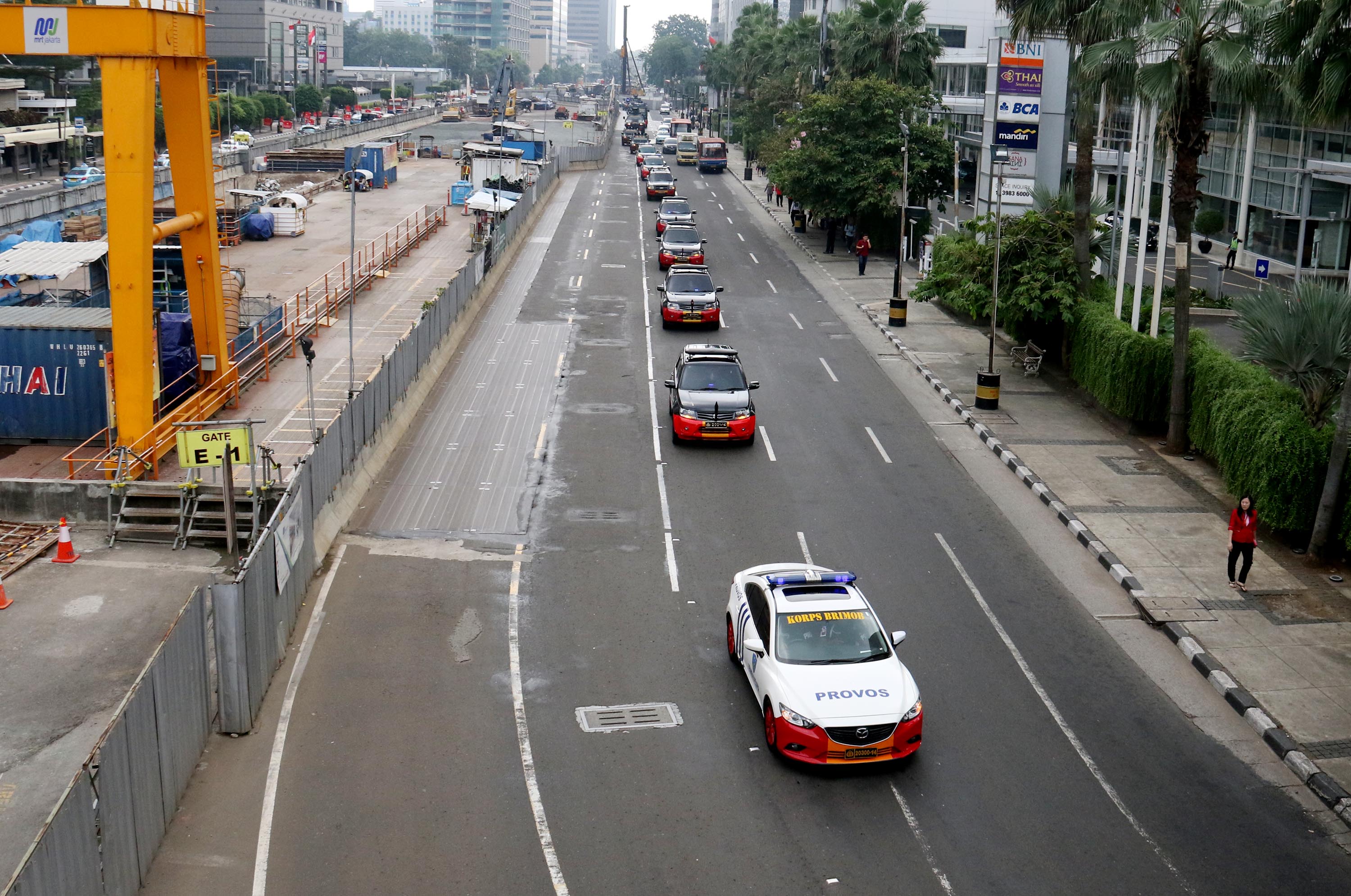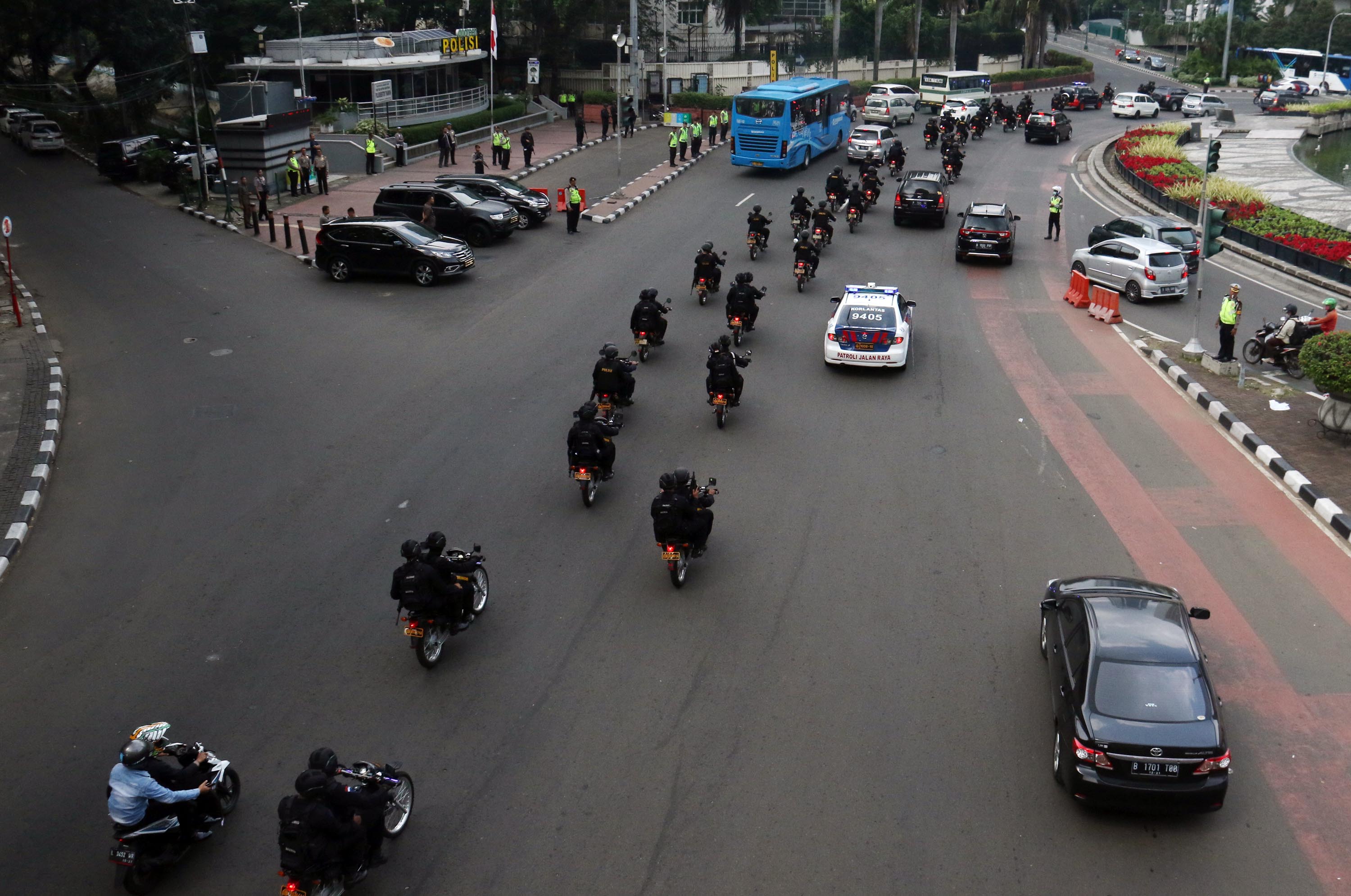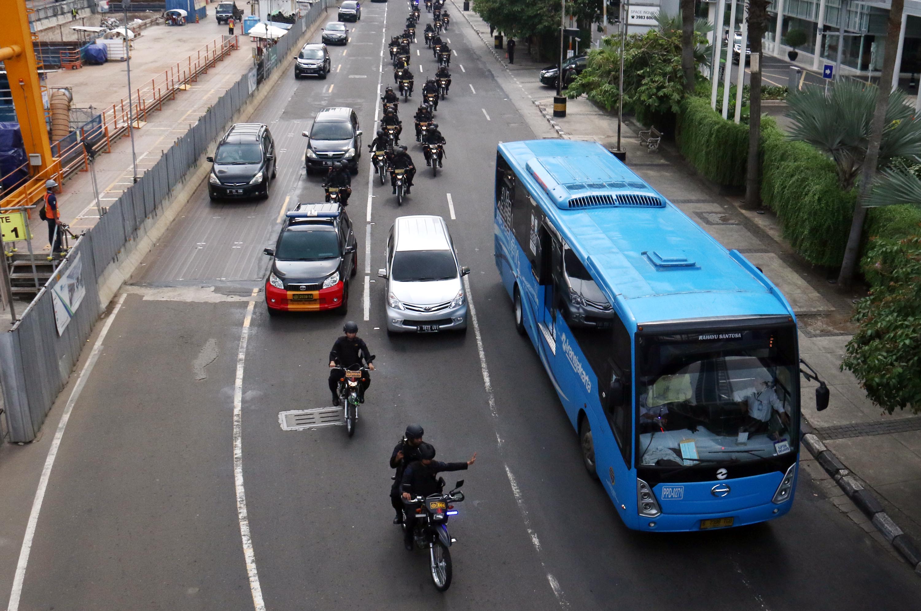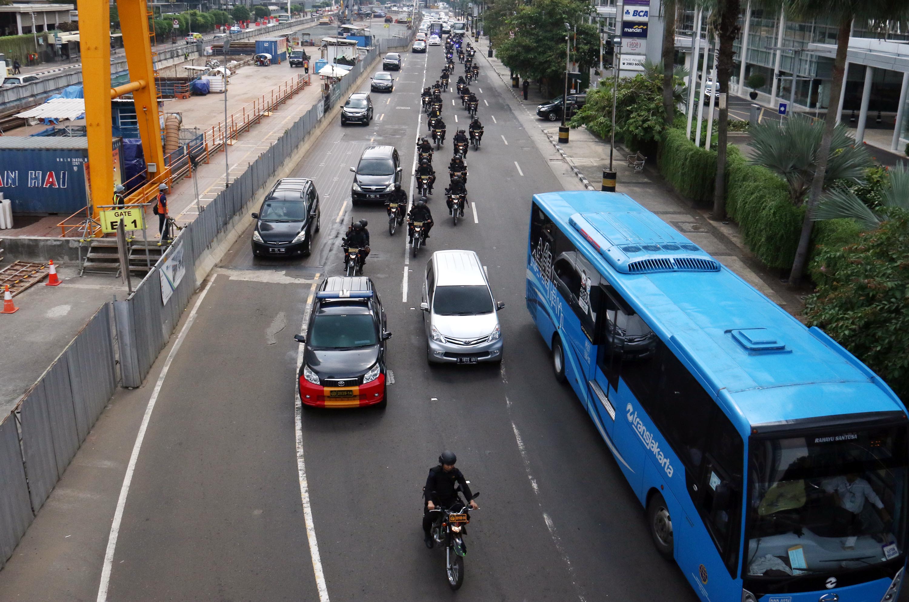 Terlihat Konvoi kendaraan bermotor Kepolisian usai mengikuti acara memperingati upacara hari Bhayangkara yang ke 71, melintas di Jalan. Thamrin, Jakarta, (10/7/2017). Upacara peringatan HUT Bhayangkara yang ke – 71, sebanyak 2.408 personel gabungan Polri, TNI, Satpol PP dan Pramuka terlibat dalam upacara ini. AKTUAL/Munzir