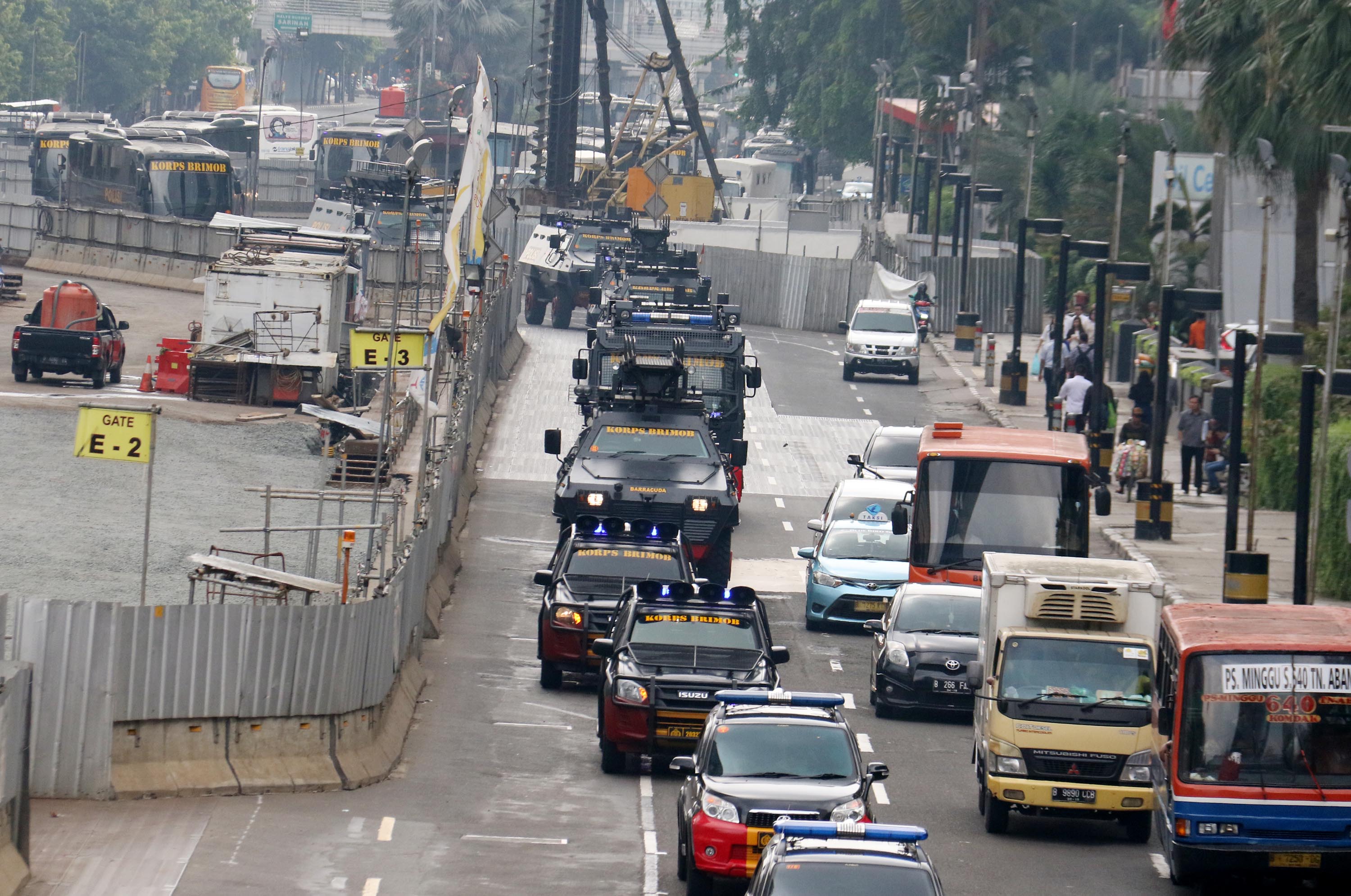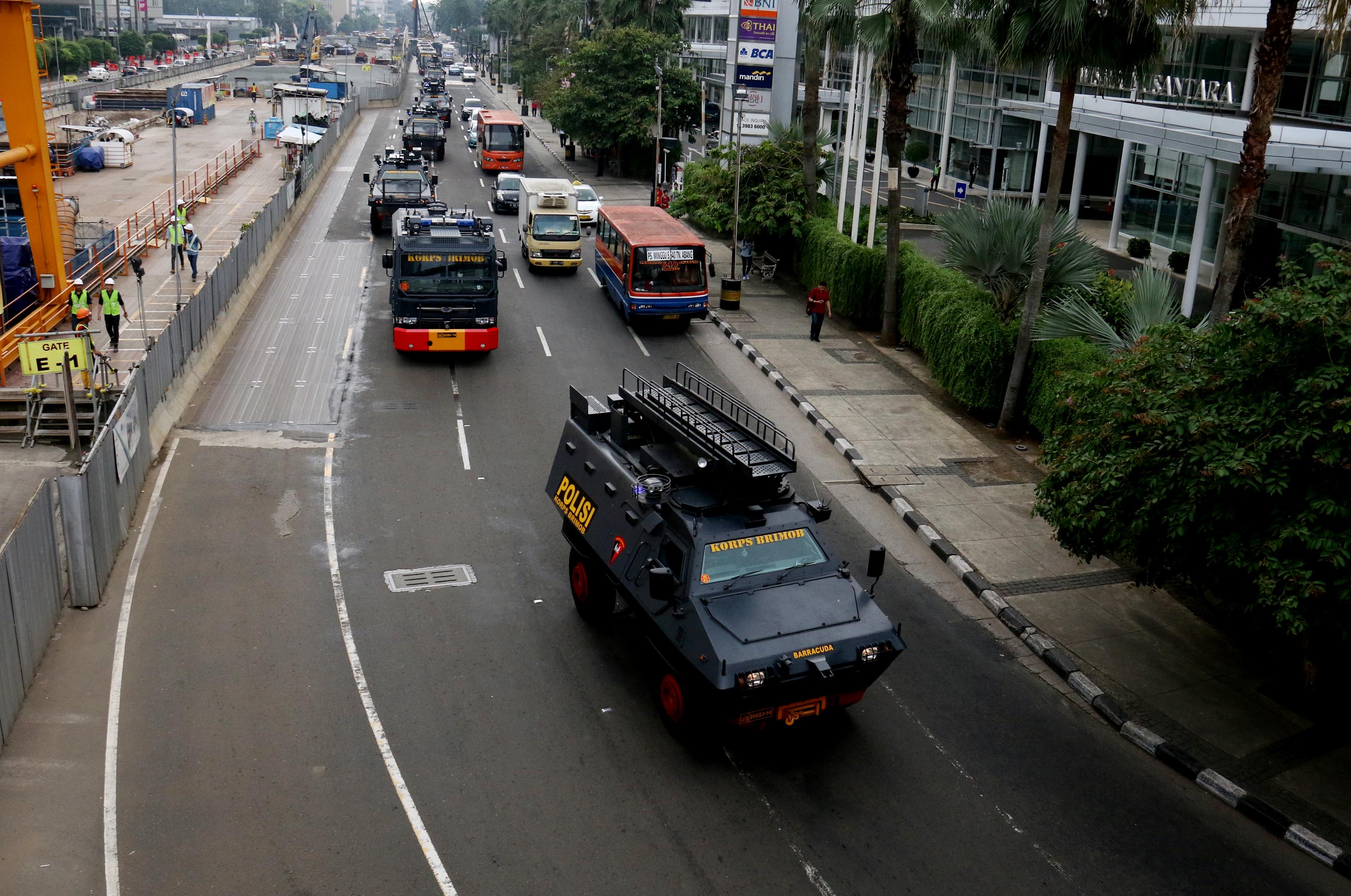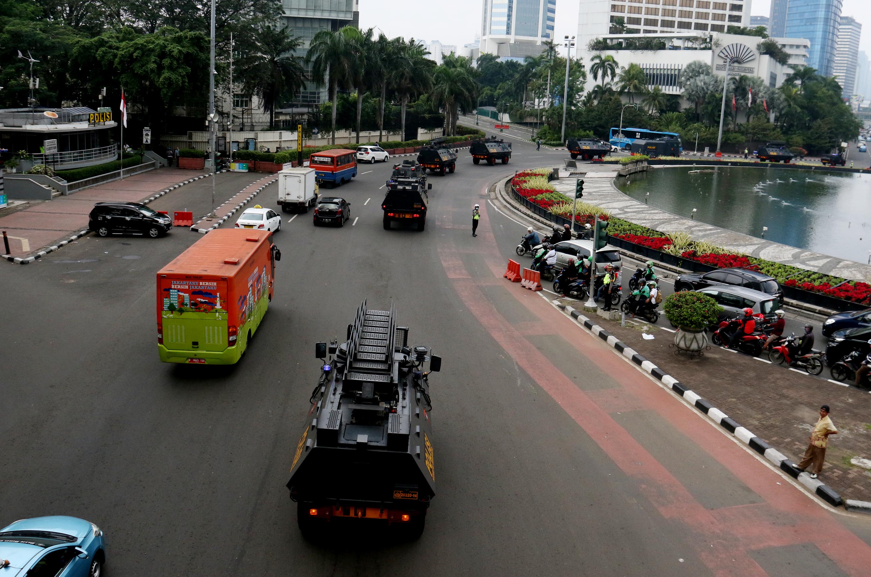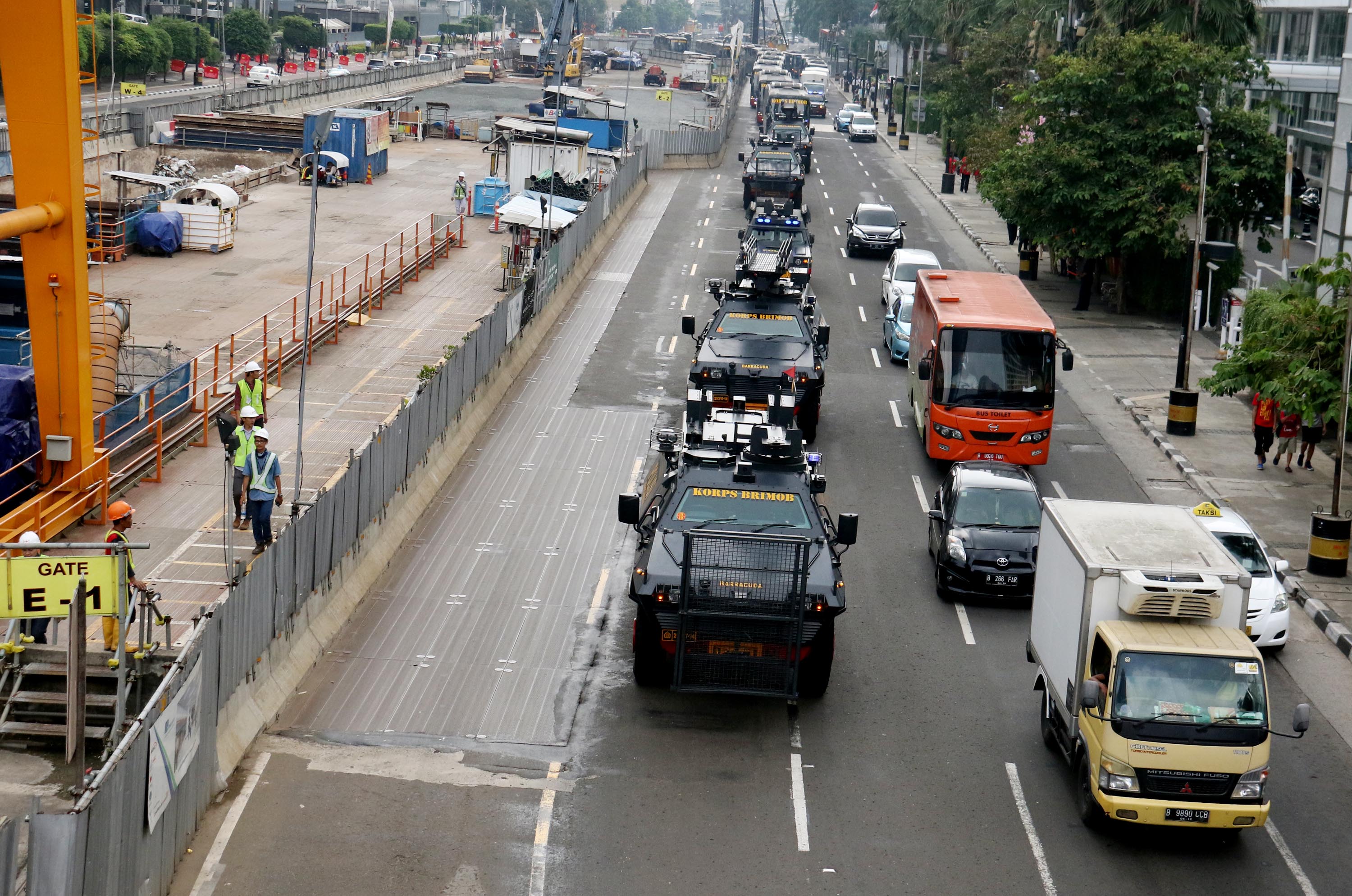 Terlihat Konvoi kendaraan Taktis Kepolisian usai mengikuti acara memperingati upacara hari Bhayangkara yang ke 71, melintas di Jalan. Thamrin, Jakarta, (10/7/2017). Upacara peringatan HUT Bhayangkara yang ke – 71, sebanyak 2.408 personel gabungan Polri, TNI, Satpol PP dan Pramuka terlibat dalam upacara ini. AKTUAL/Munzir