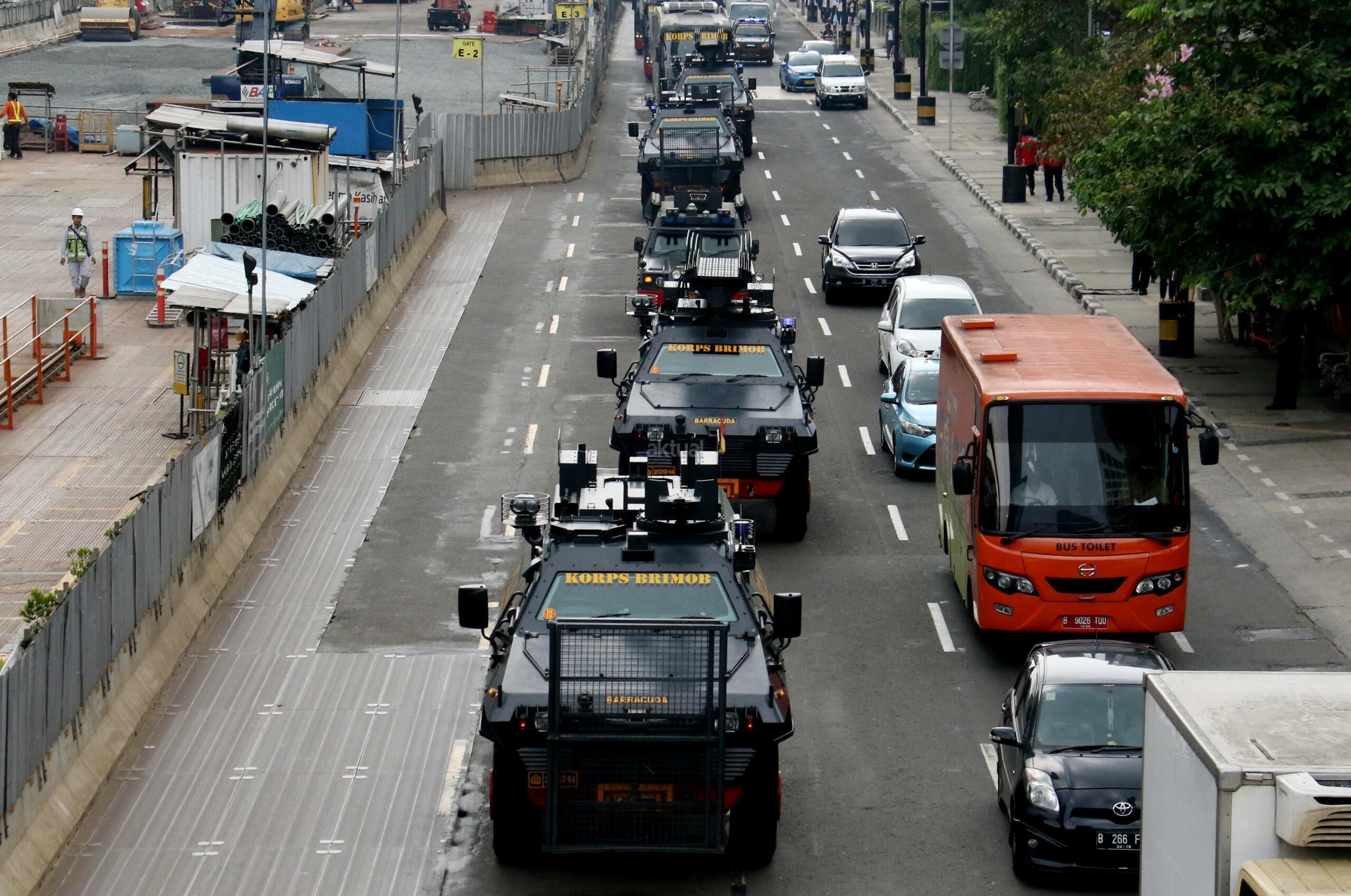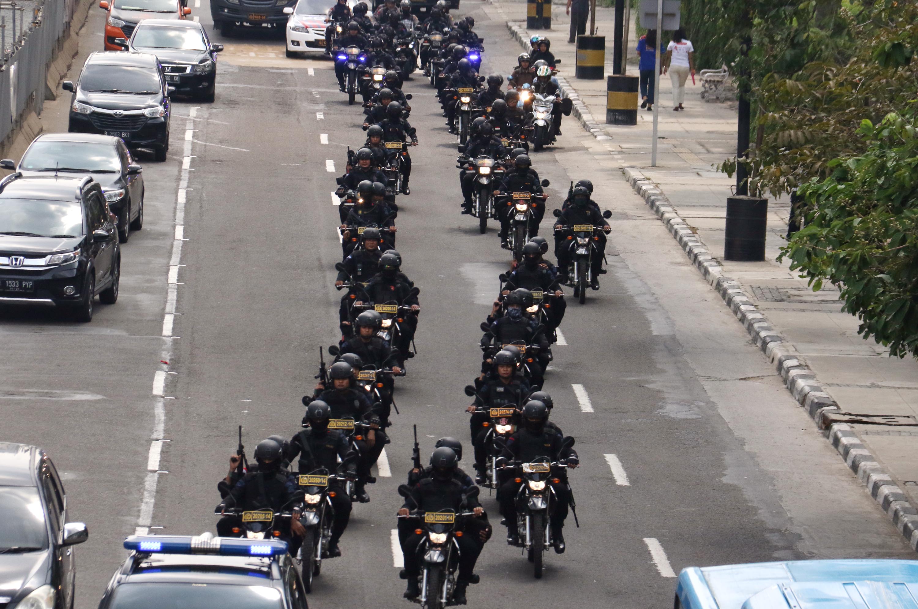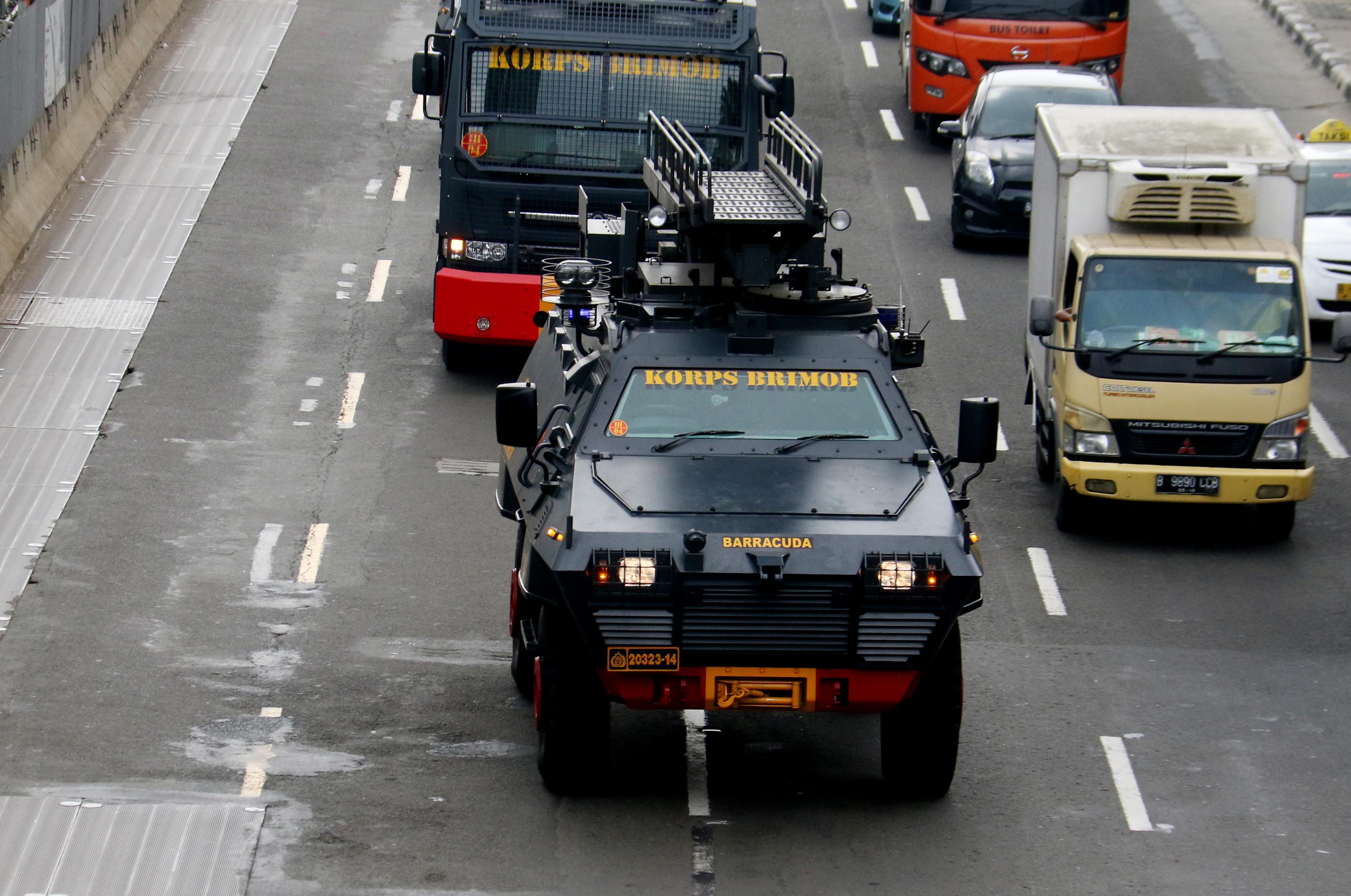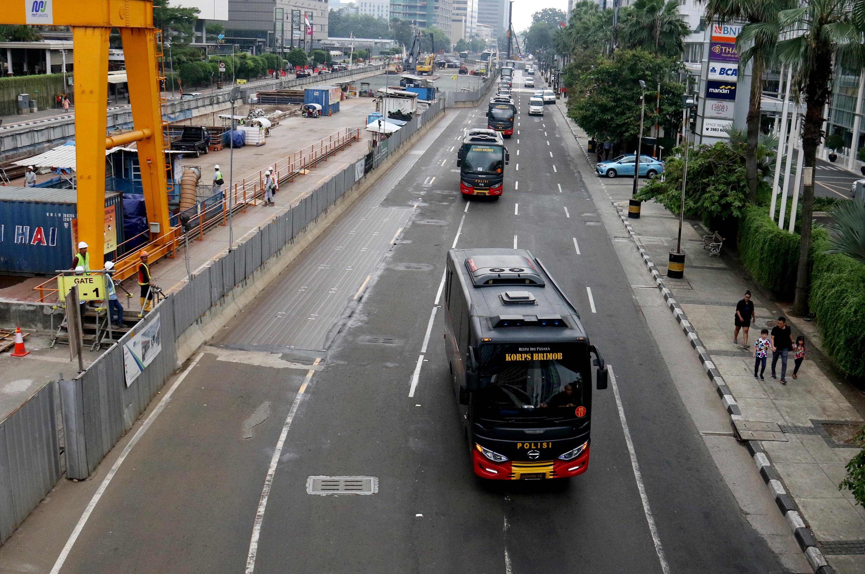 Terlihat Konvoi kendaraan Taktis Kepolisian usai mengikuti acara memperingati upacara hari Bhayangkara yang ke 71, melintas di Jalan. Thamrin, Jakarta, (10/7/2017). Upacara peringatan HUT Bhayangkara yang ke – 71, sebanyak 2.408 personel gabungan Polri, TNI, Satpol PP dan Pramuka terlibat dalam upacara ini. AKTUAL/Munzir