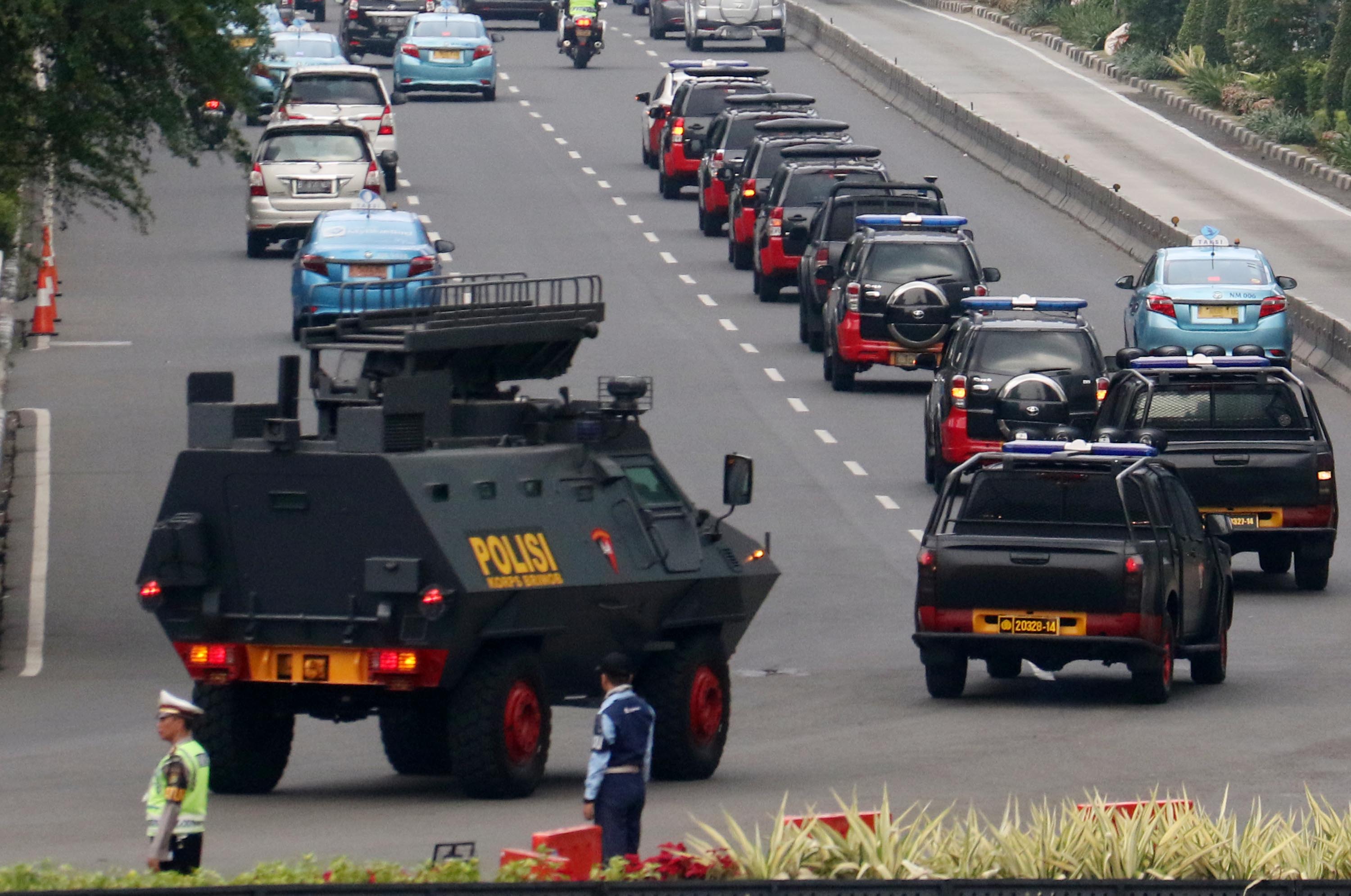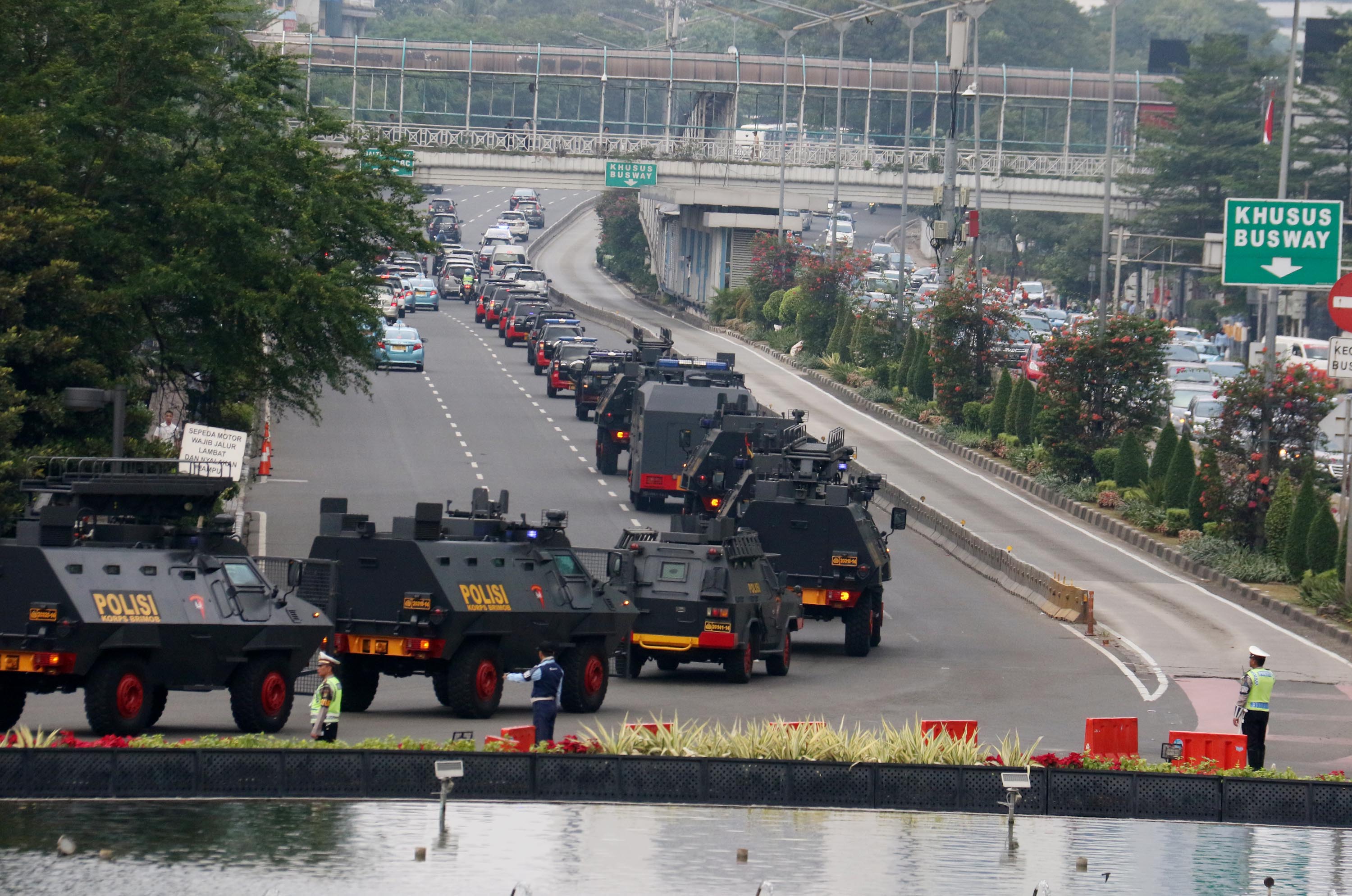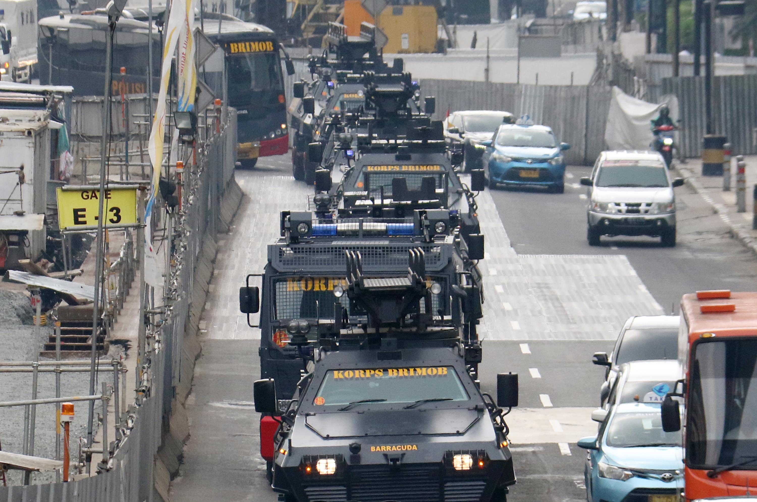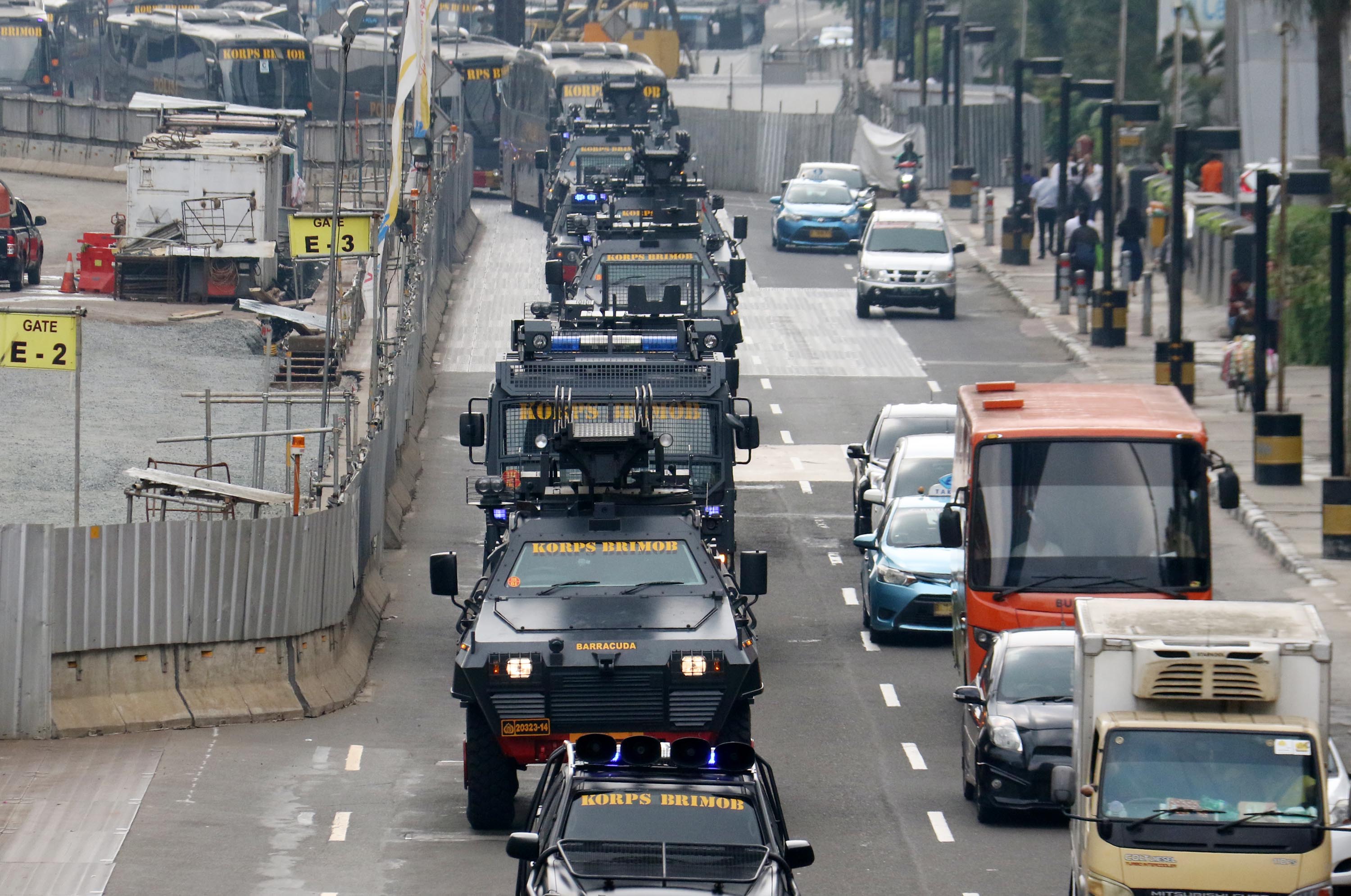 Terlihat Konvoi kendaraan Taktis Kepolisian usai mengikuti acara memperingati upacara hari Bhayangkara yang ke 71, melintas di Jalan. Thamrin, Jakarta, (10/7/2017). Upacara peringatan HUT Bhayangkara yang ke – 71, sebanyak 2.408 personel gabungan Polri, TNI, Satpol PP dan Pramuka terlibat dalam upacara ini. AKTUAL/Munzir