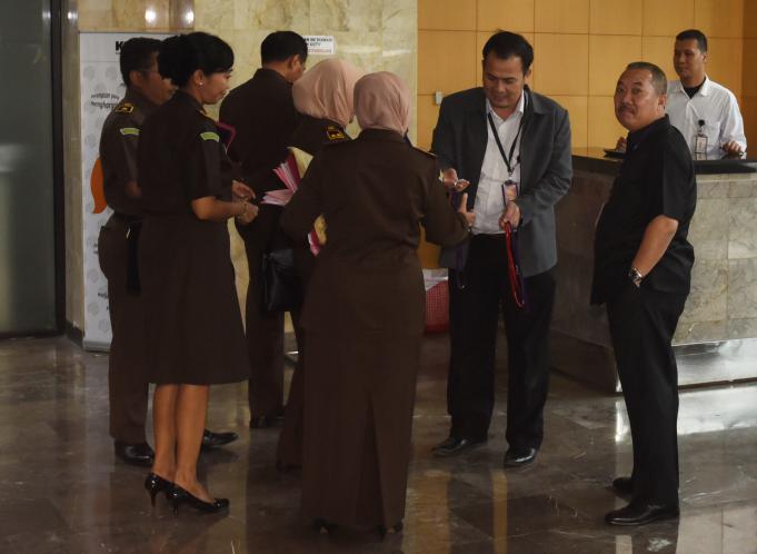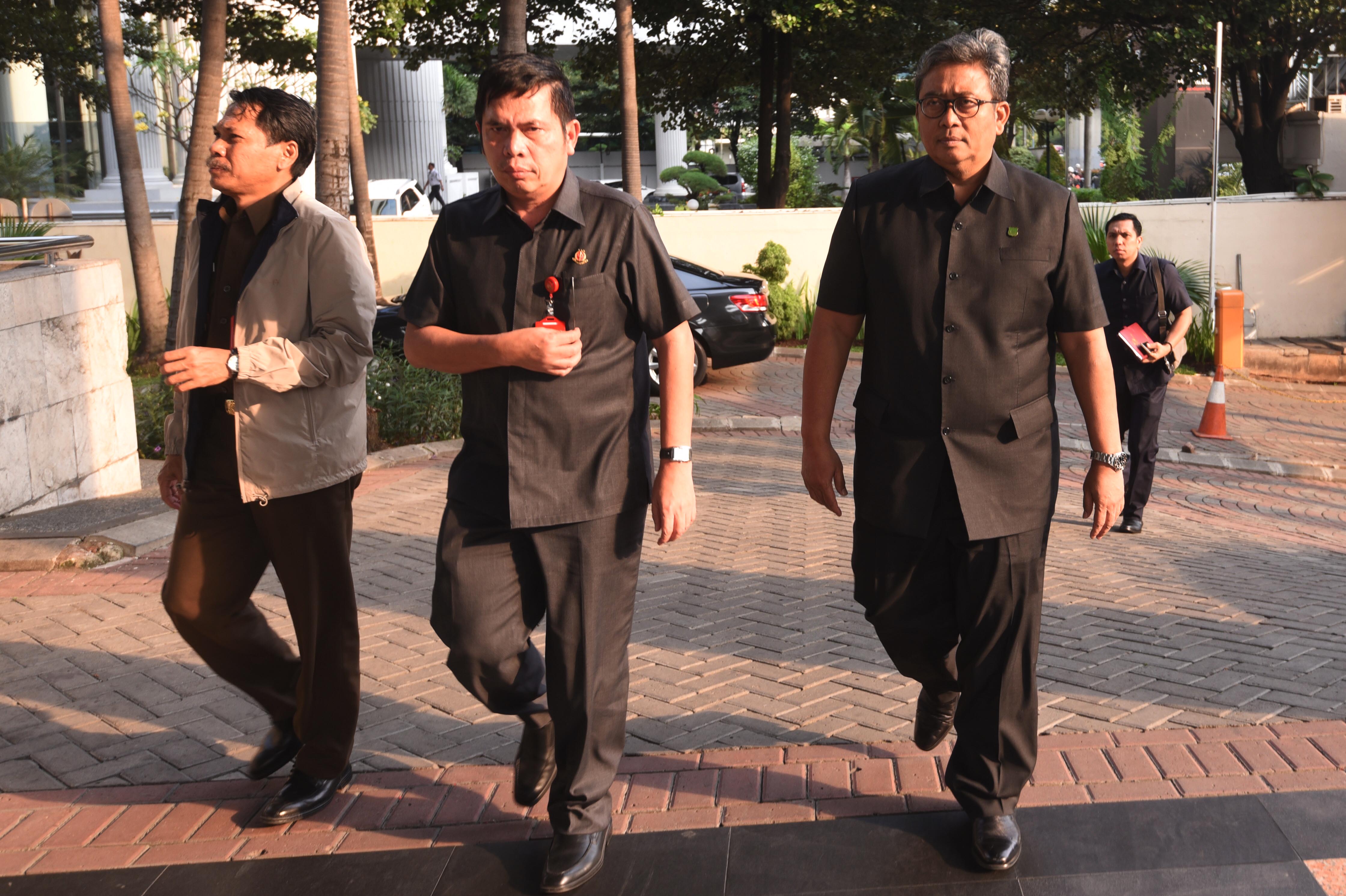 Jaksa Agung Muda Pidana Khusus Arminsyah (kanan) mendatangi Gedung KPK di Jakarta, Selasa (20/6). Kedatangan Arminsyah yang didampingi tim Kejati Jawa Timur bertujuan untuk berkoordinasi dengan KPK terkait kasus dugaan korupsi La Nyalla Matalitti. ANTARA FOTO/Akbar Nugroho Gumay/pd/16