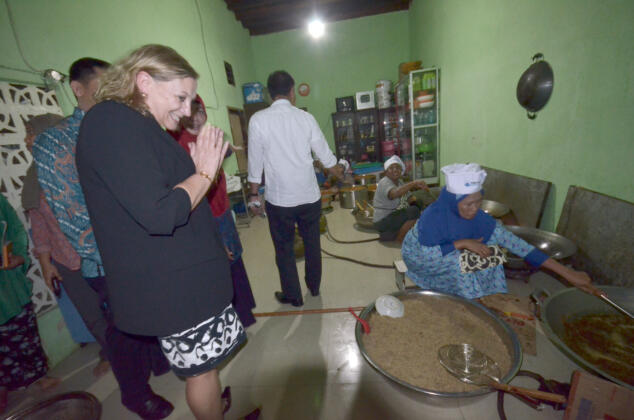 Wakil Duta Besar dan Konsulat Jenderal Kedutaan Besar Inggris, Juliet Maric Capeling OBE (kiri) menyapa ibu-ibu pekerja abon ikan tuna di Koperasi Kelompok Wanita Nelayan (KWN) Fatimah Az Zahra, Pattingaloang, Ujung Tanah, Makassar, Sulawesi Selatan, Rabu (18/5). Koperasi dan wirausaha sosial yang memproduksi berbagai olahan hasil laut itu memberdayakan sekitar 600 wanita yang terdiri dari isteri nelayan, korban kekerasan dalam rumah tangga serta lansia untuk meningkatkan daya ekonomi keluarga mereka di mana produk koperasi tersebut telah di pasarkan ke sejumlah kota seperti Aceh, Palembang, Surabaya, Banjarmasin dan Sorong. ANTARA FOTO/Dewi Fajriani/pd/16