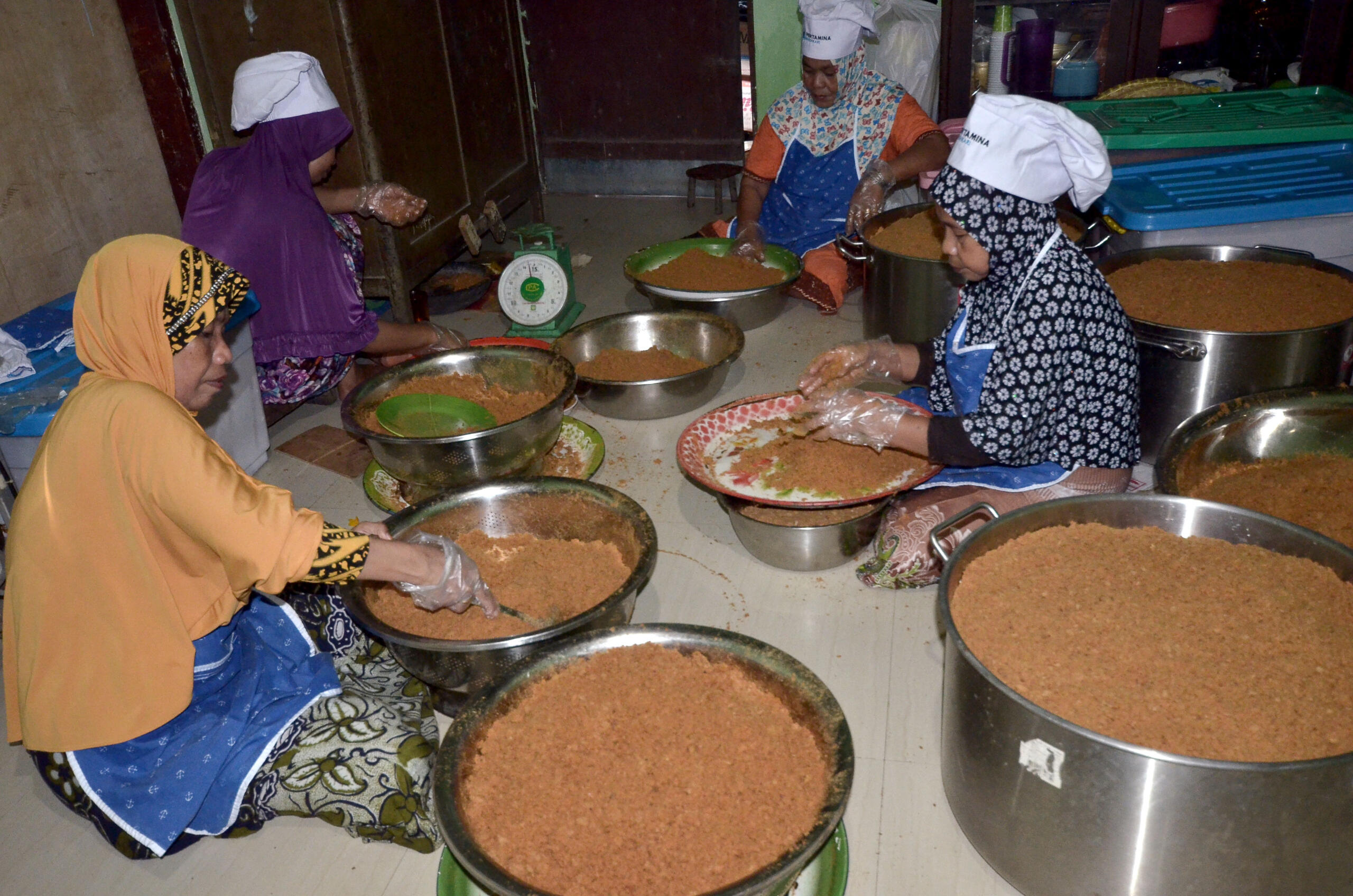 Ibu-ibu pekerja membersihkan abon ikan tuna dari duri nya sebelum di kemas di Koperasi Kelompok Wanita Nelayan (KWN) Fatimah Az Zahra, Pattingaloang, Ujung Tanah, Makassar, Sulawesi Selatan, Rabu (18/5). Koperasi dan wirausaha sosial yang memproduksi berbagai olahan hasil laut itu memberdayakan sekitar 600 wanita yang terdiri dari isteri nelayan, korban kekerasan dalam rumah tangga serta lansia untuk meningkatkan daya ekonomi keluarga mereka di mana produk koperasi tersebut telah di pasarkan ke sejumlah kota seperti Aceh, Palembang, Surabaya, Banjarmasin dan Sorong. ANTARA FOTO/Dewi Fajriani/pd/16