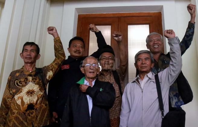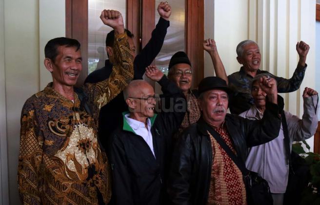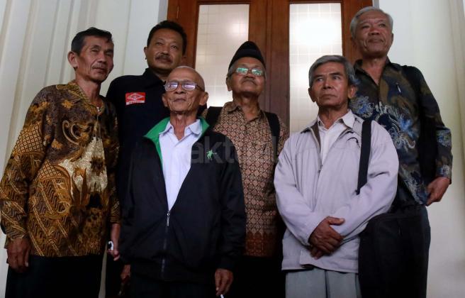 (dari kanan, baris depan) Legini, Saunar Ahmad, Kusnendar, Sudarno, (baris belakang) Bedjo Untung, Zubaidiah Hasan, Handoyo yang merupakan anggota dari Yayasan Penelitian Korban Pembunuhan (YPKP) 1965/1966 usai bertemu dengan Menkopolhukam di Kemenkopolhukam, Jakarta, Senin (9/5). YPKP menyerahkan rangkuman dokumen kuburan massal korban tragedi 1965 kepada Menkopolhukam.