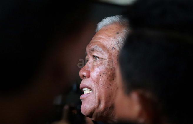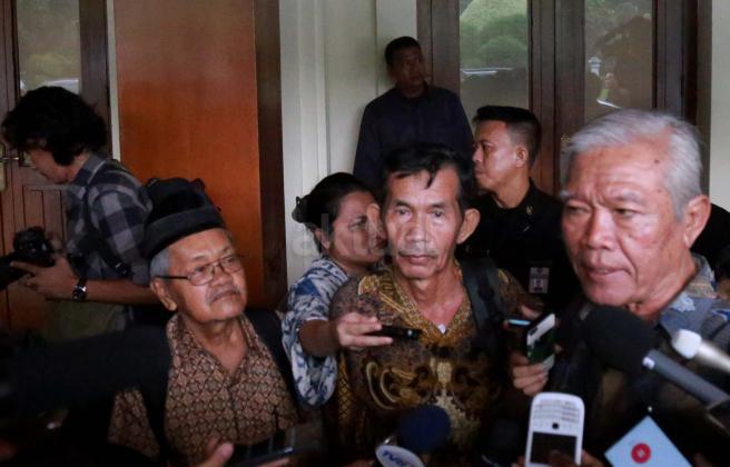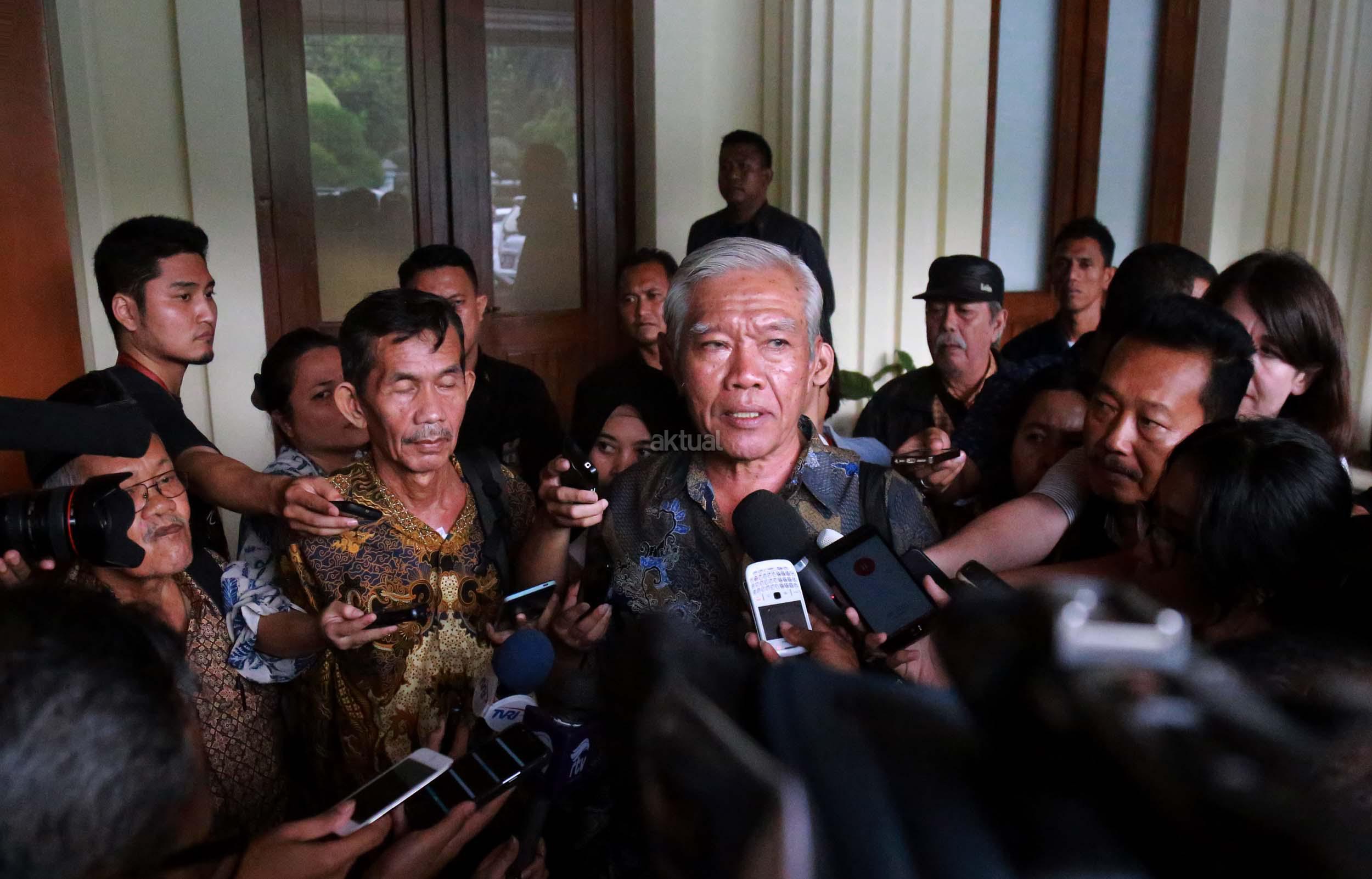 Sudarno dari Yayasan Penelitian Korban Pembunuhan (YPKP) 1965/1966 memberi keterangan pers usai bertemu dengan Menkopolhukam di Kemenkopolhukam, Jakarta, Senin (9/5/2016). YPKP menyerahkan rangkuman dokumen kuburan massal korban tragedi 1965 kepada Menkopolhukam Luhut Pandjaitan.