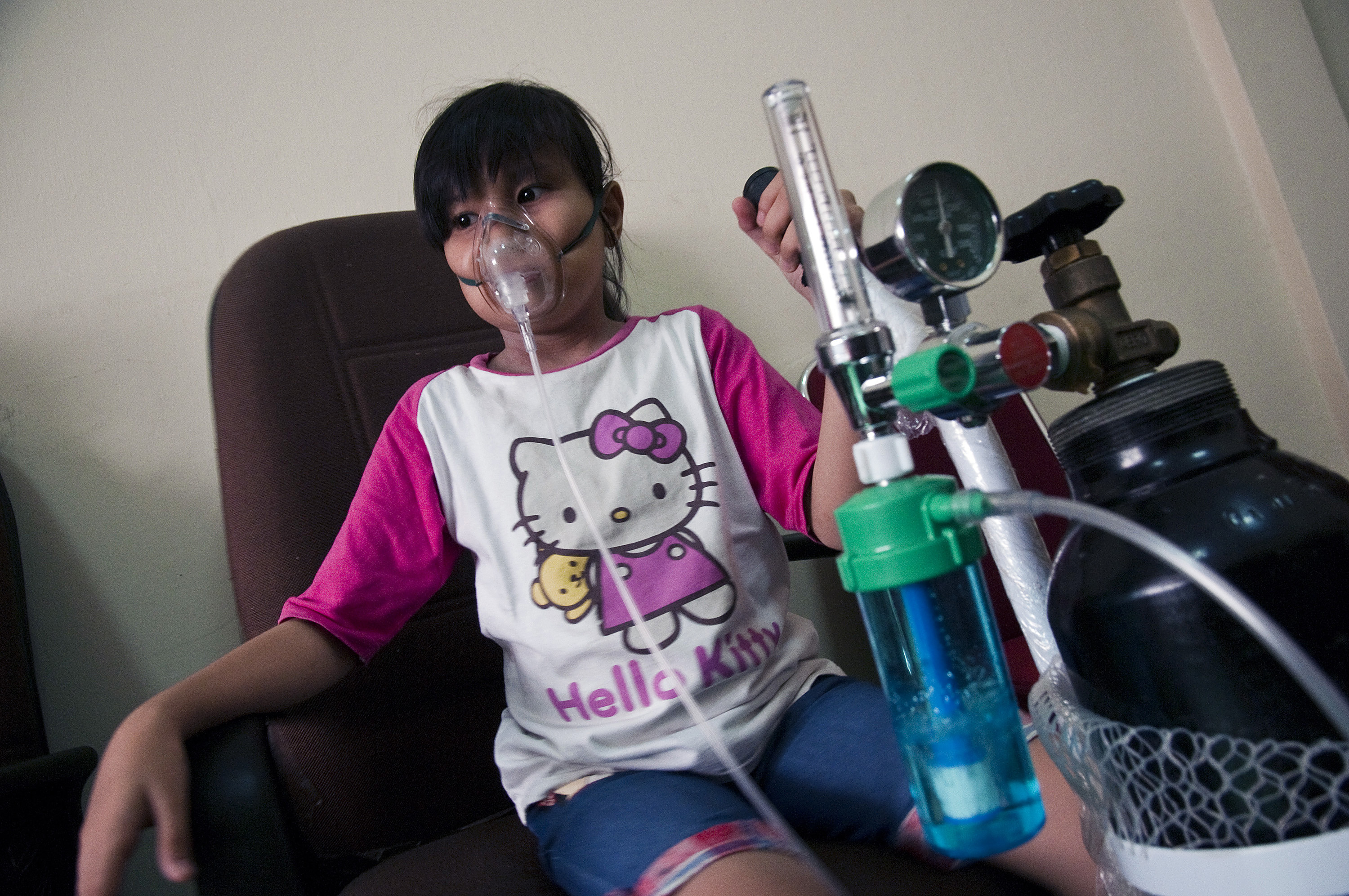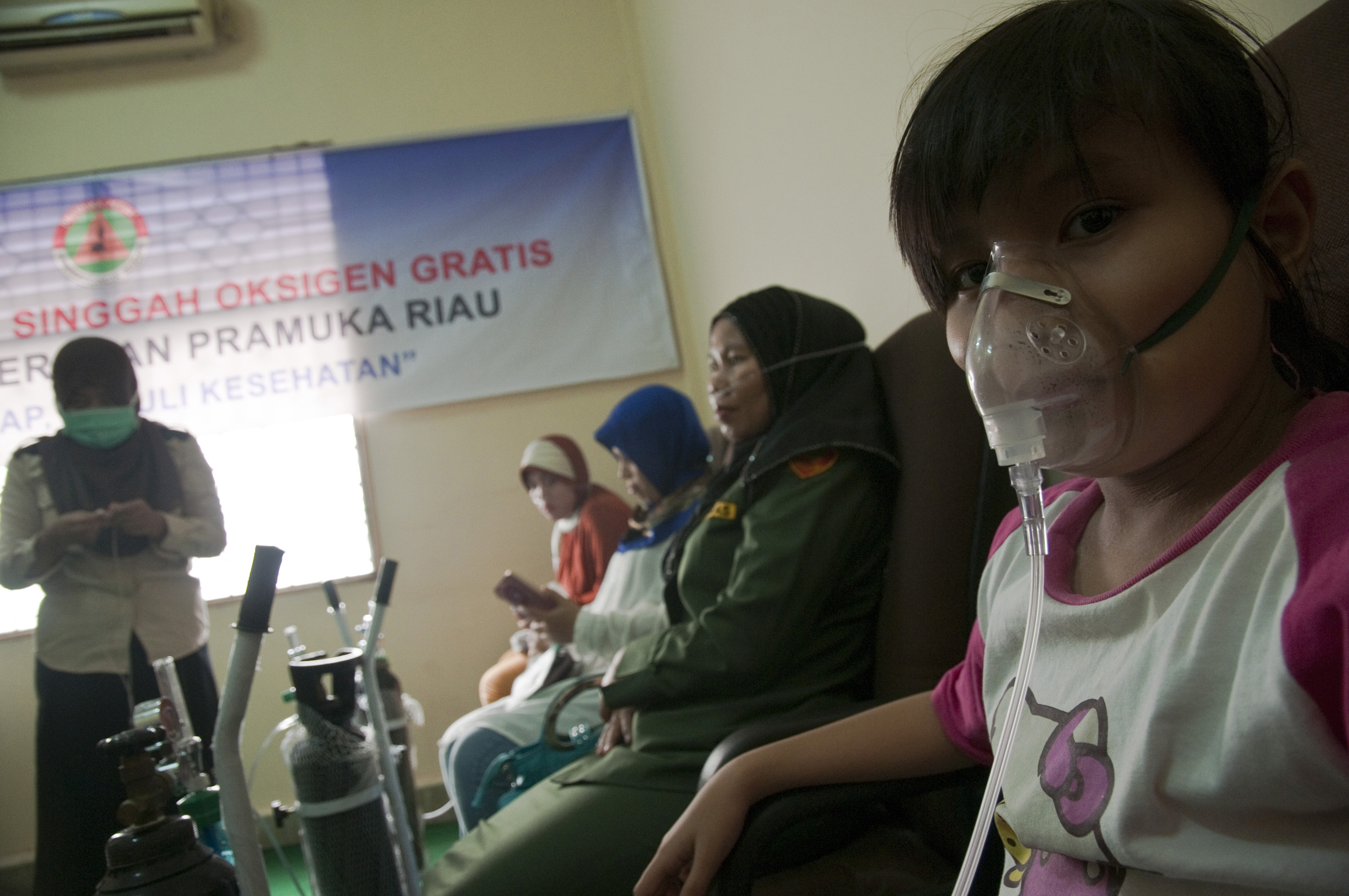 Seorang anak berusia 10 tahun bernama Nanda menghirup oksigen dari tabung yang disediakan secara gratis di "Rumah Singgah Oksigen" di Kantor Pramuka Riau, di Kota Pekanbaru, Senin (26/10).  Badan Nasional Penanggulangan Bencana (BNPB) menyatakan jumlah korban akibat dampak kabut asap kebakaran lahan dan hutan terus bertambah ditandai dengan 10 orang tewas di Sumatera dan Kalimantan, baik dampak langsung dan tidak langsung, serta menyebabkan 503.874 orang menderita Infeks Salura Pernafasan Akut (ISPA)  di enam provinsi sejak 1 Juli-23 Oktober 2015. ANTARA FOTO/FB Anggoro/foc/15.