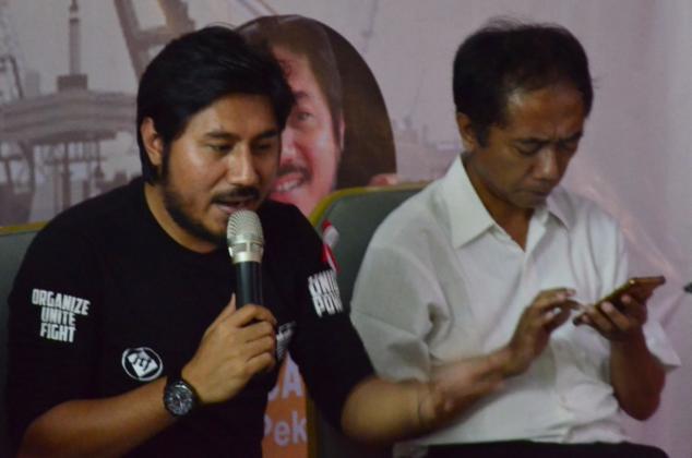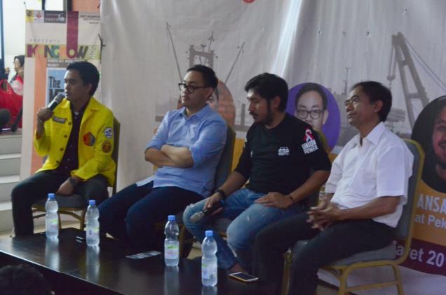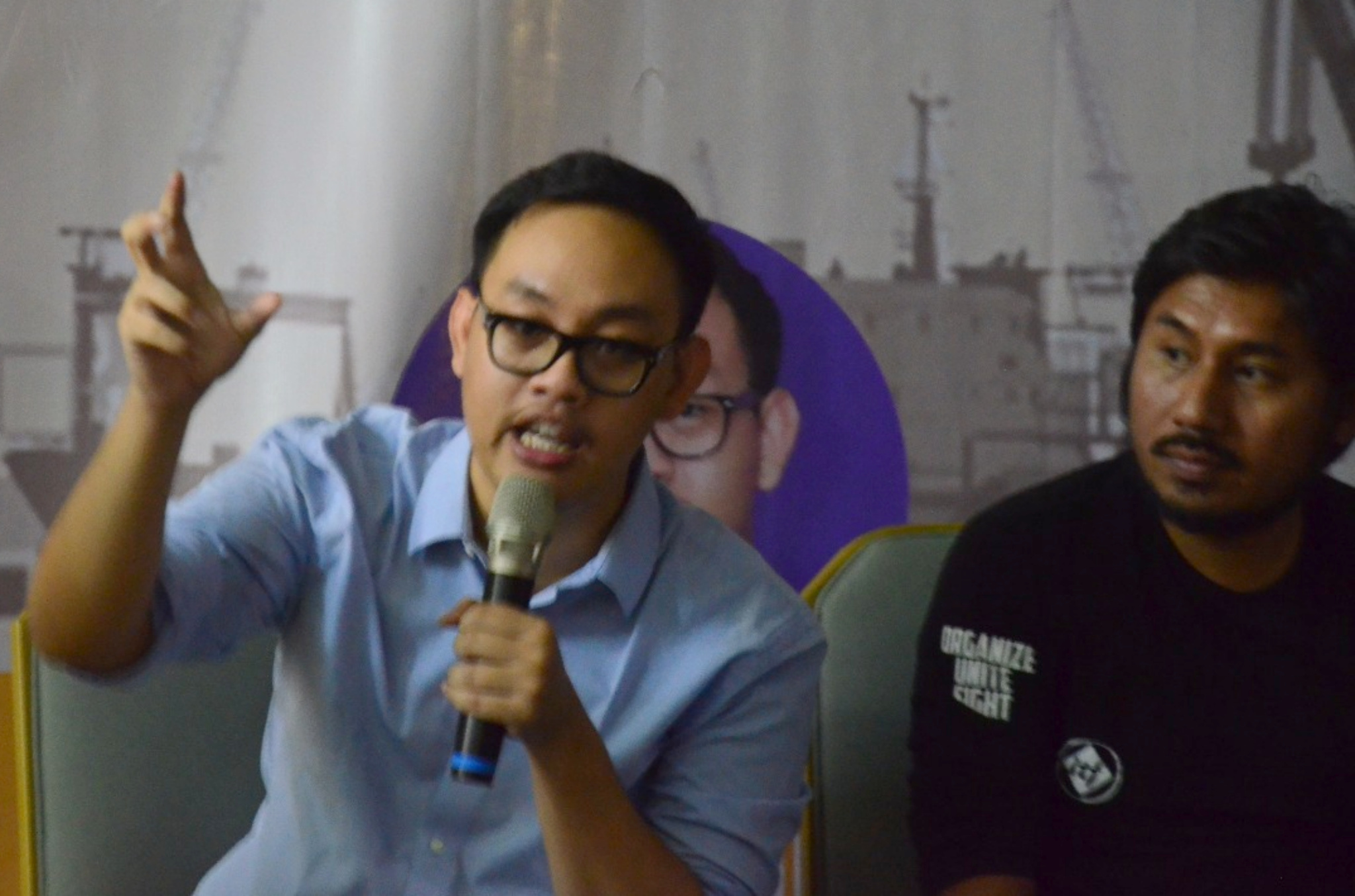 Deputi Serikat Pekerja JICT Suryansyah, Peneliti Indonesia Corruption Watch (ICW) Laits Abid saat diskusi Korupsi Privatisasi JICT Jilid II (2015 - 2019), ‘nyata atau Isu?’, di UI, Depok, Jawa Barat Kamis (21/3/2019). Mahasiswa UI akan melakukan aksi besar-besaran untuk menolak privatisasi JICT ini karena terindikasi korup dan merugikan negara minimal Rp4,08 trilyun serta rakyat Indonesia. AKTUAL/Tino Oktaviano
