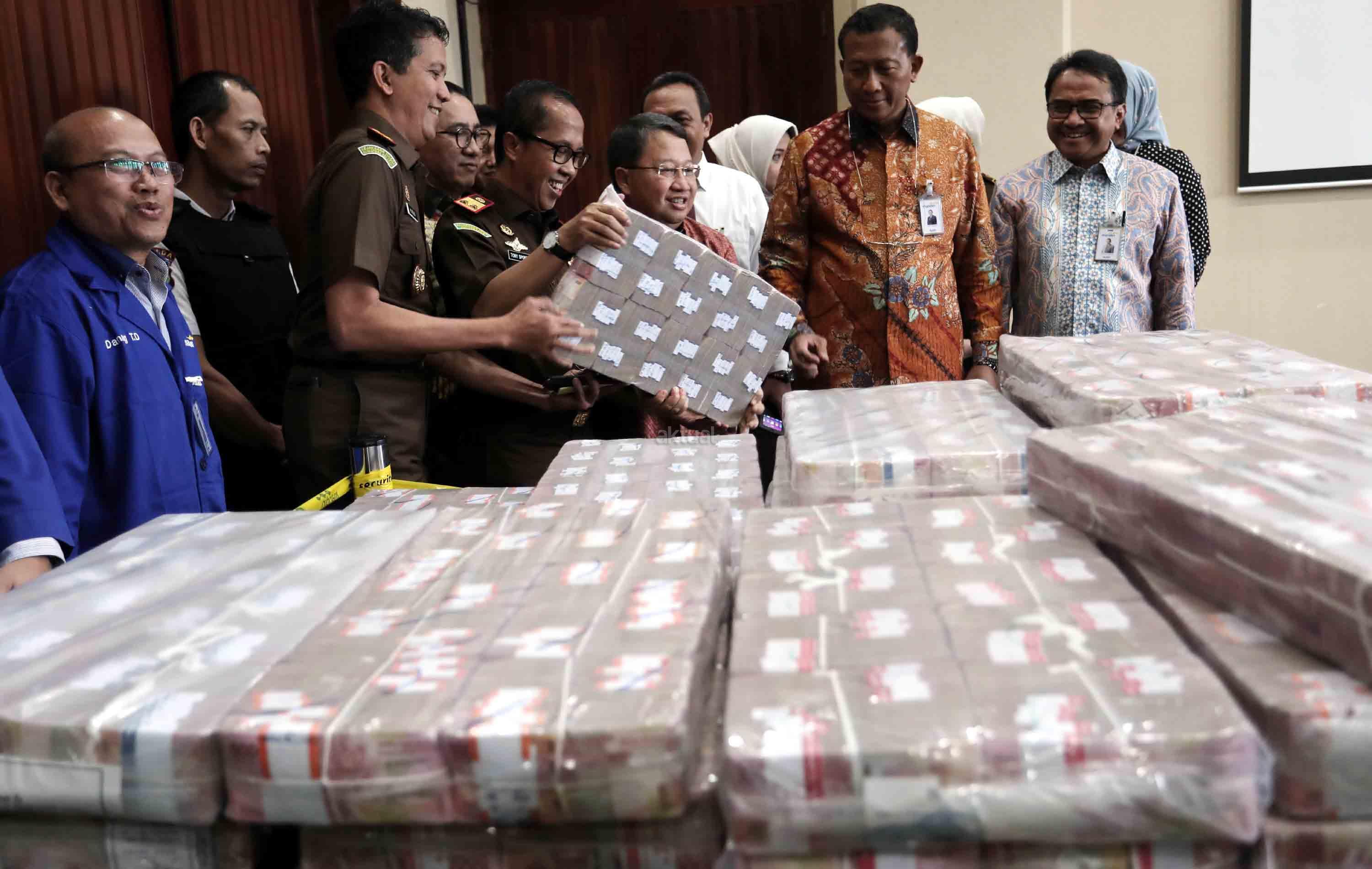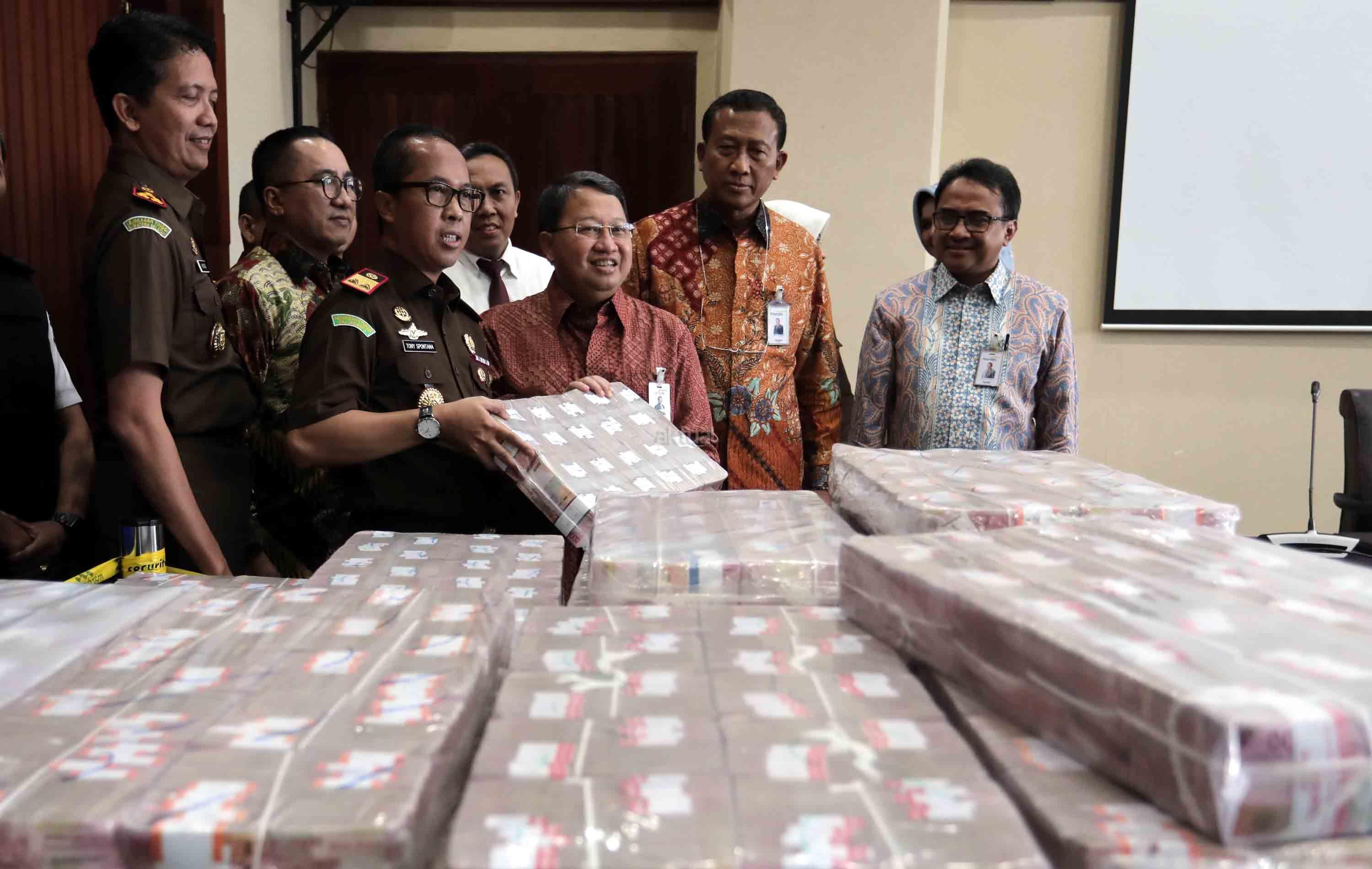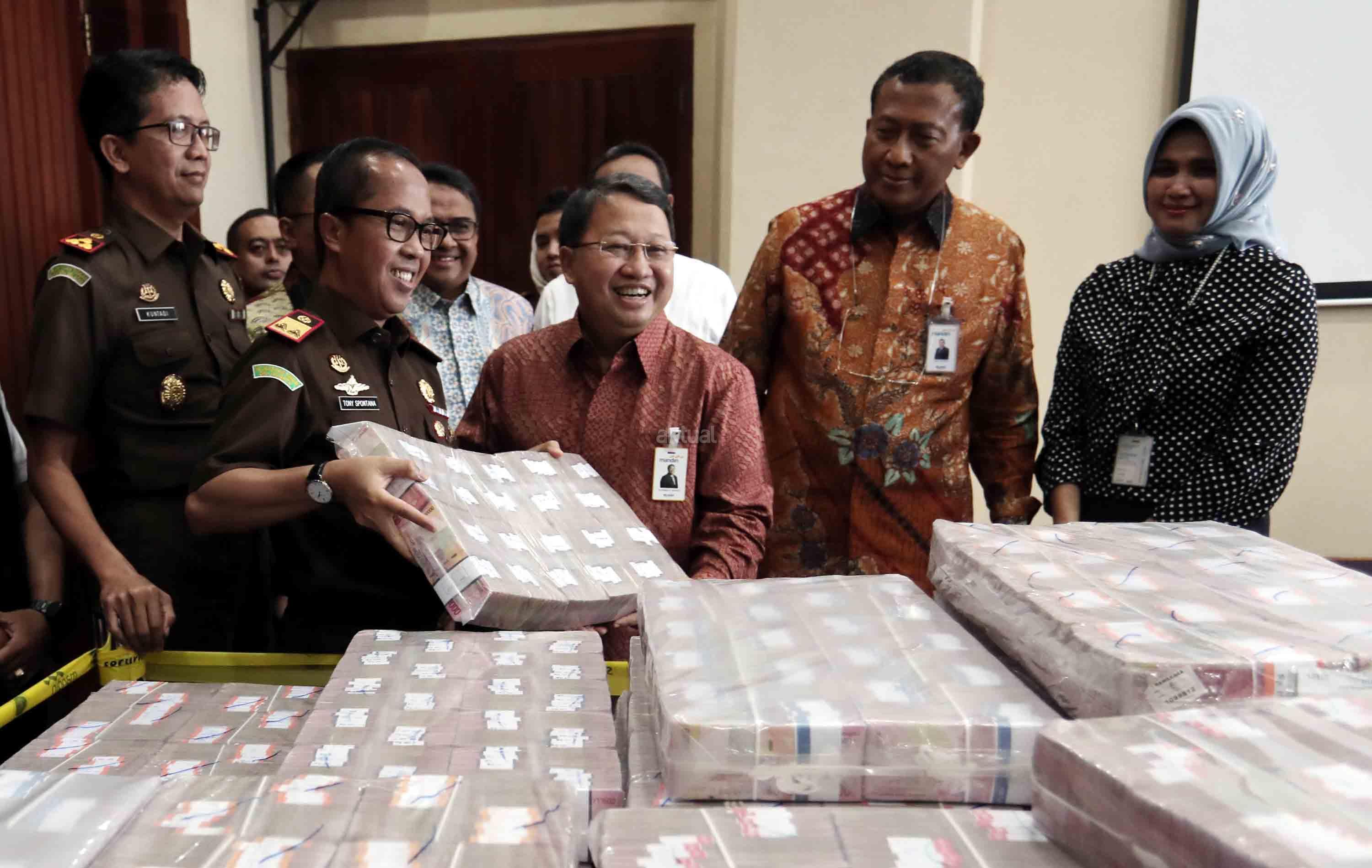 Kepala Kejaksaan Tinggi DKI Jakarta Toni Spontana (tengah) menyerahkan secara simbolis kepada Wakil Direktur Utama Bank Mandiri Sulaiman A. Arianto (ketiga kanan) uang ganti rugi korupsi Bantuan Likuidasi Bank Indonesia (BLBI) dengan terpidana Samadikun Hartono di Gedung Bank Mandiri, Jakarta, Kamis (17/5). Mantan Komisaris Utama PT Bank Modern Samadikun Hartono terbukti korupsi dana talangan BLBI dan dihukum 4 tahun penjara serta diwajibkan mengembalikan uang yang dikorupsinya sebesar Rp 169 miliar secara dicicil. AKTUAL/Tino Oktaviano