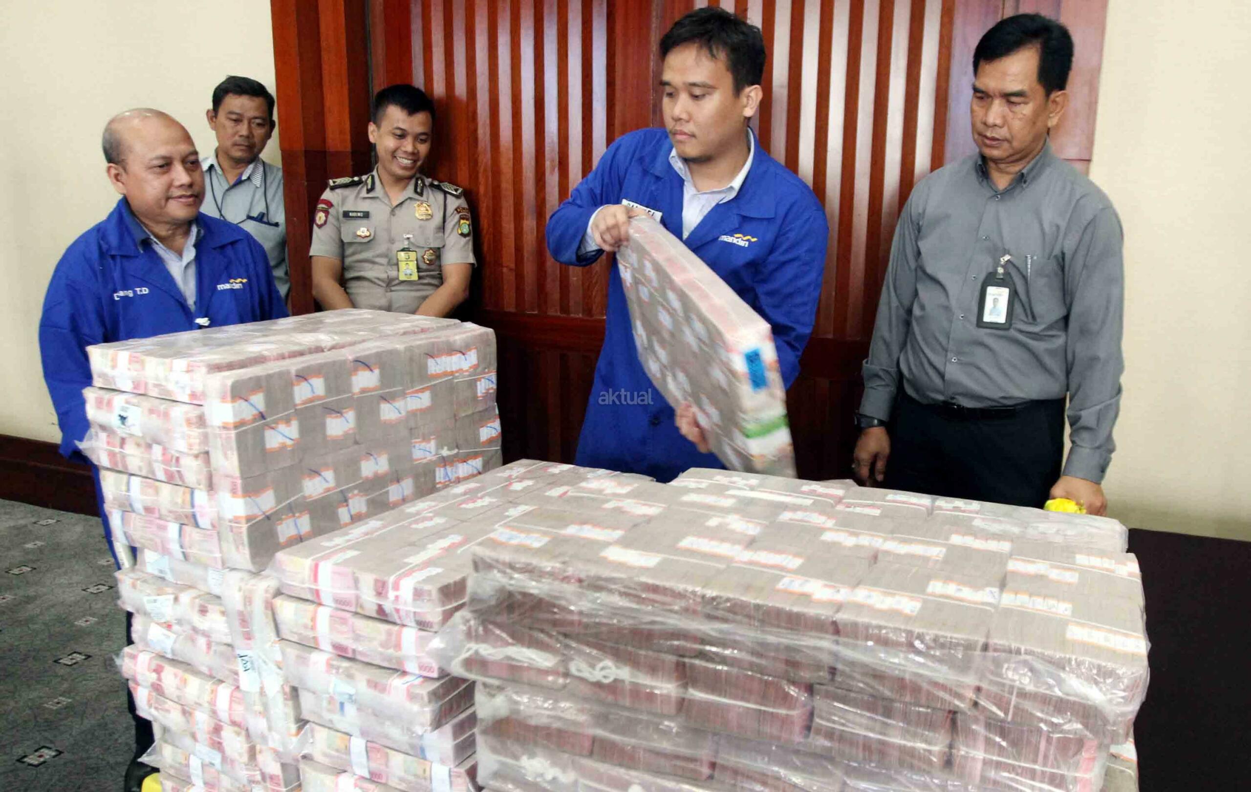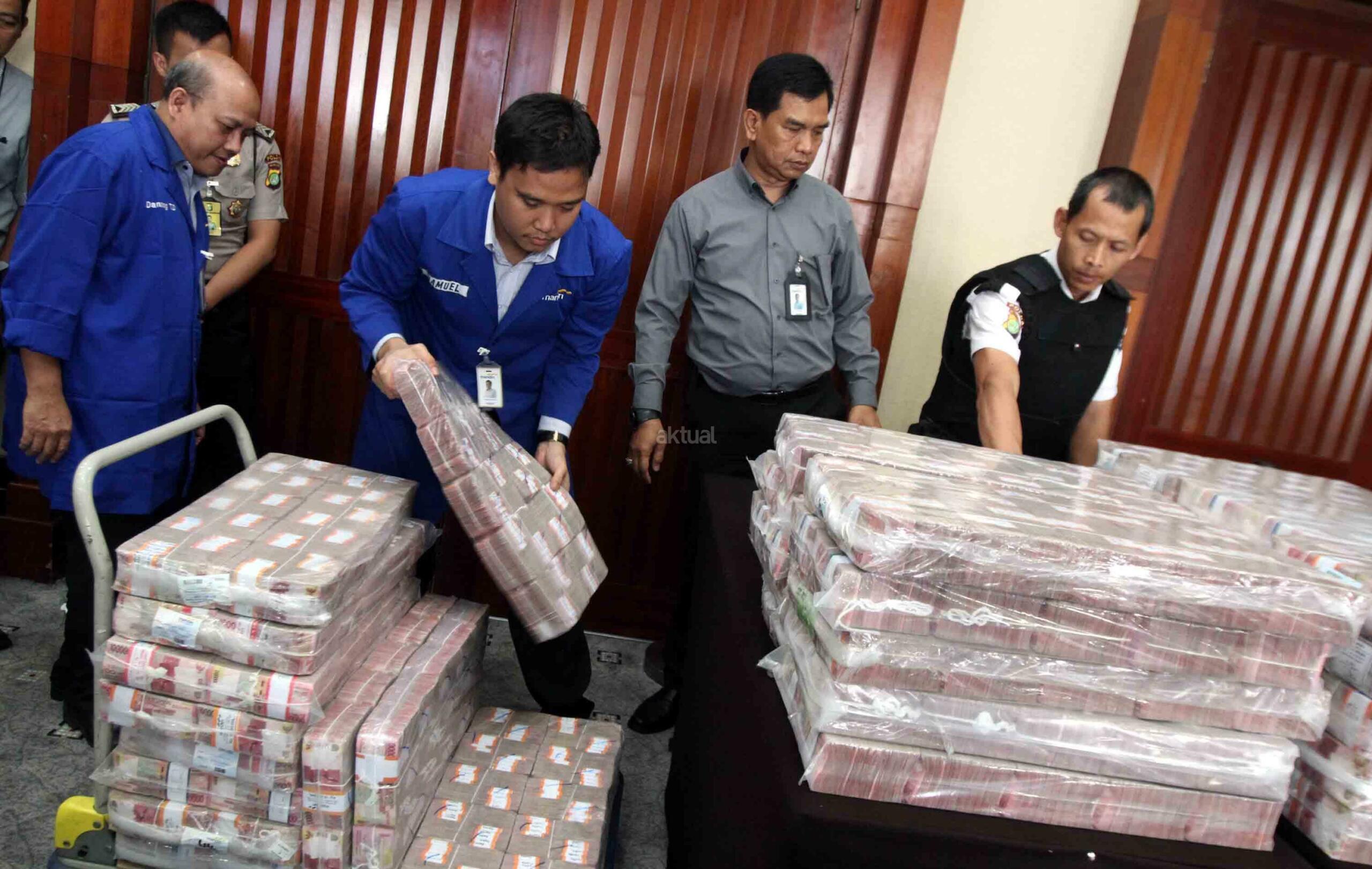 Karyawan Bank Mandiri dan Polisi menyiapkan uang ganti rugi korupsi Bantuan Likuidasi Bank Indonesia (BLBI) dengan terpidana Samadikun Hartono di Gedung Bank Mandiri, Jakarta, Kamis (17/5). Mantan Komisaris Utama PT Bank Modern Samadikun Hartono terbukti korupsi dana talangan BLBI dan dihukum 4 tahun penjara serta diwajibkan mengembalikan uang yang dikorupsinya sebesar Rp 169 miliar secara dicicil. AKTUAL/Tino Oktaviano