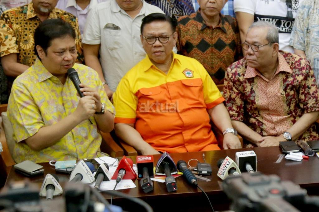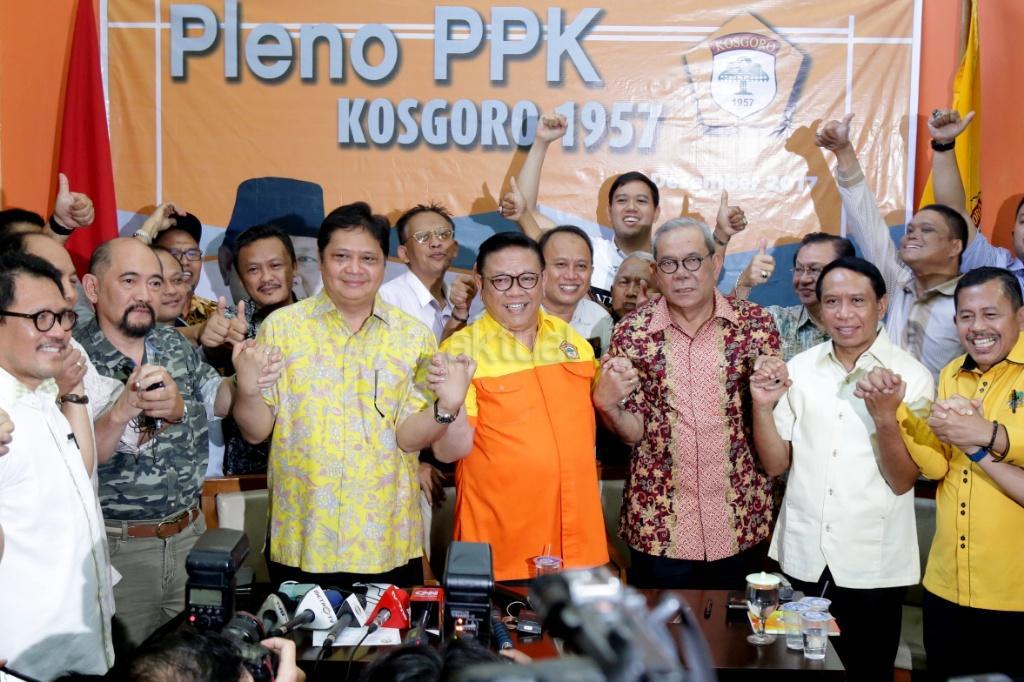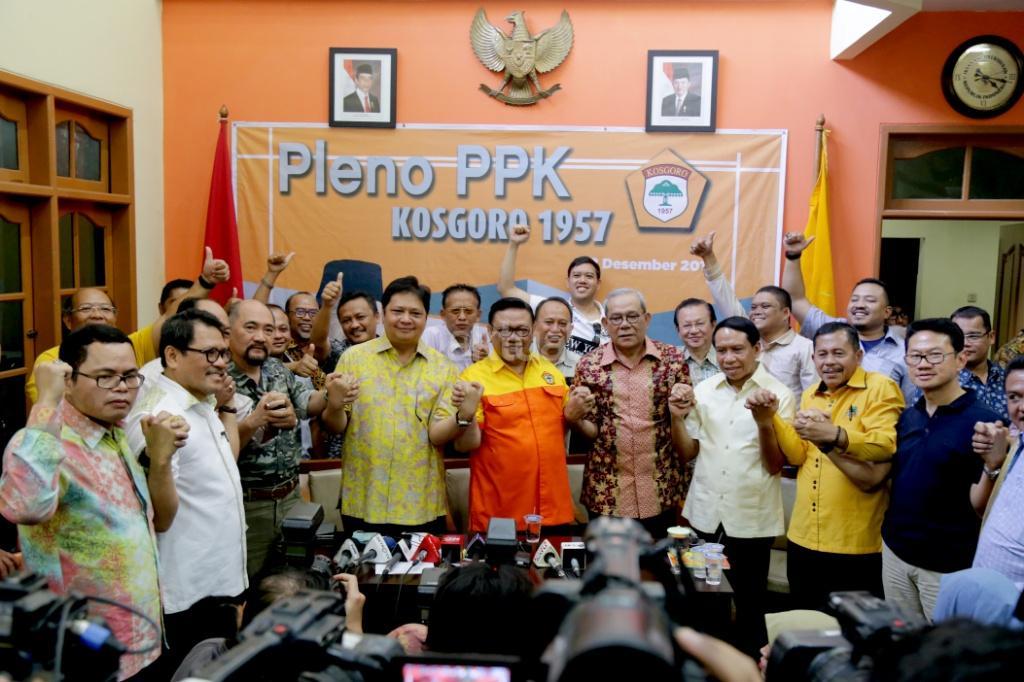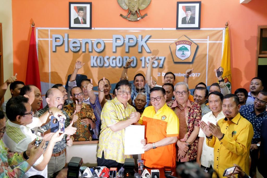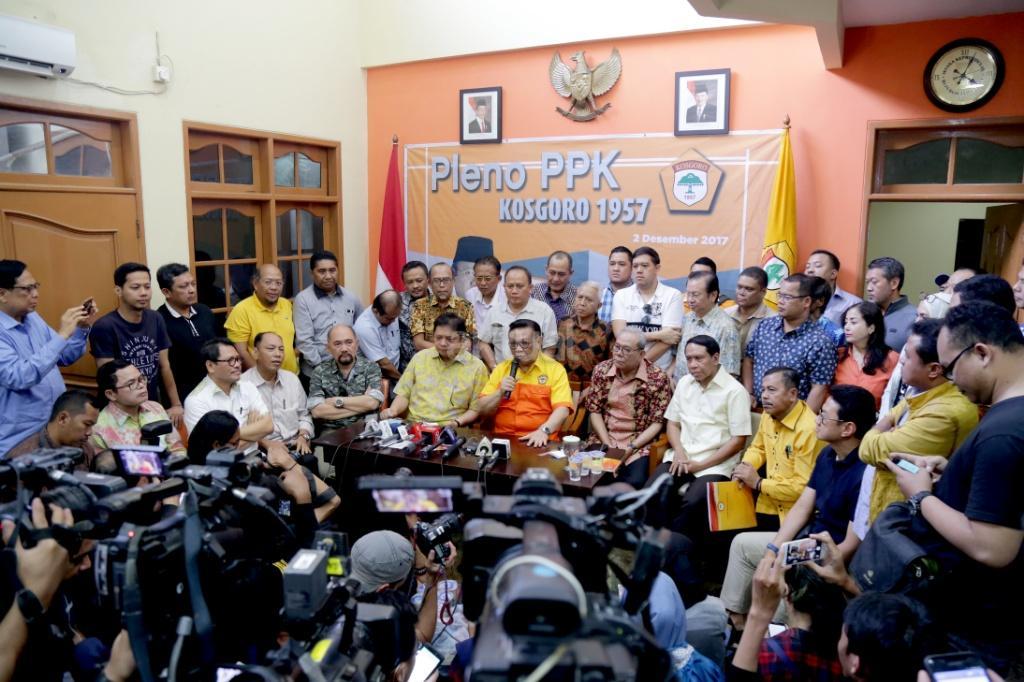Ketua Umum Kosgoro 1957 Agung Laksono mengumumkan dukungan Kosgoro 1957 kepada Menteri Perindustrian Airlangga Hartarto sebagai calon Ketum Partai Golkar di kantor Kosgoro 1957, Jakarta, Sabtu (2/12/2017). Organisasi pendiri Partai Golkar, Kosgoro 1957, resmi mendukung Airlangga Hartarto sebagai calon Ketua Umum Golkar menggantikan Setya Novanto, yang kini ditahan KPK. Hal ini diumumkan setelah diadakan Pleno PPK Kosgoro 1957. AKTUAL/Tino Oktaviano