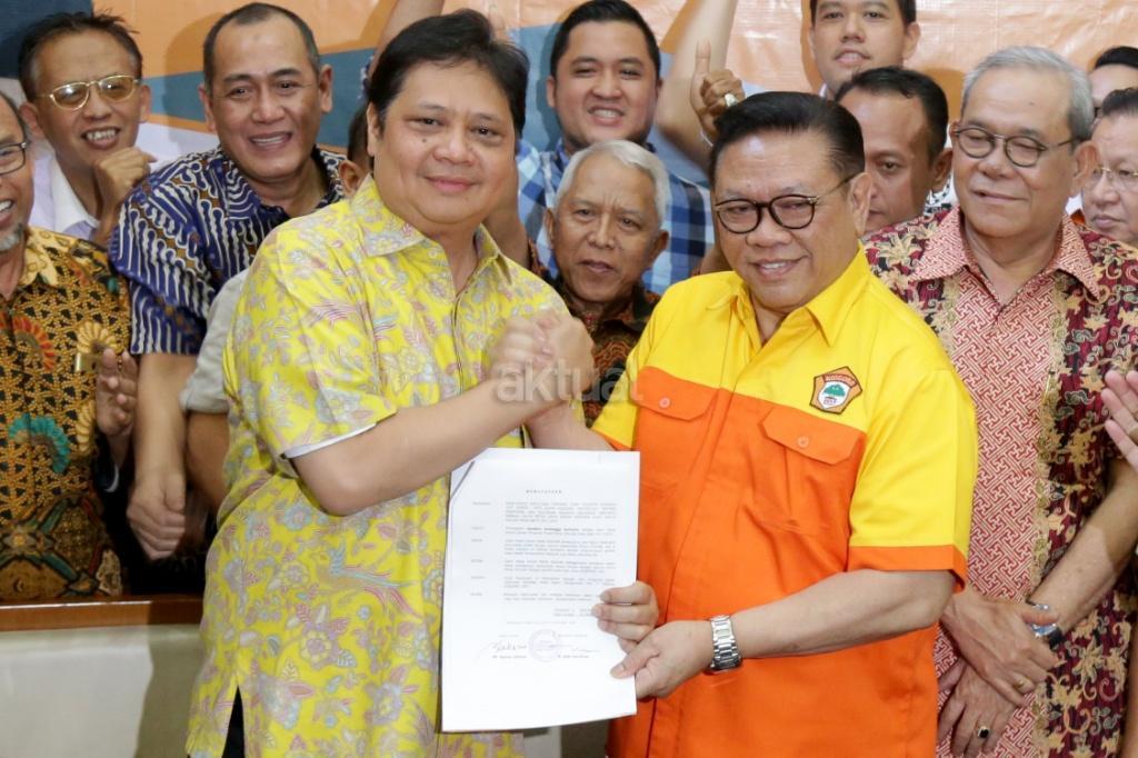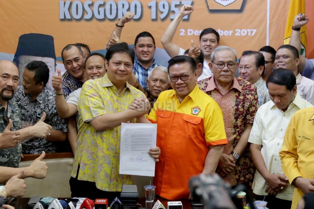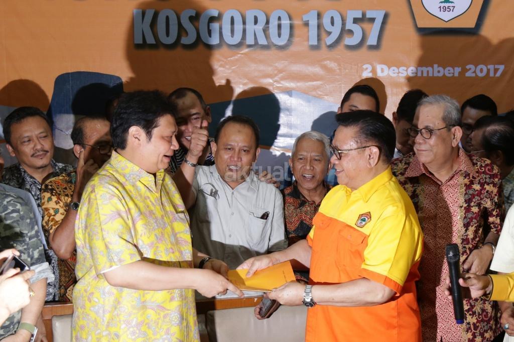 Ketua Umum Kosgoro 1957 Agung Laksono menyerahkan surat rekomendasi dukungan Kosgoro 1957 kepada Menteri Perindustrian Airlangga Hartarto sebagai calon Ketum Partai Golkar di kantor Kosgoro 1957, Jakarta, Sabtu (2/12/2017). Organisasi pendiri Partai Golkar, Kosgoro 1957, resmi mendukung Airlangga Hartarto sebagai calon Ketua Umum Golkar menggantikan Setya Novanto, yang kini ditahan KPK. Hal ini diumumkan setelah diadakan Pleno PPK Kosgoro 1957. AKTUAL/Tino Oktaviano