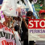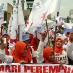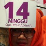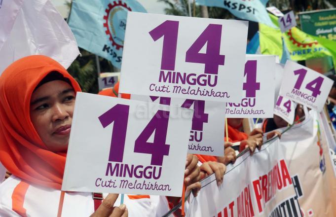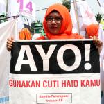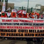 Ratusan buruh perempuan dari berbagai elemen organisasi yang tergabung dalam Komite Perempuan Industrial (KPI)melakukan aksi memperingati hari perempuan internasional di depan DPR RI, Jakarta, Rabu (8/3/2017). Dalam aksi memperingati hari perempuan internasional Komite Perempuan Industrial (KPI) mendesak pemerintah dan DPR untuk meratifikasi konvensi ILO No 183 , 14 minggu cuti melahirkan dan stop periksa haid kami. AKTUAL/Munzir