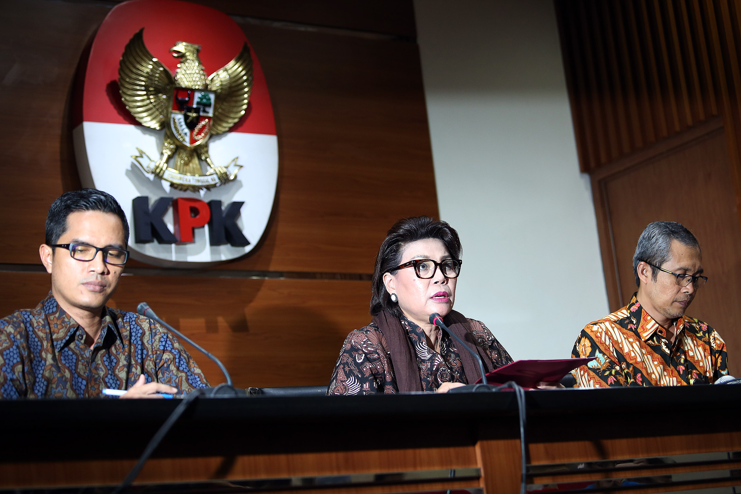 Dari kiri ke kanan, Jubir Komisi Pemberantasan Korupsi (KPK) Febri Diansyah, Wakil Ketua KPK Basaria Panjaitan dan Alexander Marwata saat memberi keterangan hasil operasi tangkap tangan (OTT) di Gedung KPK, Jakarta, Kamis (14/9). Keterangan terkait operasi tangkap tangan Bupati Batubara, OK Arya Zulkarnain. AKTUAL/Tino Oktaviano
