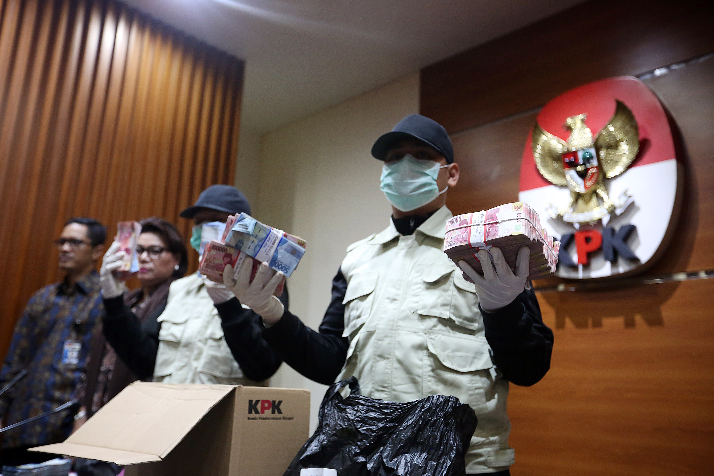 Komisi Pemberantasan Korupsi menetapkan lima orang tersangka dari hasil OTT tersebut yaitu OK Arya Zulkarnain Bupati Batubara, STR dari Swasta, HH Kepala Dinas PUPR Pemkab Batubara, MAS kontraktor dan SAZ kontraktor serta mengamankan barang bukti uang sebesar Rp 346 juta atas kasus dugaan suap terkait dengan pekerjaan pembangunan infrastruktur di wilayah Kabupaten Batubara, Sumatera Utara TA 2017. AKTUAL/Tino Oktaviano