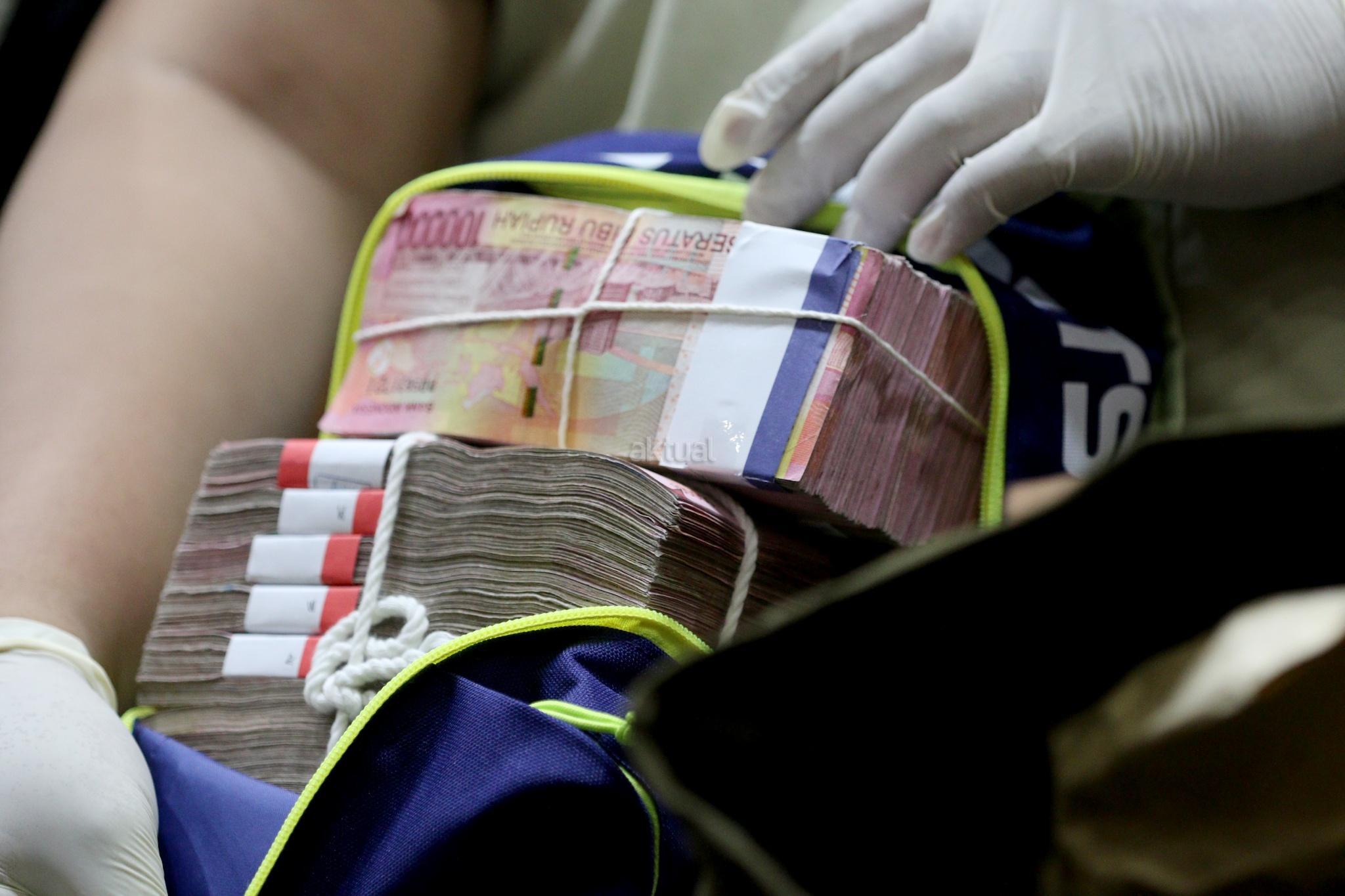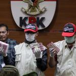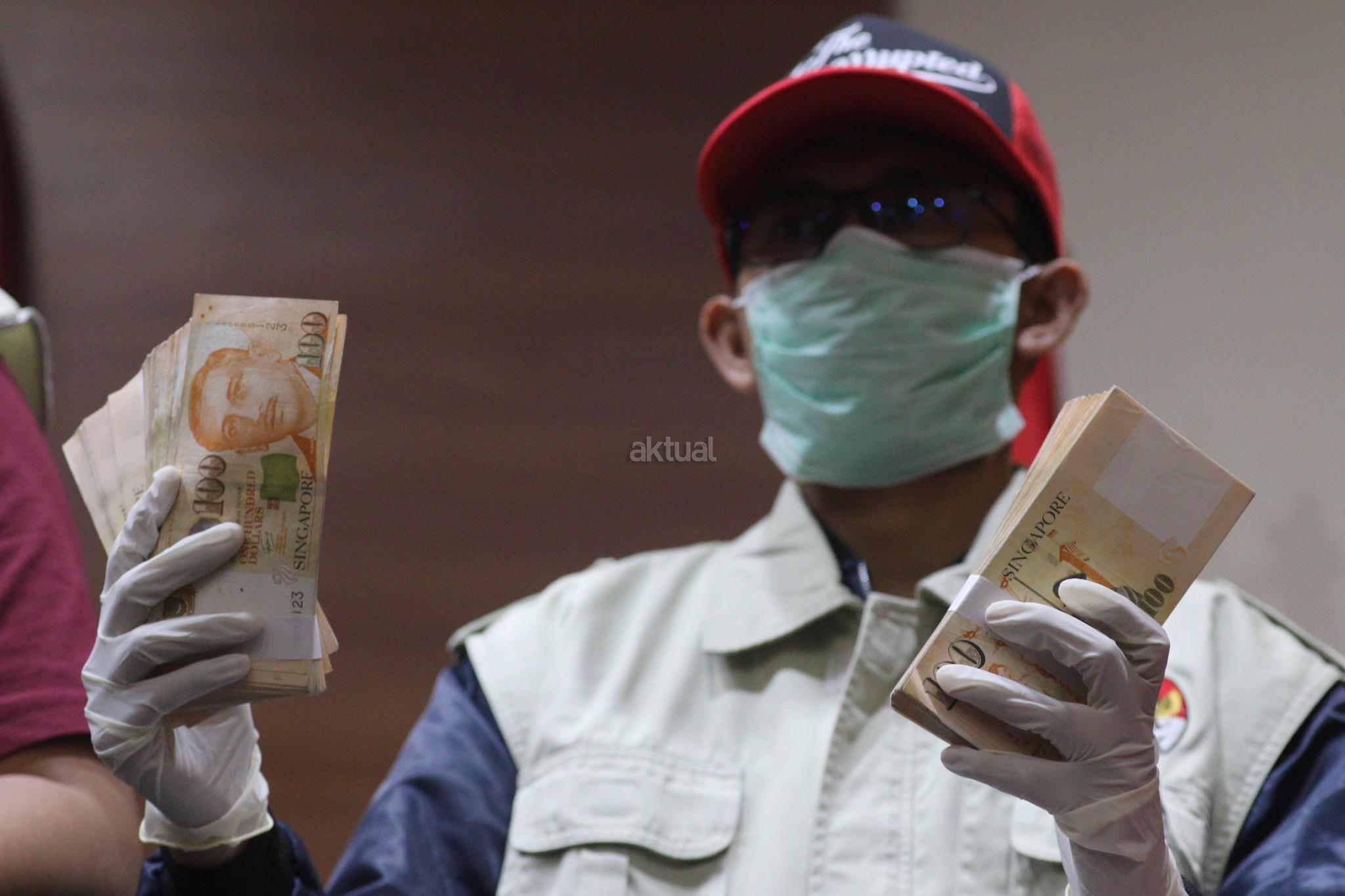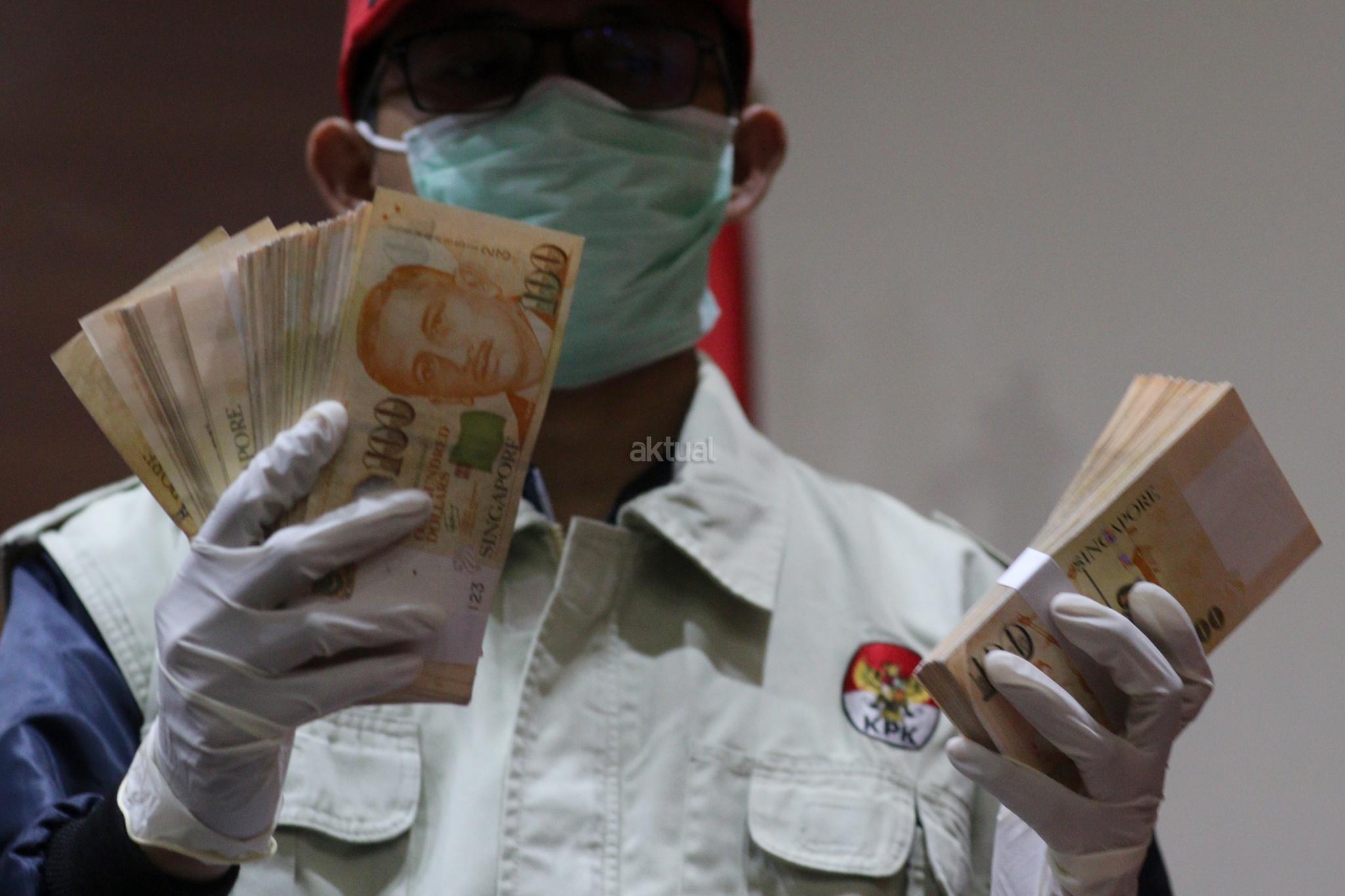 Petugas KPK memperlihatkan barang bukti Operasi Tangkap Tangan (OTT) pejabat di Kementerian Pekerjaan Umum dan Perumahan Rakyat (PUPR) saat konferensibpers di kantor KPK, Jalan HR Rasuna Said, Jakarta Selatan, Minggu (30/12/2018). Dari OTT ini, tim penindakan menyita uang senilai Rp 500 juta dan 25.000 dollar Singapura dan mengamankan total 20 orang terkait dengan proyek penyediaan air minum di sejumlah daerah. AKTUAL/Tino Oktaviano