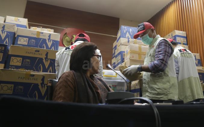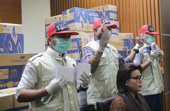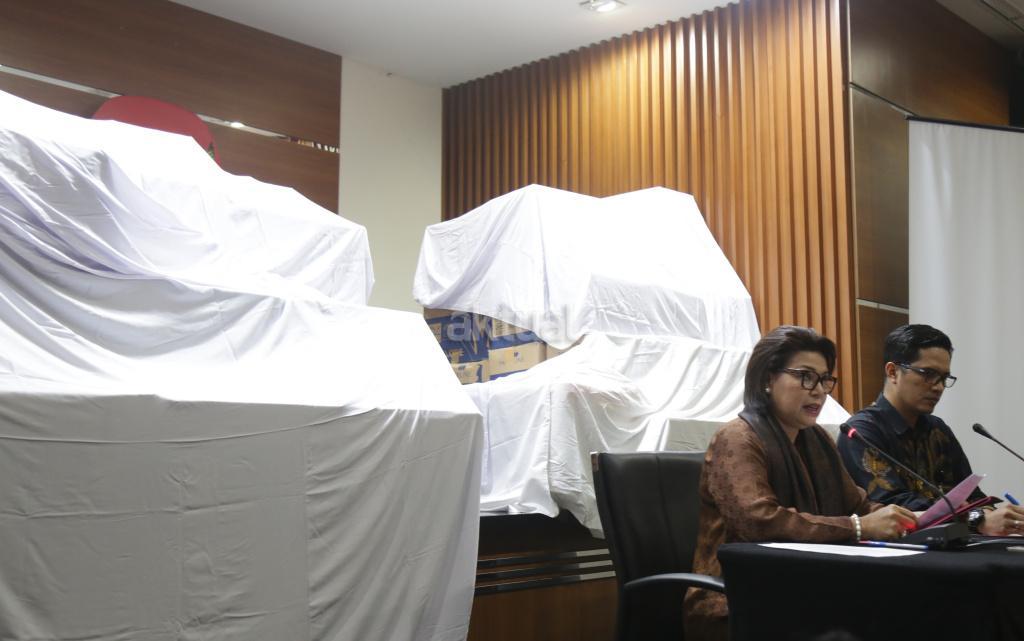 Penyidik didamping Wakil Ketua KPK Basaria Panjaitan, menunjukkan barang bukti hasil Operasi Tangkap Tangan (OTT) yang menjerat anggota DPR Fraksi Golkar Bowo Sidik Pangarso, saat memberikan keterangan pers, di Gedung KPK Merah Putih, Jakarta, Kamis (28/3/2019). AKTUAL/Tino Oktaviano