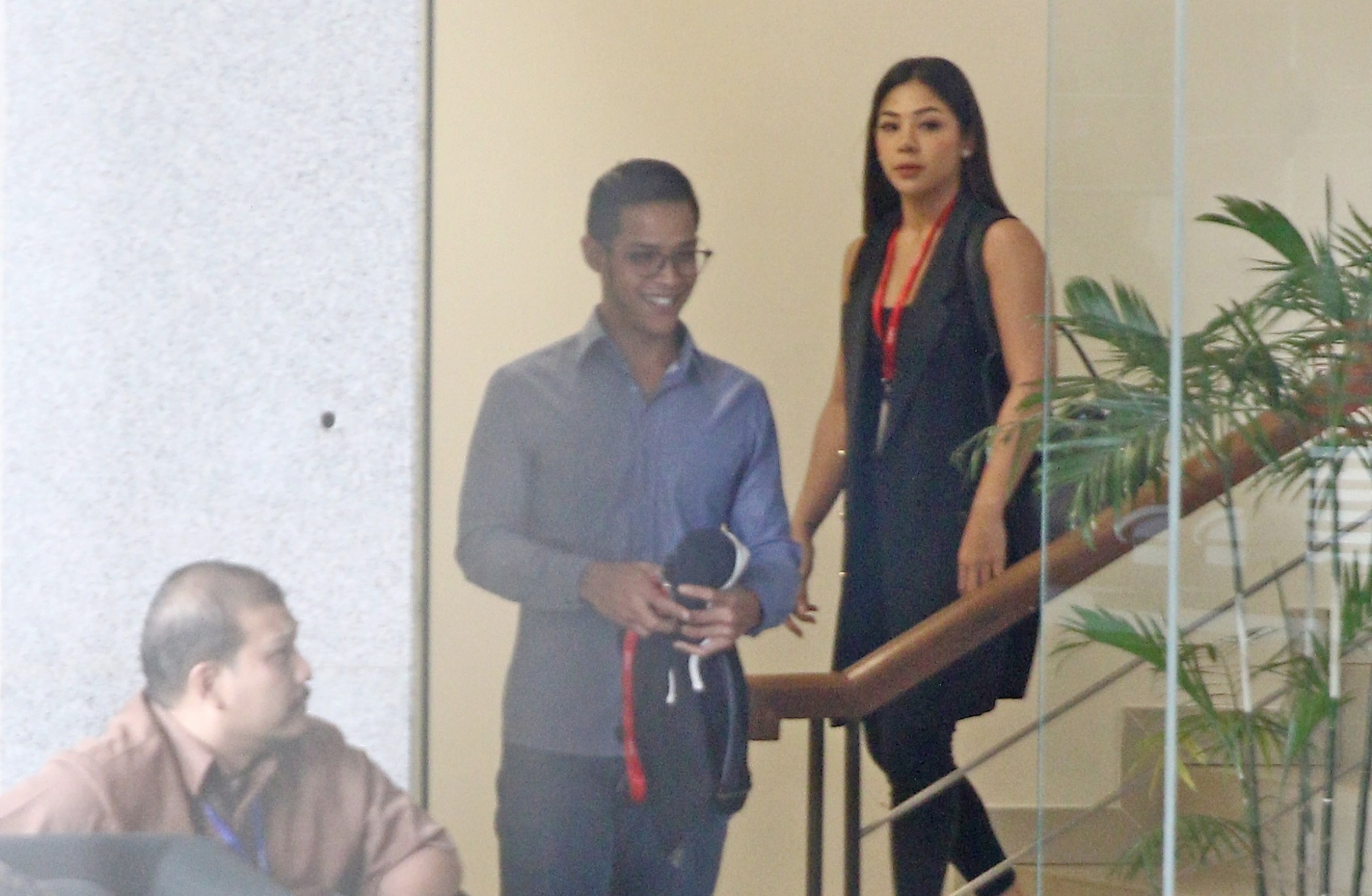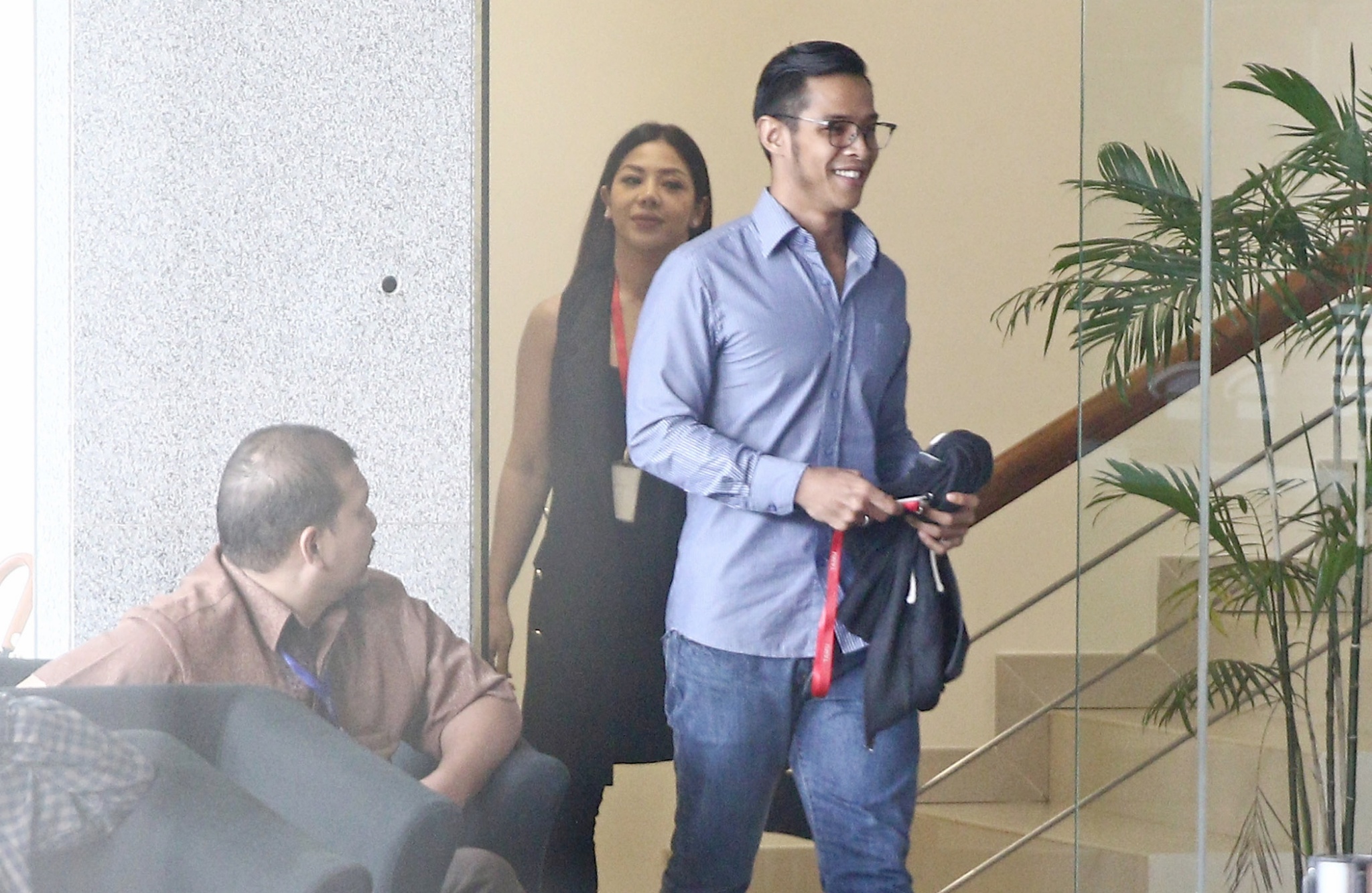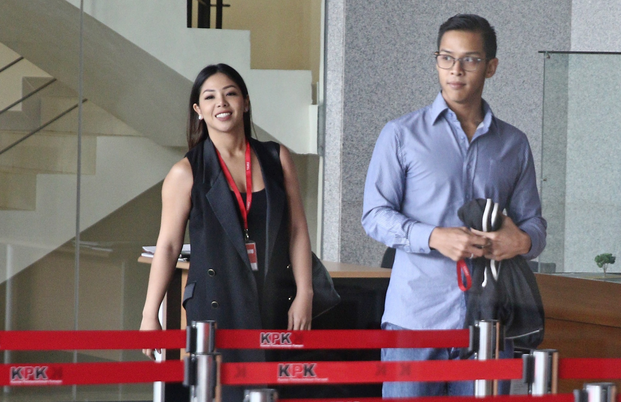 Anak Setya Novanto, Reza Herwindo dan Dwina Michaela bersiap meninggalkan gedung KPK seusai diperiksa di Jakarta, Rabu (28/3). KPK memeriksa Reza Herwindo dan Dwina Michaela sebagai saksi terkait kasus korupsi proyek pengadaan KTP elektronik untuk tersangka Irvanto Hendra Pambudi Cahyo dan Made Oka Masagung. AKTUAL/Tino Oktaviano