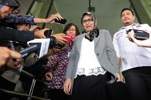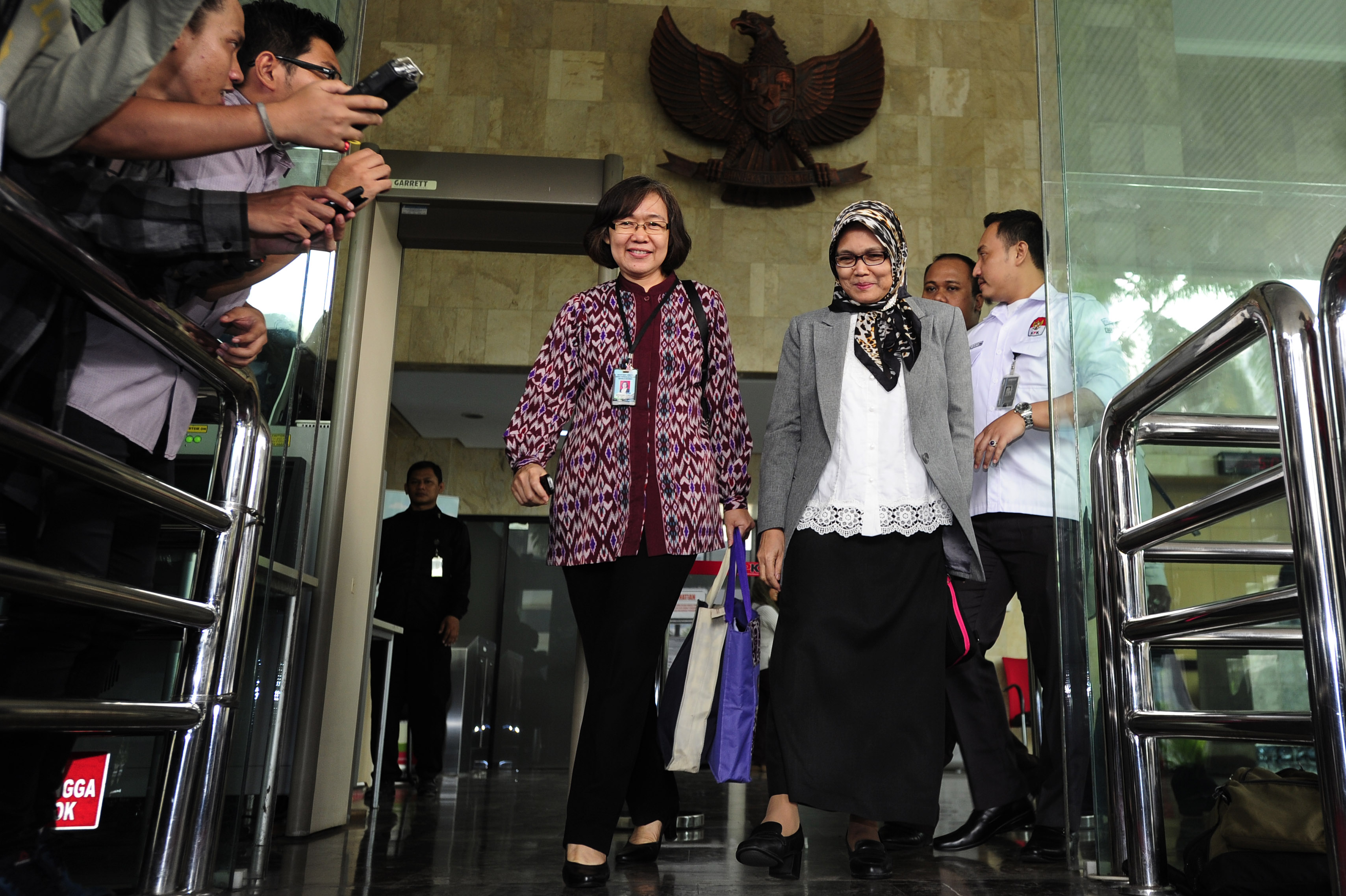 Sekjen DPR Winantuningsih Swasanani (kanan) bergegas usai menjalani pemeriksaan di Gedung KPK Jakarta, Selasa (27/10). Sekjen DPR tersebut diperiksa sebagai saksi terkait dugaan suap mantan Sekjen Partai Nasdem, Patrice Rio Capella dalam penanganan perkara Bansos Pemprov Sumut di Kejaksaan Agung. ANTARA FOTO/Wahyu Putro A/foc/15.