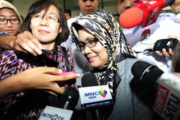Sekjen DPR Winantuningsih Swasanani (kanan) menjawab pertanyaan wartawan usai menjalani pemeriksaan di Gedung KPK Jakarta, Selasa (27/10). Sekjen DPR tersebut diperiksa sebagai saksi terkait dugaan suap mantan Sekjen Partai Nasdem, Patrice Rio Capella dalam penanganan perkara Bansos Pemprov Sumut di Kejaksaan Agung. ANTARA FOTO/Wahyu Putro A/foc/15.