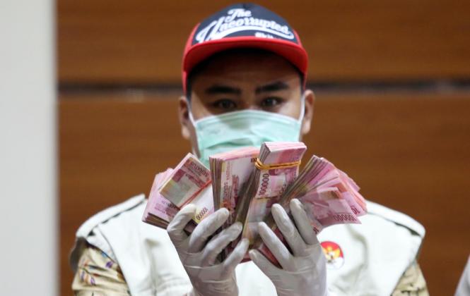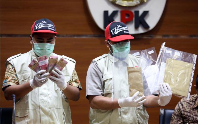 Wakil Ketua KPK Laode M. Syarief (kanan) bersama penyidik menunjukkan barang bukti hasil OTT kasus dugaan suap terkait seleksi pengisian jabatan pimpinan tinggi di Kementerian Agama saat konferensi pers di gedung KPK, Jakarta, Sabtu (16/3/2019). KPK menahan Ketum PPP Romahurmuziy, Kepala Kantor Kemenag Kabupaten Gresik Muhammad Muafaq Wirahadi, dan Kepala Kantor Wilayah Kemenang Jawa Timur Haris Hasanuddin dengan barang bukti uang sebanyak Rp156.758.000. AKTUAL/Tino Oktaviano