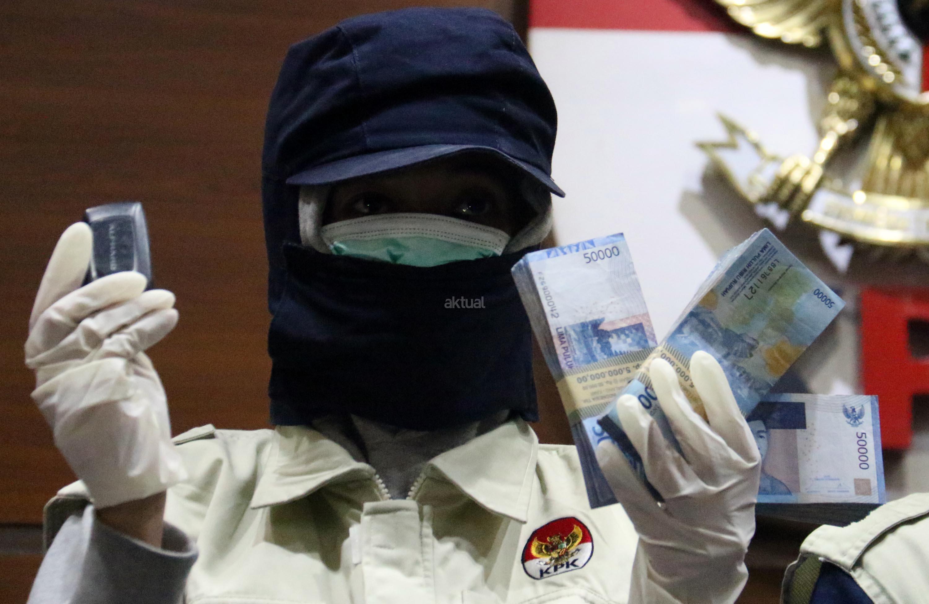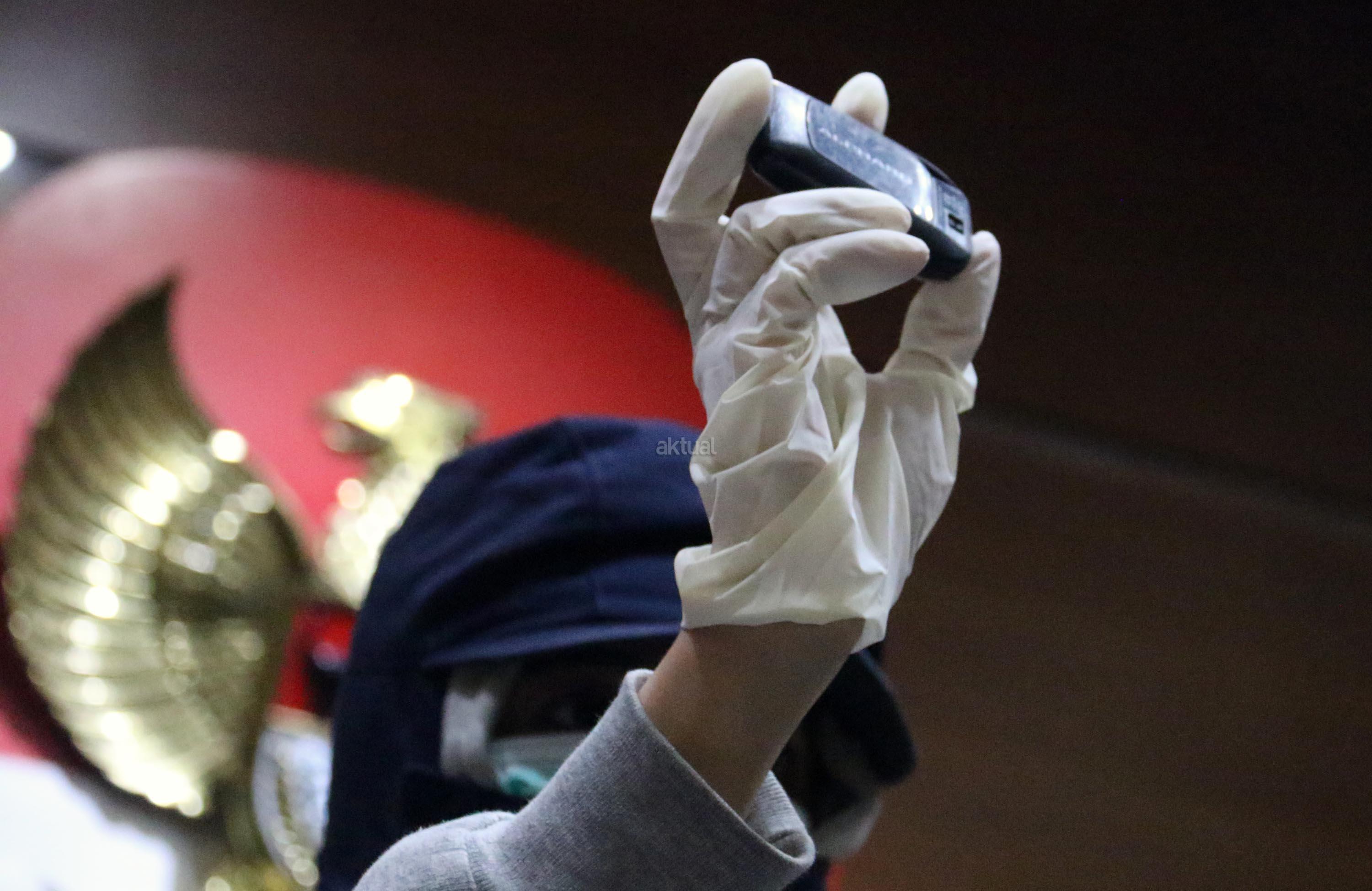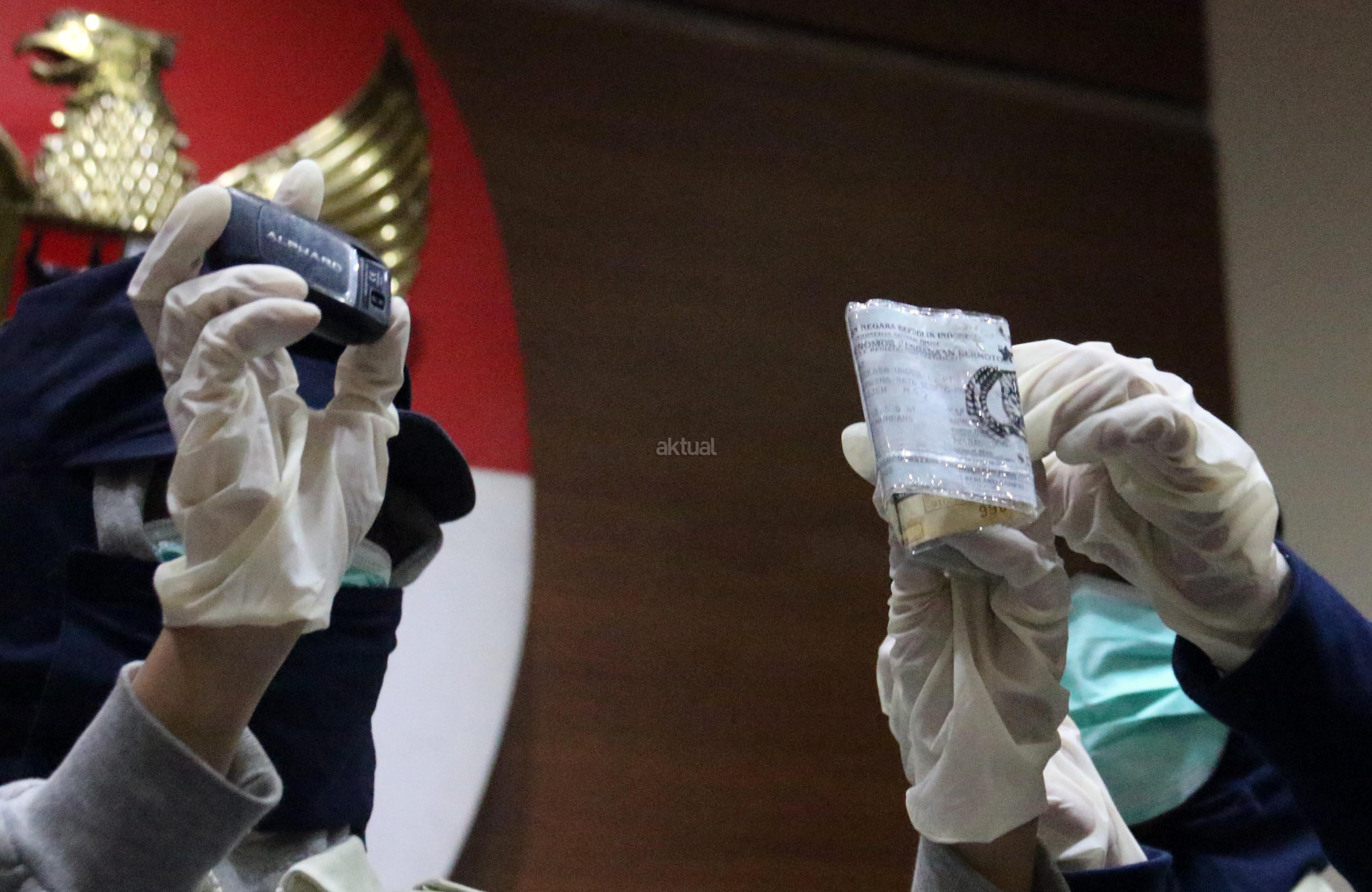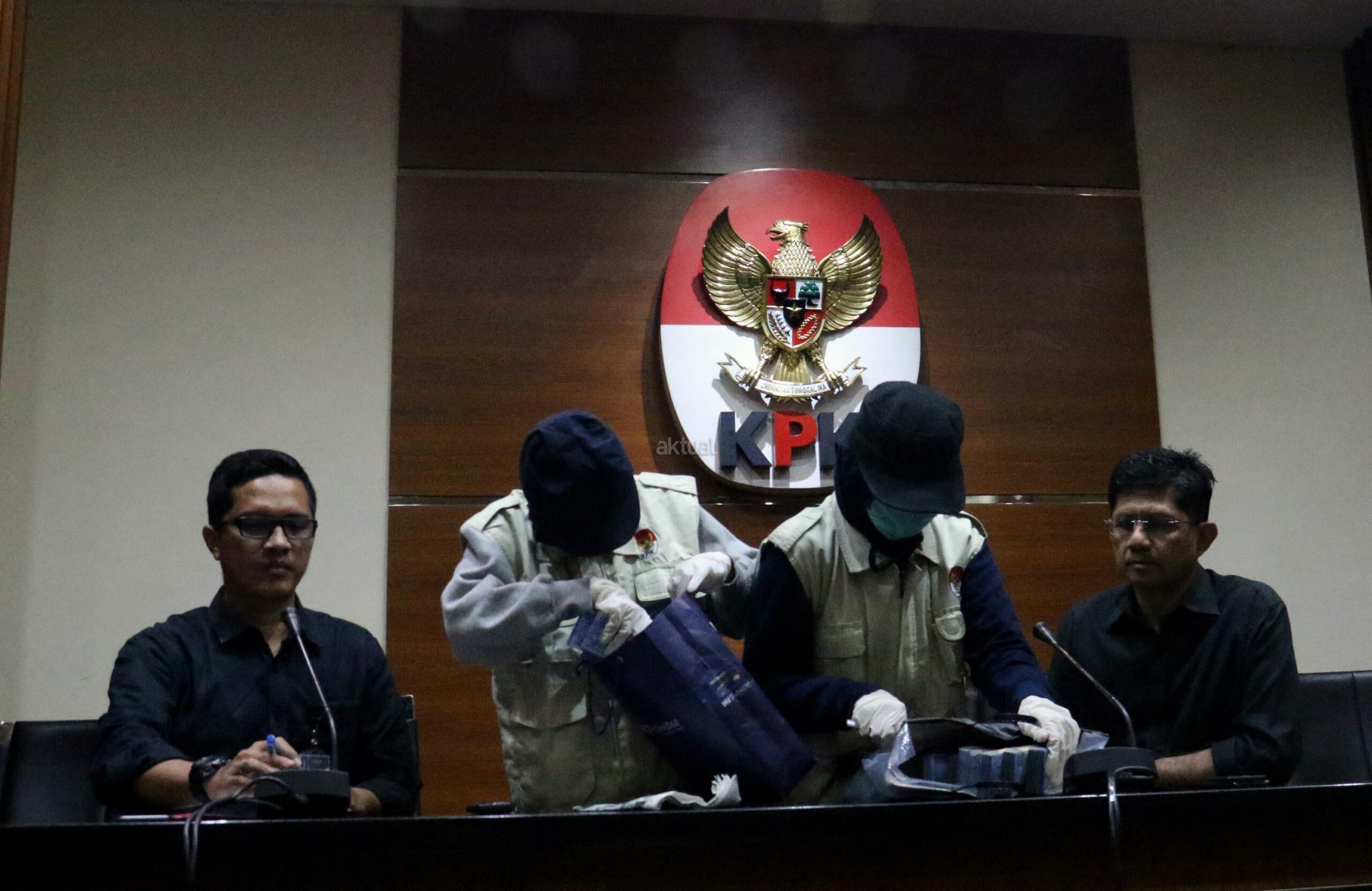 Penyidik KPK menunjukkan barang bukti terkait penangkapan Operasi Tangkap Tangan (OTT) Walikota Batu di Gedung KPK, Jakarta, Minggu (17/9/2017). KPK menetapkan tiga orang tersangka yang terjaring OTT di Batu, Jawa Timur yakni Walikota Batu Eddy Rumpoko, Kepala Bagian dan Pengadaan Pemkot Batu Edi Setiawan dan Pengusaha Philip serta mengamankan Rp200 juta terkait kasus dugaan suap pengadaan barang dan jasa Pemkot Batu. AKTUAL/Munzir
