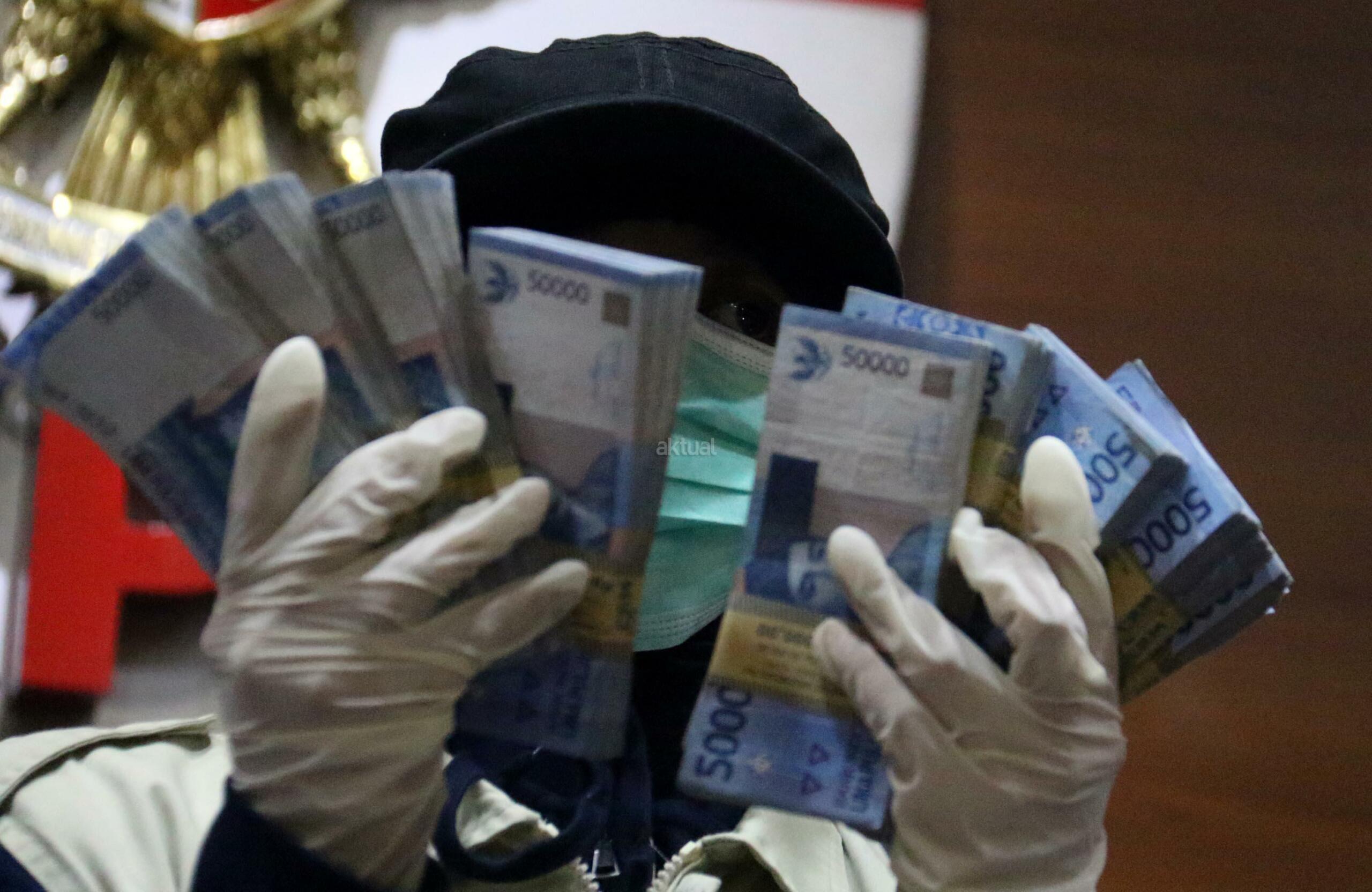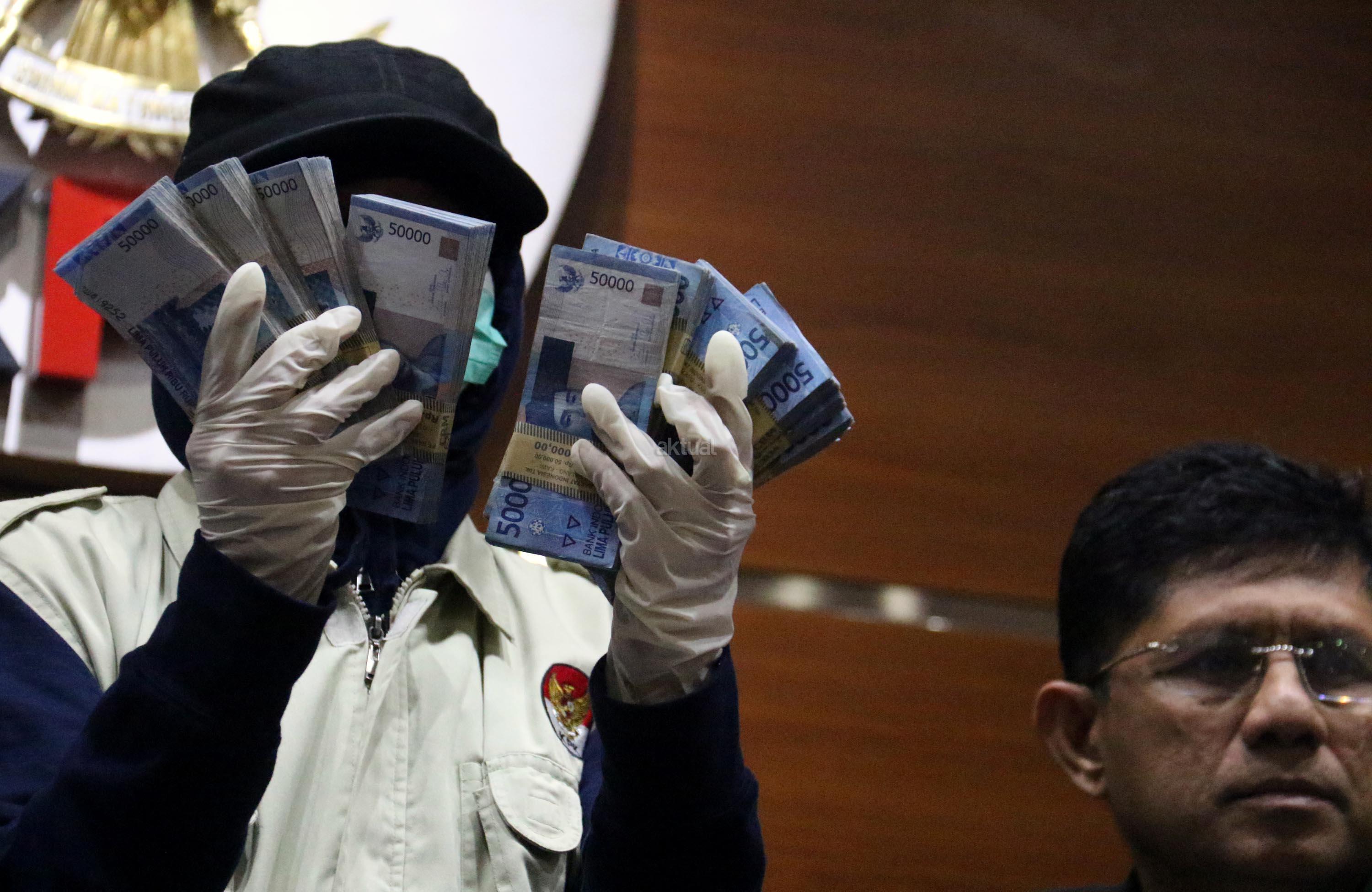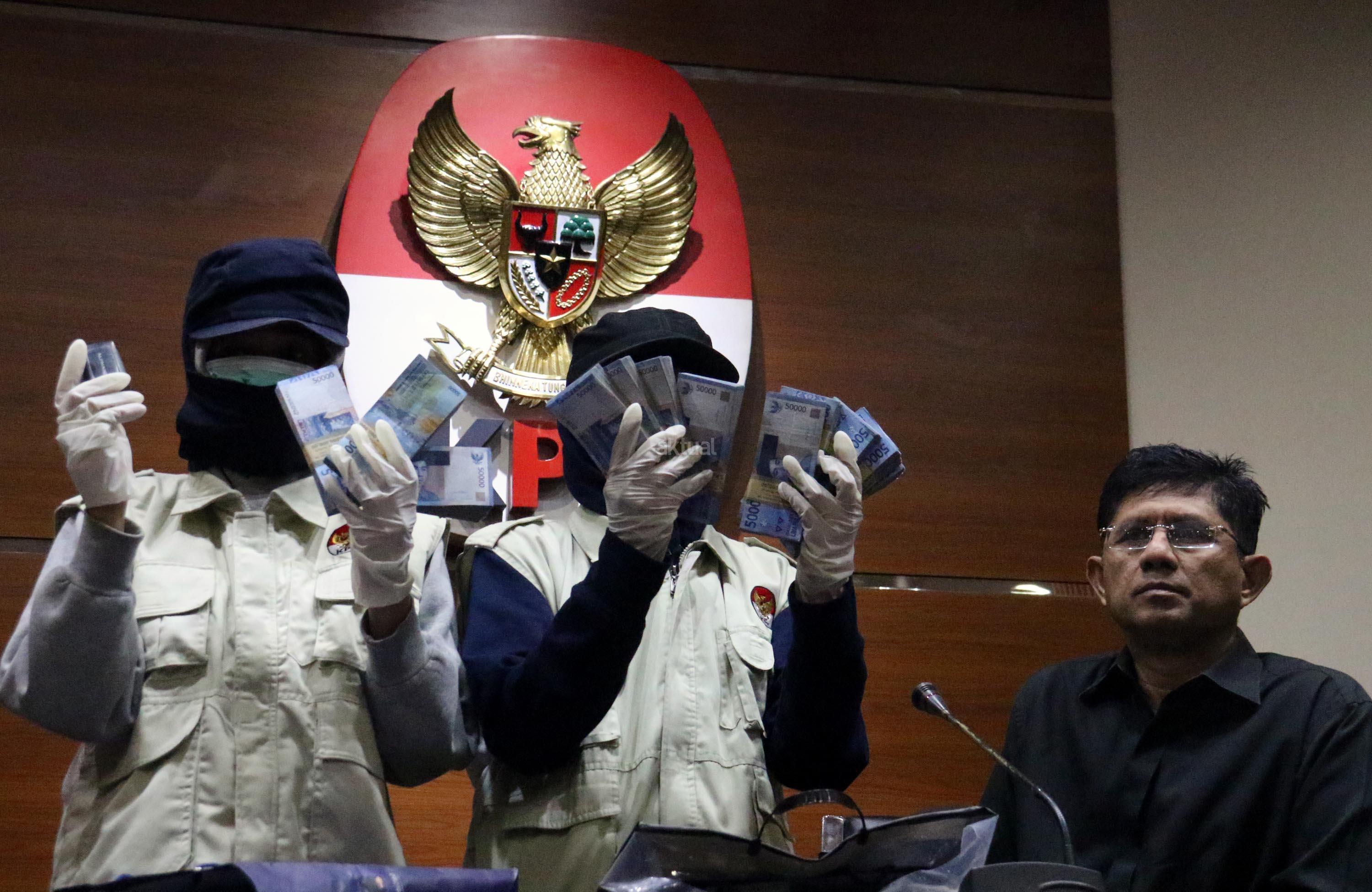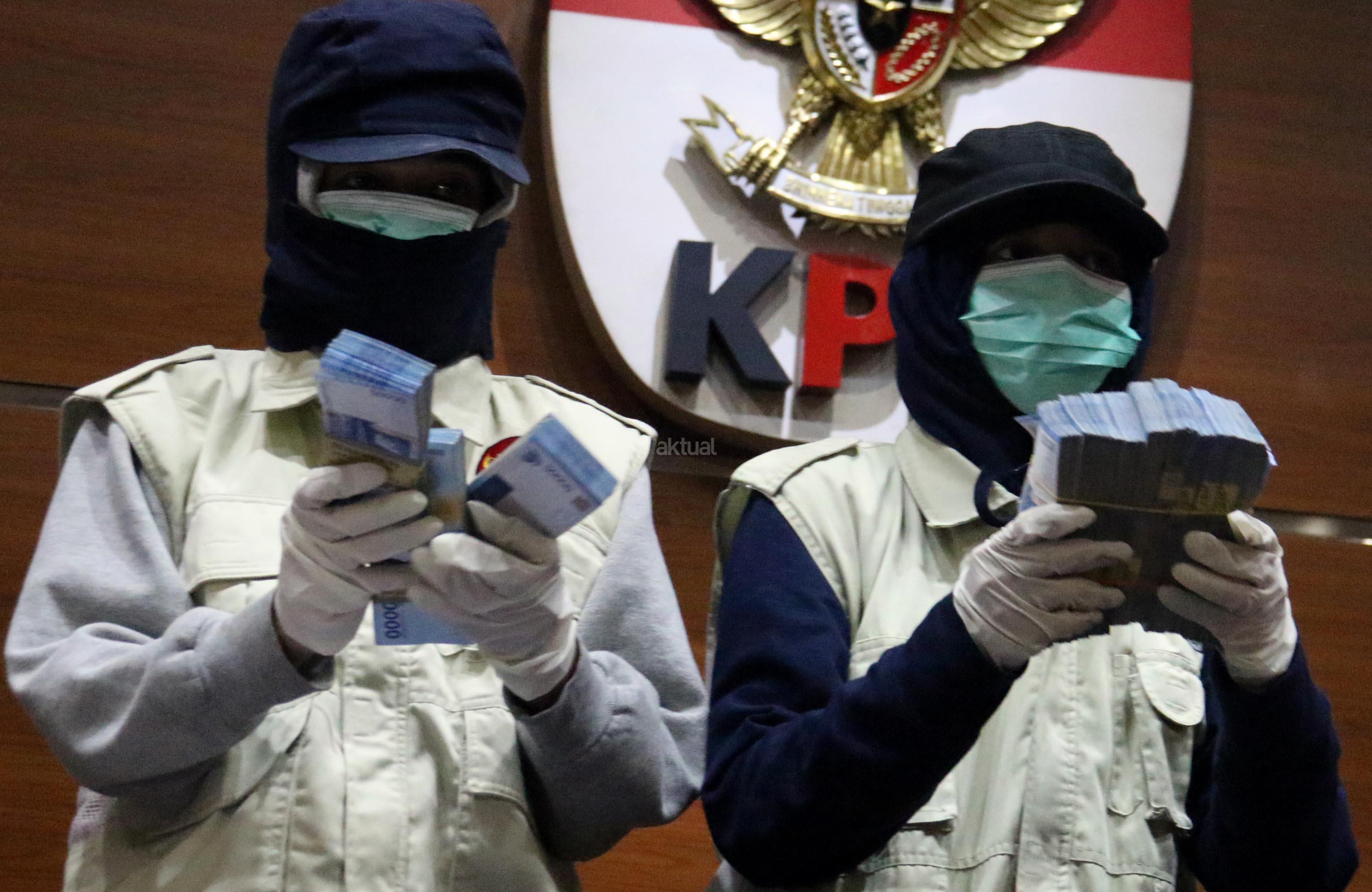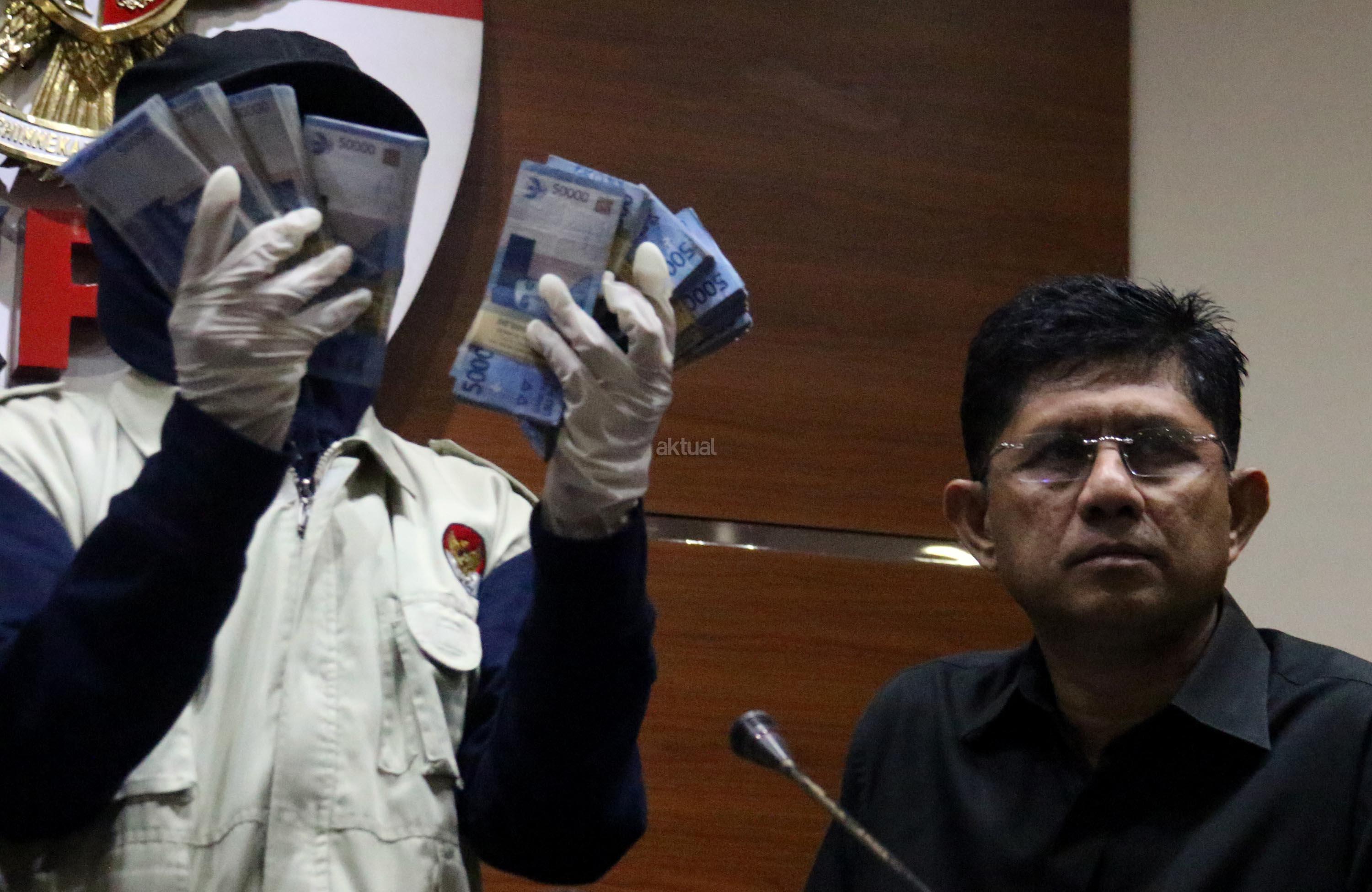 Penyidik KPK menunjukkan barang bukti terkait penangkapan Operasi Tangkap Tangan (OTT) Walikota Batu di Gedung KPK, Jakarta, Minggu (17/9/2017). KPK menetapkan tiga orang tersangka yang terjaring OTT di Batu, Jawa Timur yakni Walikota Batu Eddy Rumpoko, Kepala Bagian dan Pengadaan Pemkot Batu Edi Setiawan dan Pengusaha Philip serta mengamankan Rp200 juta terkait kasus dugaan suap pengadaan barang dan jasa Pemkot Batu. AKTUAL/Munzir