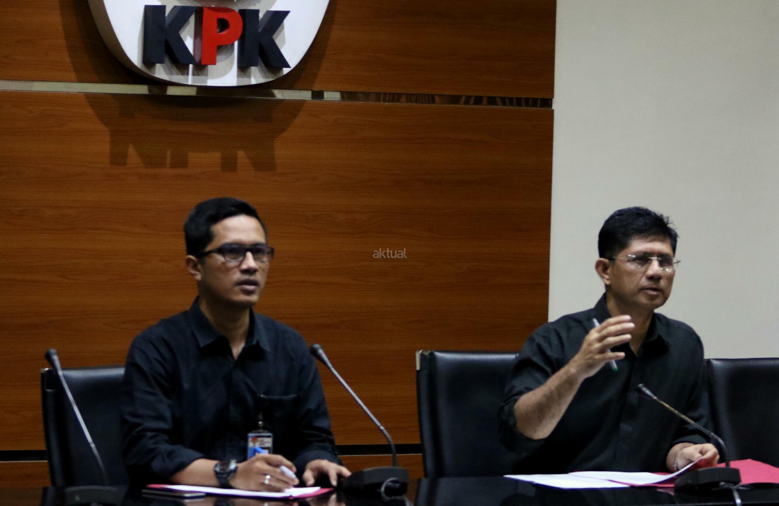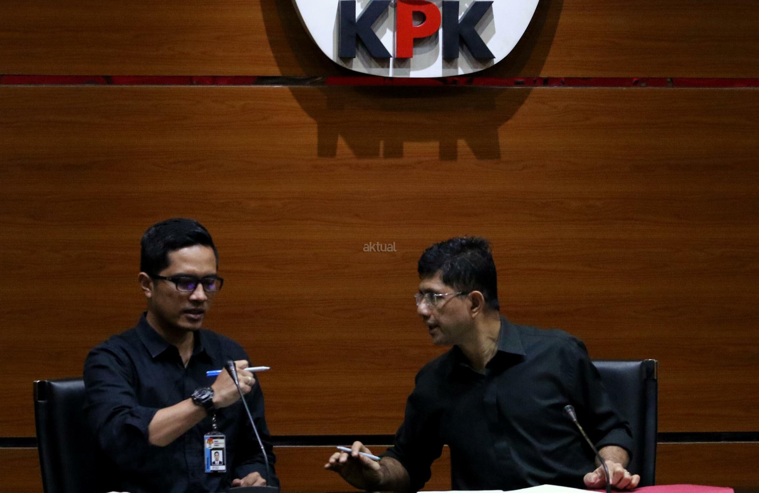 Wakil Ketua KPK Laode M Syarif (kanan), Juru bicara KPK Febri Diansyah (kiri) saat memberikaan keterangan terkait Operasi Tangkap Tangan (OTT) yang dilakukan KPK terhadap Wali Kota Batu Eddy Rumpoko di Gedung KPK, Jakarta, Minggu (17/9/2017). KPK menetapkan tiga orang tersangka yang terjaring OTT di Batu, Jawa Timur yakni Walikota Batu Eddy Rumpoko, Kepala Bagian dan Pengadaan Pemkot Batu Edi Setiawan dan Pengusaha Philip serta mengamankan Rp200 juta terkait kasus dugaan suap pengadaan barang dan jasa Pemkot Batu. AKTUAL/Munzir