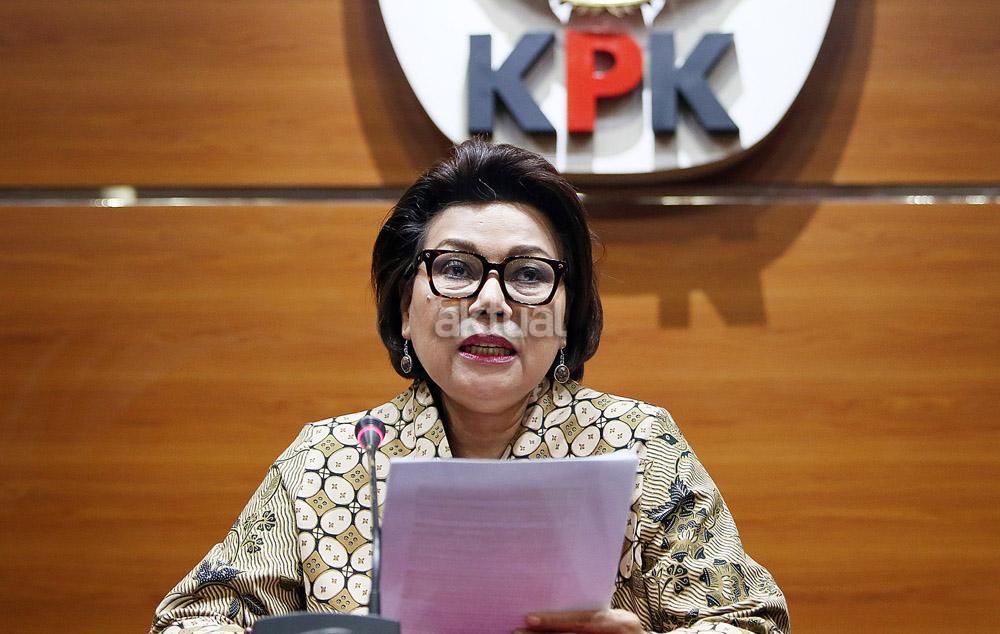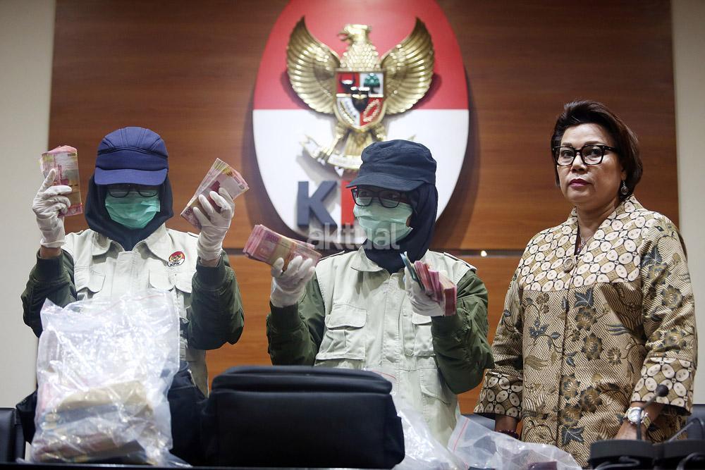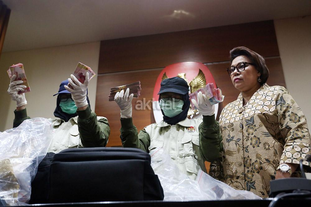 Wakil Ketua KPK Basaria Panjaitan saat konferensi pers menunjukkan barang bukti hasil operasi tangkap tangan (OTT) Bupati Nganjuk di Gedung KPK, Jakarta, Kamis (26/10). Dalam OTT tersebut KPK berhasil mengamankan gepokan uang senilai Rp 298 juta dan menetapkan 5 tersangka salah satunya Bupati Nganjuk Taufiqurrahman terkait suap jual beli jabatan. AKTUAL/Tino Oktaviano
