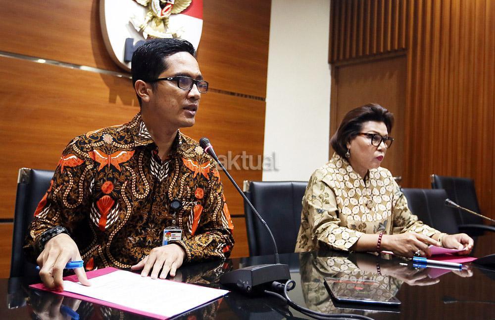 Wakil Ketua KPK Basaria Panjaitan (kanan) dan Juru bicara KPK Febri Diansyah (kiri) konferensi pers saat menunjukkan barang bukti hasil operasi tangkap tangan (OTT) Bupati Nganjuk di Gedung KPK, Jakarta, Kamis (26/10). Dalam OTT tersebut KPK berhasil mengamankan gepokan uang senilai Rp 298 juta dan menetapkan 5 tersangka salah satunya Bupati Nganjuk Taufiqurrahman terkait suap jual beli jabatan. AKTUAL/Tino Oktaviano