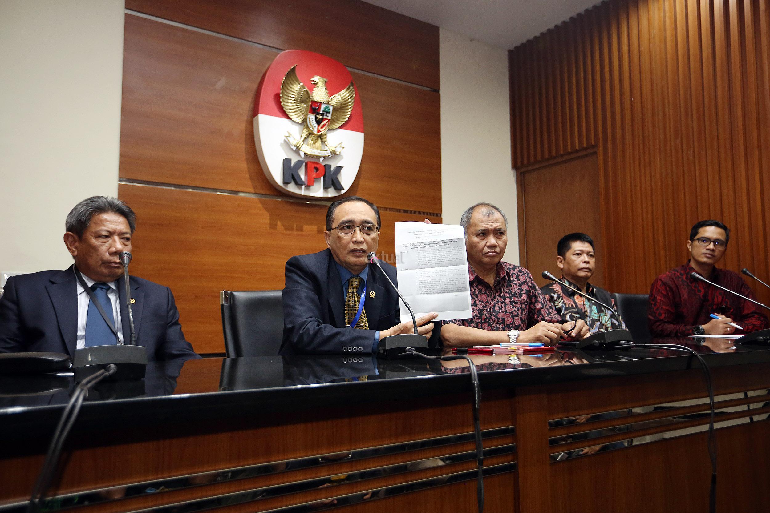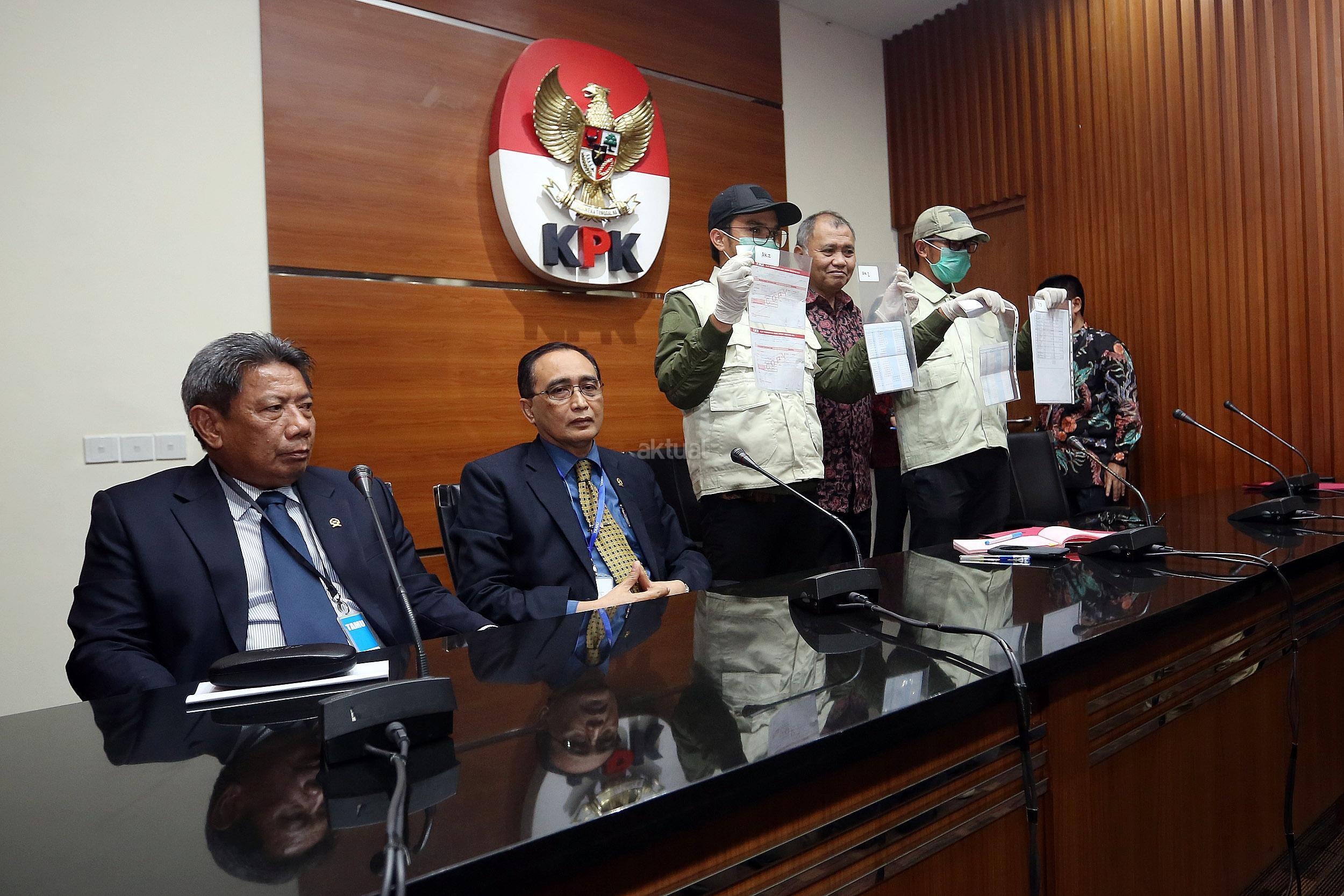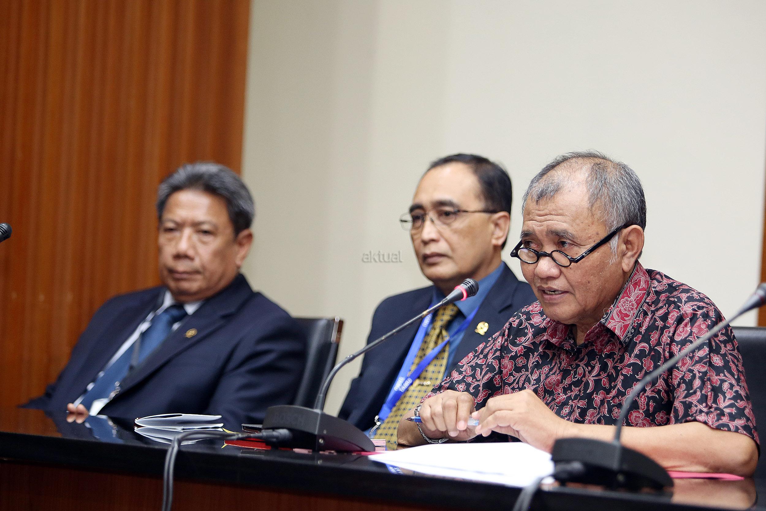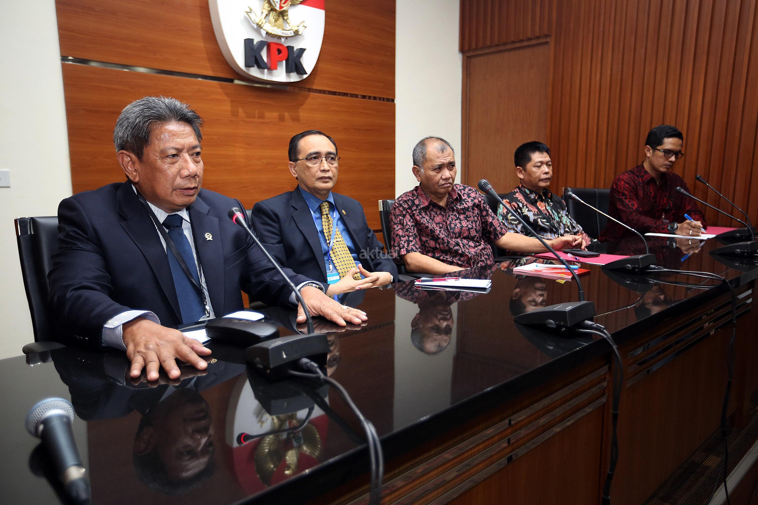 Ketua KPK Agus Rahardjo, Ketua Kamar Pengawasan Mahkamah Agung Sunarto, dan Juru Bicara MA Suhadi saat konferensi pers tentang OTT di Pengadilan Negeri Jakarta Selatan di Gedung KPK, Jakarta, Selasa (22/8). KPK mengamankan barang bukti berupa bukti transferan dan buku tabungan serta menetapkan dua orang tersangka yaitu panitera pengganti PN Jakarta Selatan Tarmizi dan pengacara bernama Akhmad dan mengamankan uang senilai Rp.425 juta terkait kasus suap untuk pengurusan perkara suatu perusahaan yaitu PT ADI (Aquamarine Divindo Inspection). AKTUAL/Tino Oktaviano