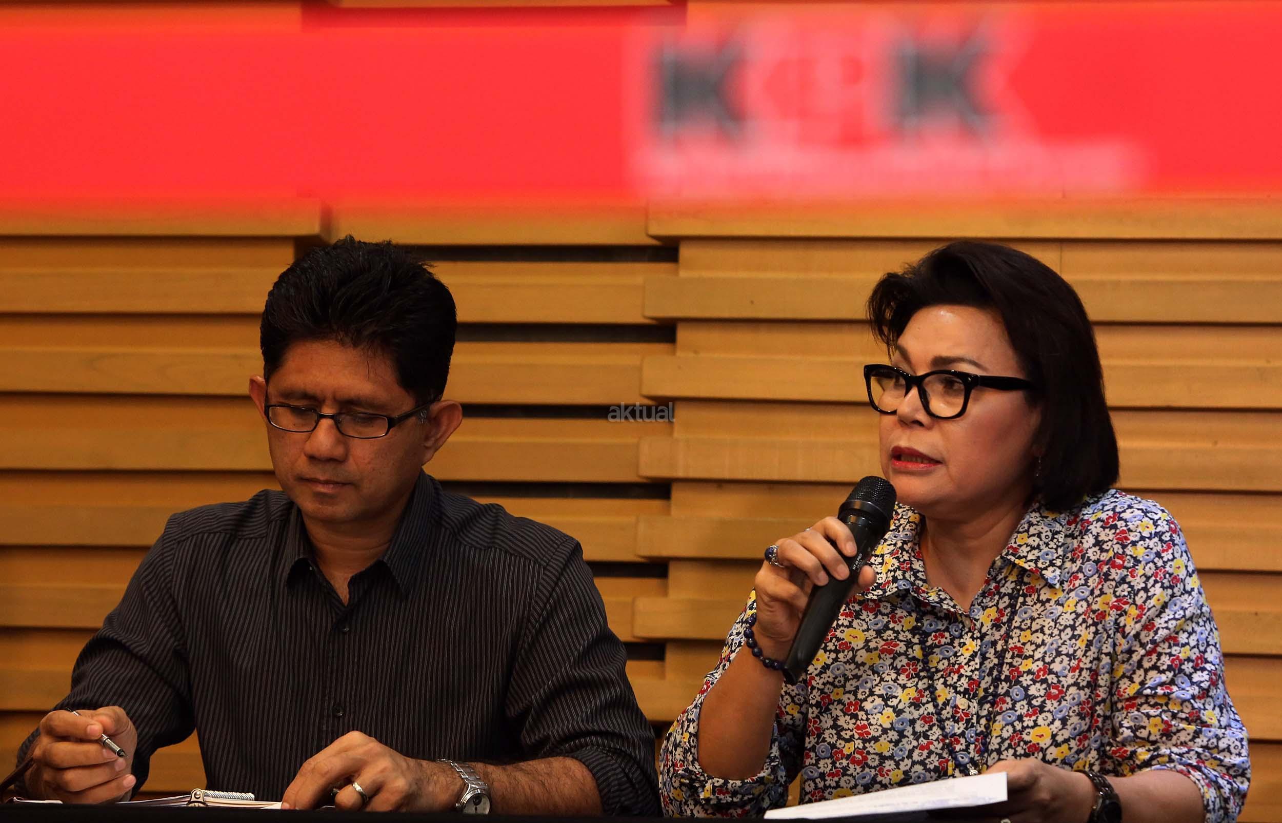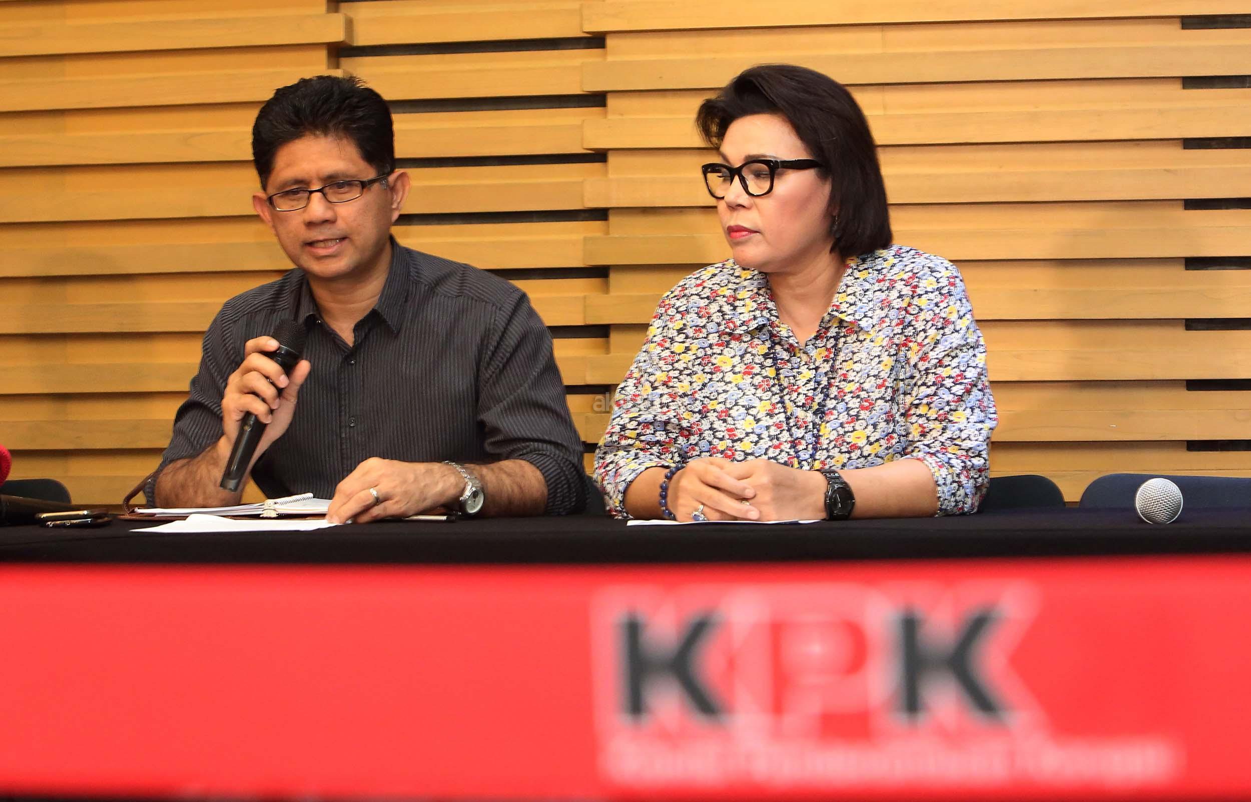 Wakil Ketua KPK Basaria Panjaitan (kanan) dan Laode M Syarif (kiri) memberikan keterangan terkait operasi tangkap tangan (OTT) kasus dugaan suap proyek pendidikan Pemkab Kebumen, Jateng, di gedung KPK Jakarta, Minggu (16/10/2016). KPK menetapkan Ketua Komisi A DPRD Kebumen dari Fraksi PDIP Yudi Tri Hartanto dan PNS di Dinas Pariwisata Pemkab Kebumen Sigit Widodo menjadi tersangka, empat orang lainnya berstatus saksi serta satu orang masih buron terkait operasi tangkap tangan proyek pendidikan senilai Rp4,8 miliar dengan barang bukti uang yang disita sebesar Rp70 juta.