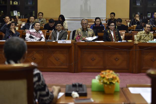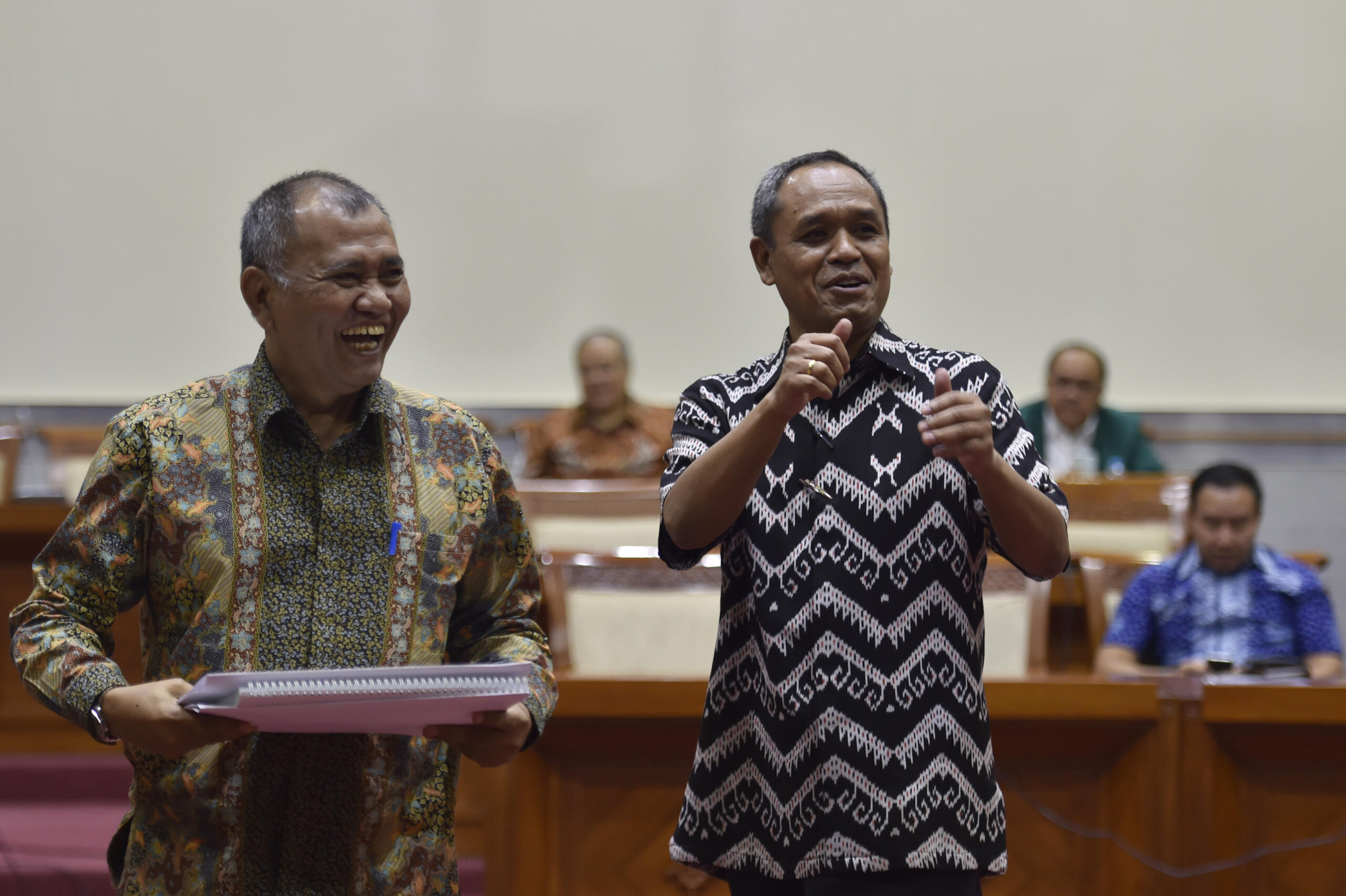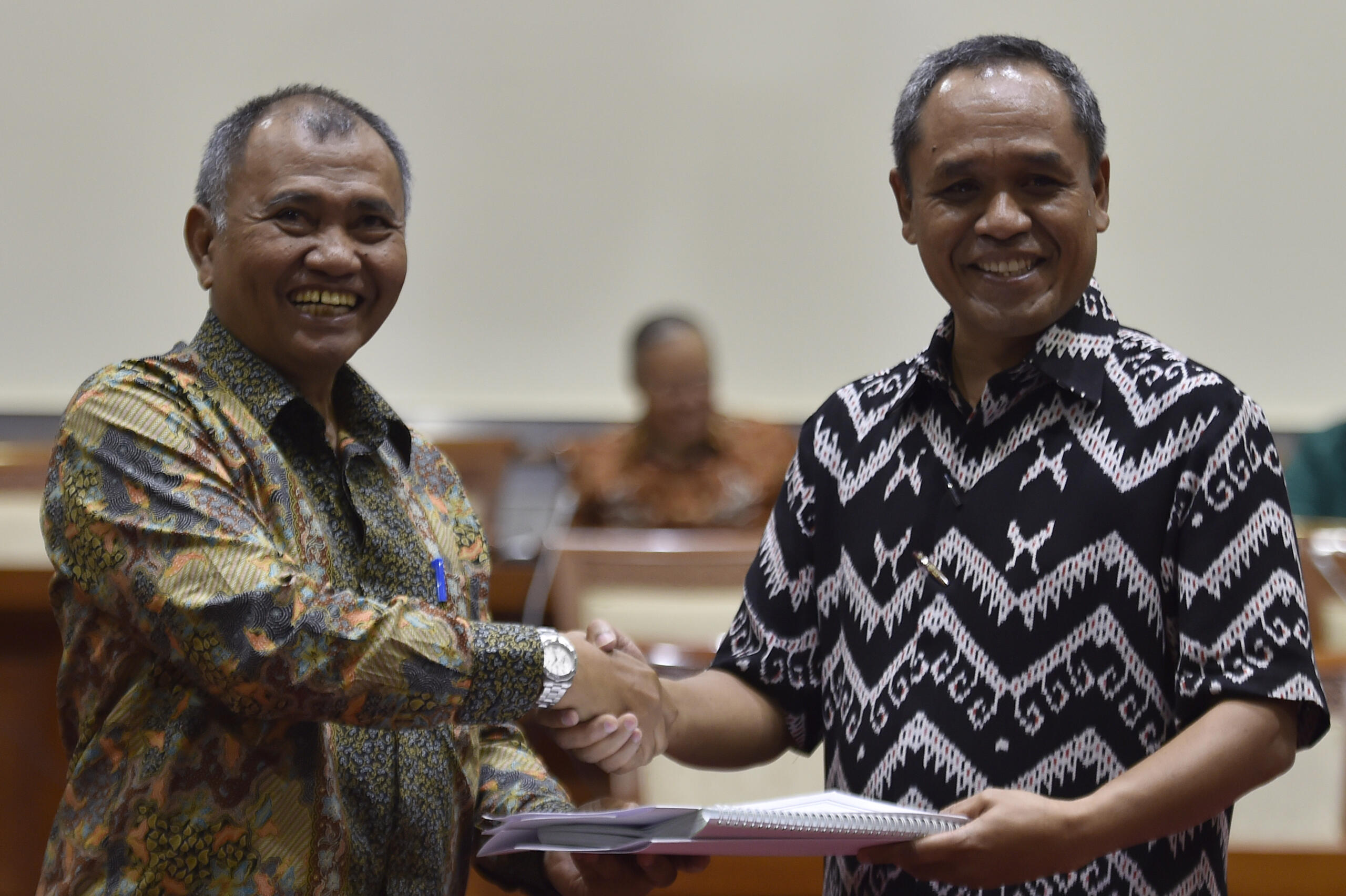 Ketua KPK Agus Rahardjo (kiri) menerima salinan pengaduan masyarakat dari Wakil Ketua Komisi III Benny K Harman di sela-sela Rapat Dengar Pendapat di Komplek Parlemen Senayan, Jakarta, Rabu (15/6). Dalam rapat tersebut KPK menyampaikan bahwa tidak menemukan perbuatan melawan hukum dalam pembelian lahan Rumah Sakit Sumber Waras seluas 3,64 hektare oleh Pemerintah DKI Jakarta pada 2014. ANTARA FOTO/Puspa Perwitasari/aww/16.