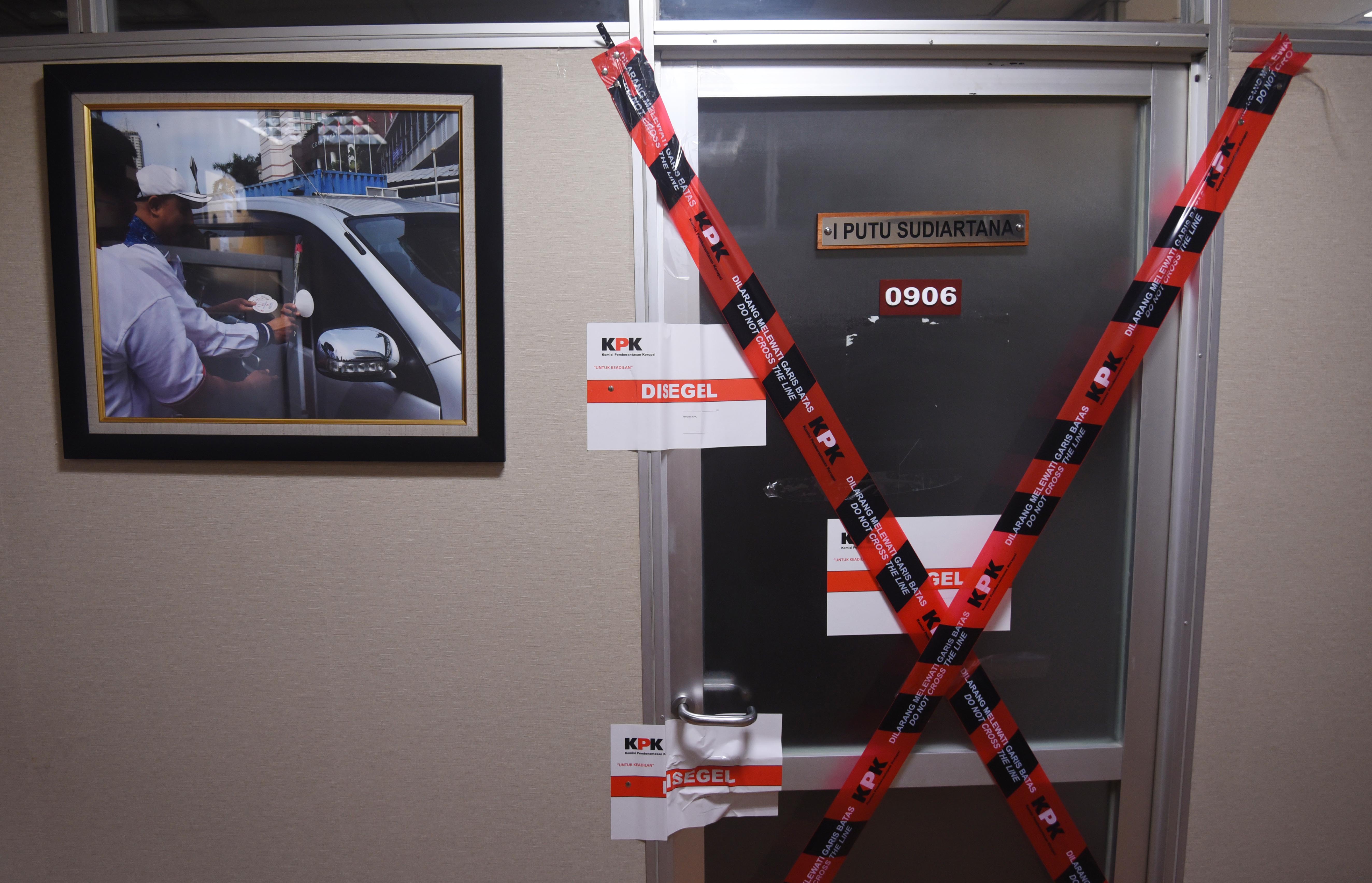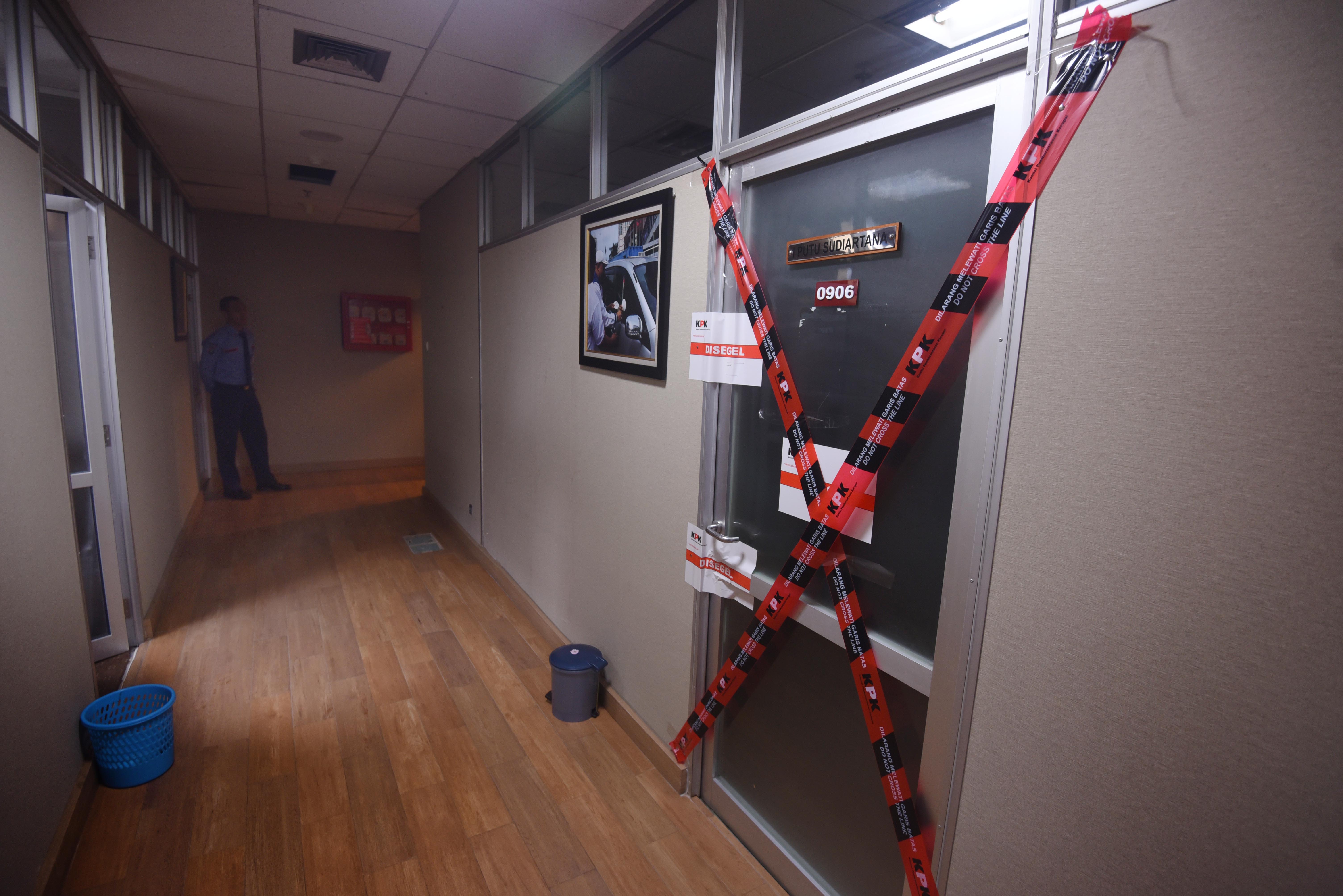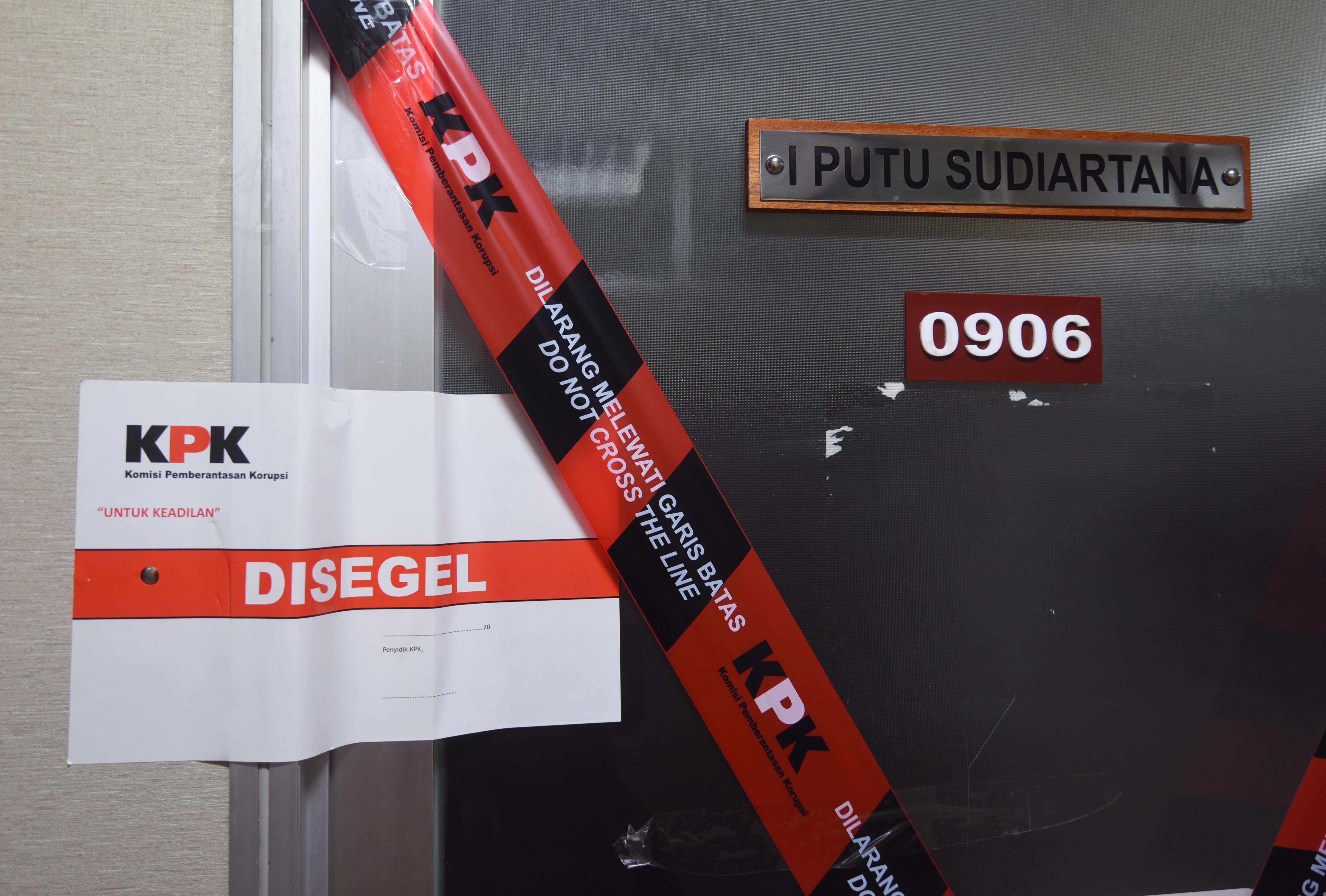 Pintu ruangan Anggota Komisi III DPR dari Fraksi Partai Demokrat I Putu Sudiartana disegel oleh KPK di Kompleks Parlemen Senayan, Jakarta, Rabu (29/6). I Putu ditangkap oleh KPK dalam operasi tangkap tangan pada Selasa (28/6) malam. ANTARA FOTO/Akbar Nugroho Gumay/aww/16.