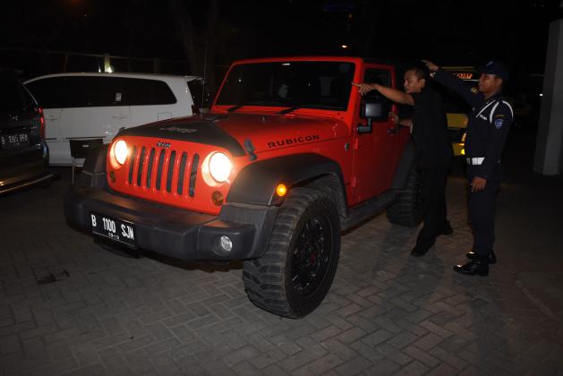 Satu unit Mobil Jeep Rubicon yang disita KPK dibawa menuju parkiran Gedung KPK, Jakarta, Kamis (28/4). Setelah menyita Mobil Jeep Wrangler dan Toyota Vellfire hasil gratifikasi milik Bupati Subang Ojang Sohandi yang telah menjadi tersangka dugaan pemberi suap terkait perkara suap BPJS di Kejaksaan Tinggi Jawa Barat, KPK kembali menyita satu Mobil Jeep Rubicon berplat nomor B 1100 SJM, Satu motor trail KTM 500 cc, dan satu unit ATV 700 cc keluaran Toyota berplat nomor D 3 OZ. ANTARA FOTO/Hafidz Mubarak A./pd/16