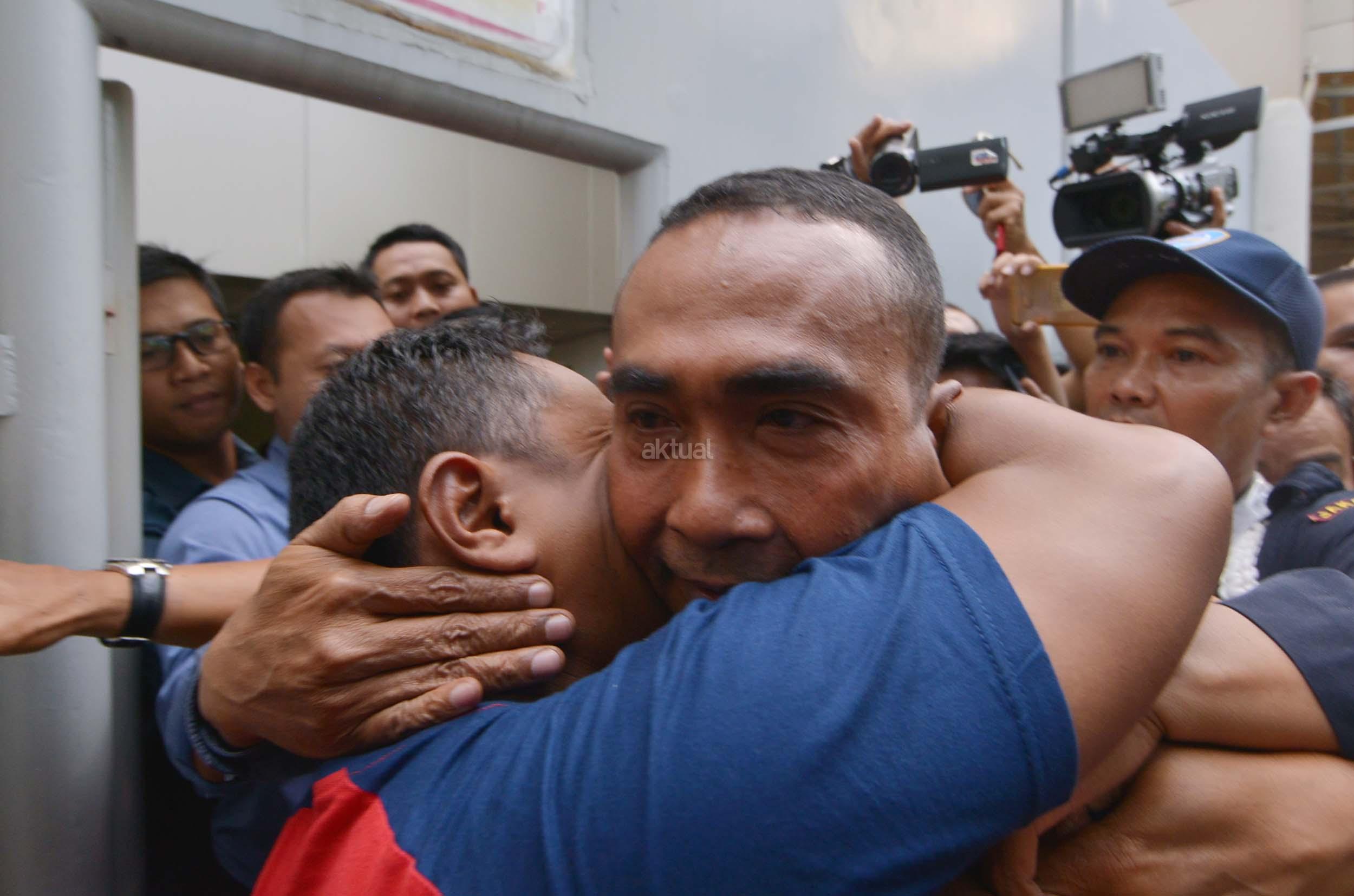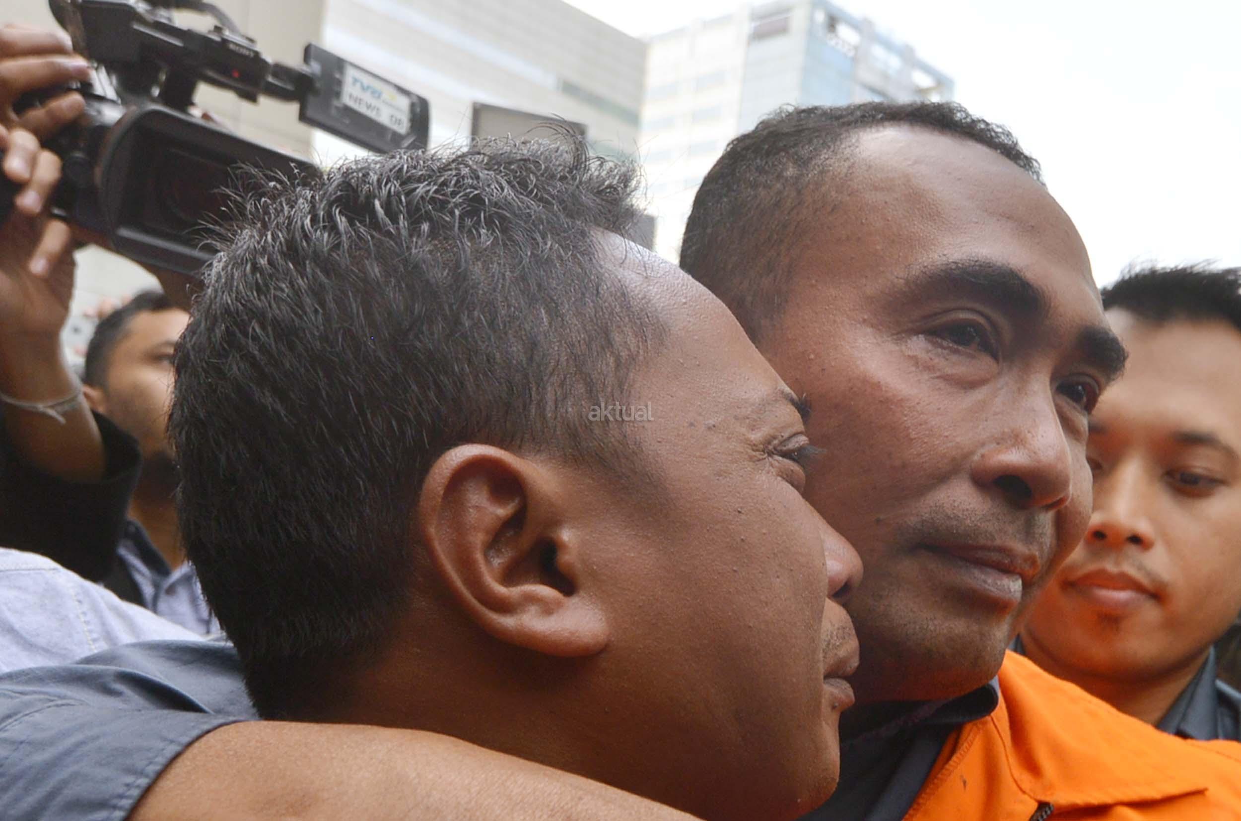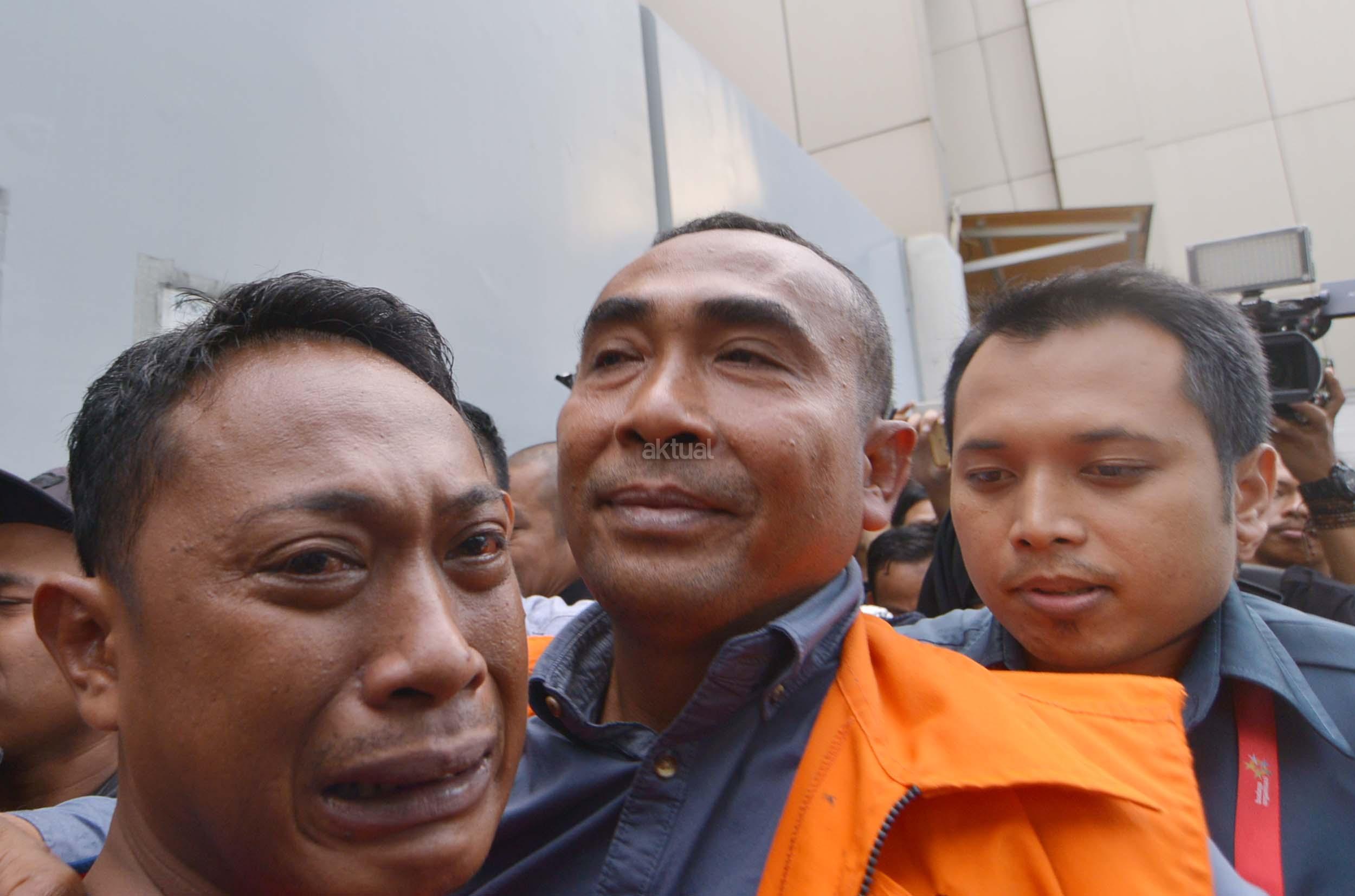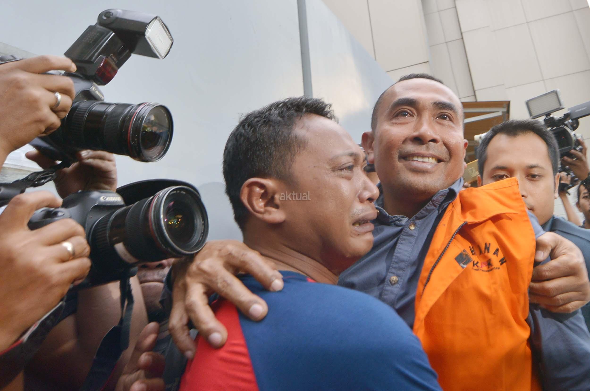 Bupati nonaktif Buton Samsu Umar Abdul Samiun (kiri) mengenakan baju tahanan seusai menjalani pemeriksaan di gedung KPK, Jakarta, Kamis (26/1/2017). KPK menahan Samsu Umar Abdul Samiun setelah dijemput paksa karena mangkir dua kali pemeriksaan sebagai tersangka kasus dugaan suap kepada mantan Ketua Mahkamah Konstitusi (MK) Akil Mochtar terkait sengketa pemilukada Buton tahun 2011.