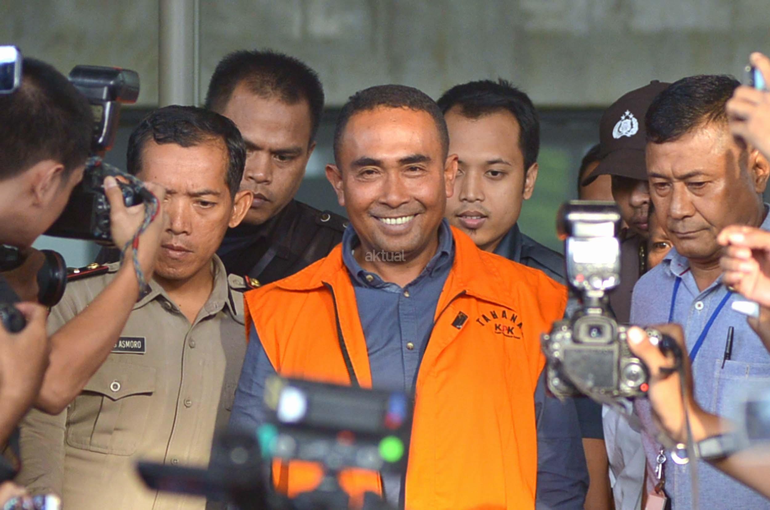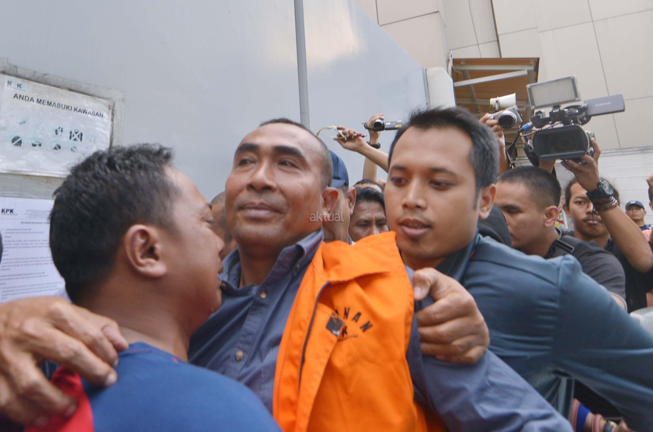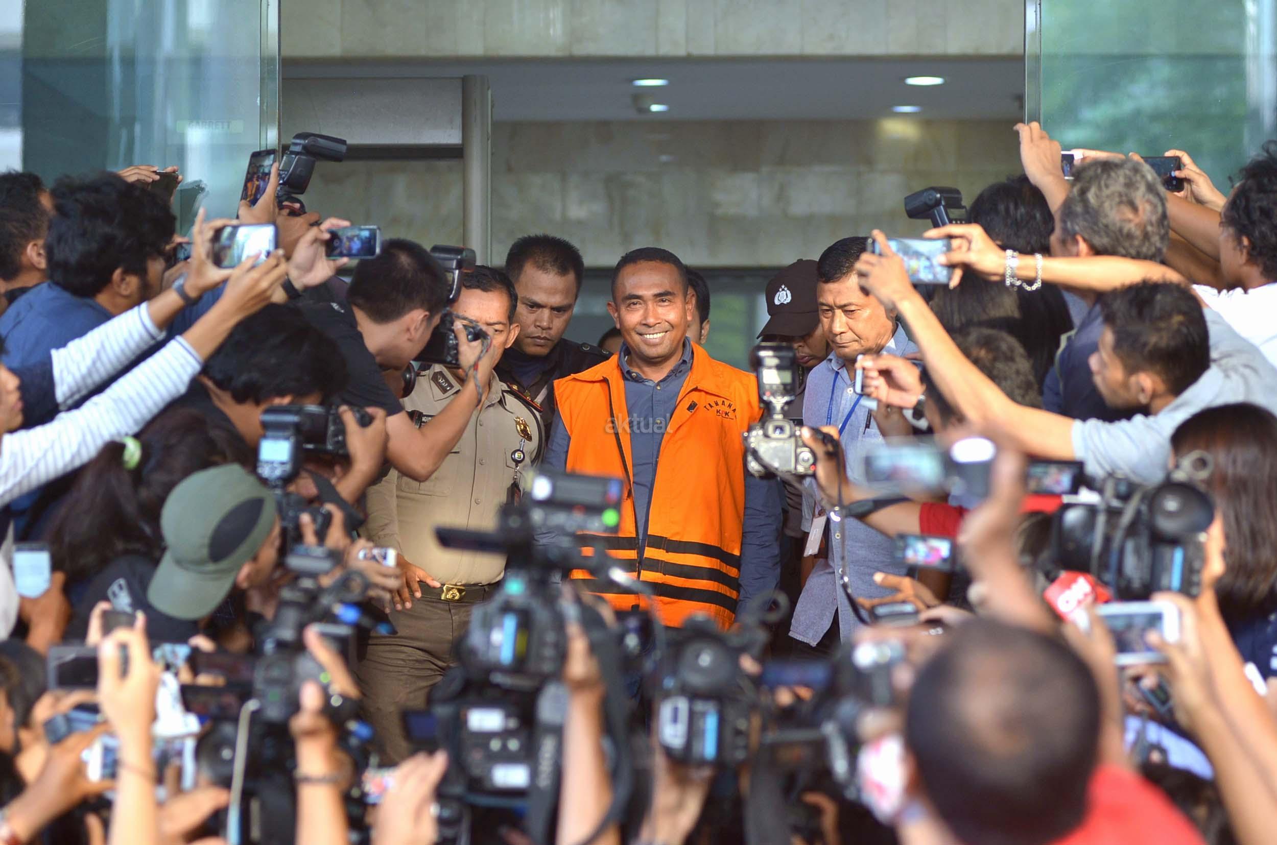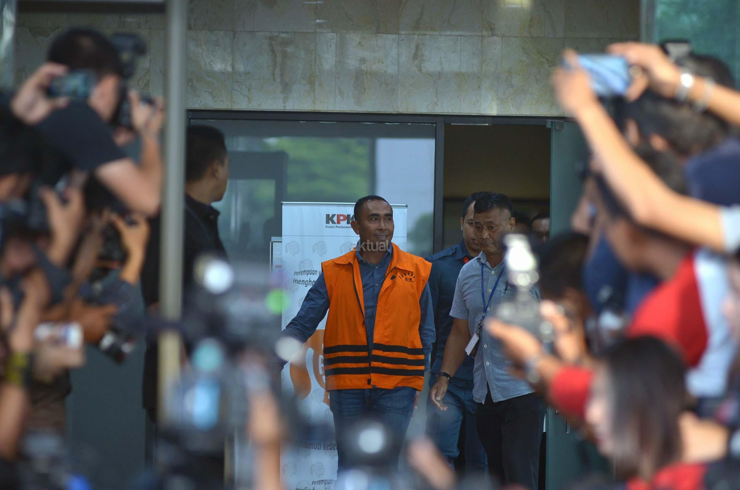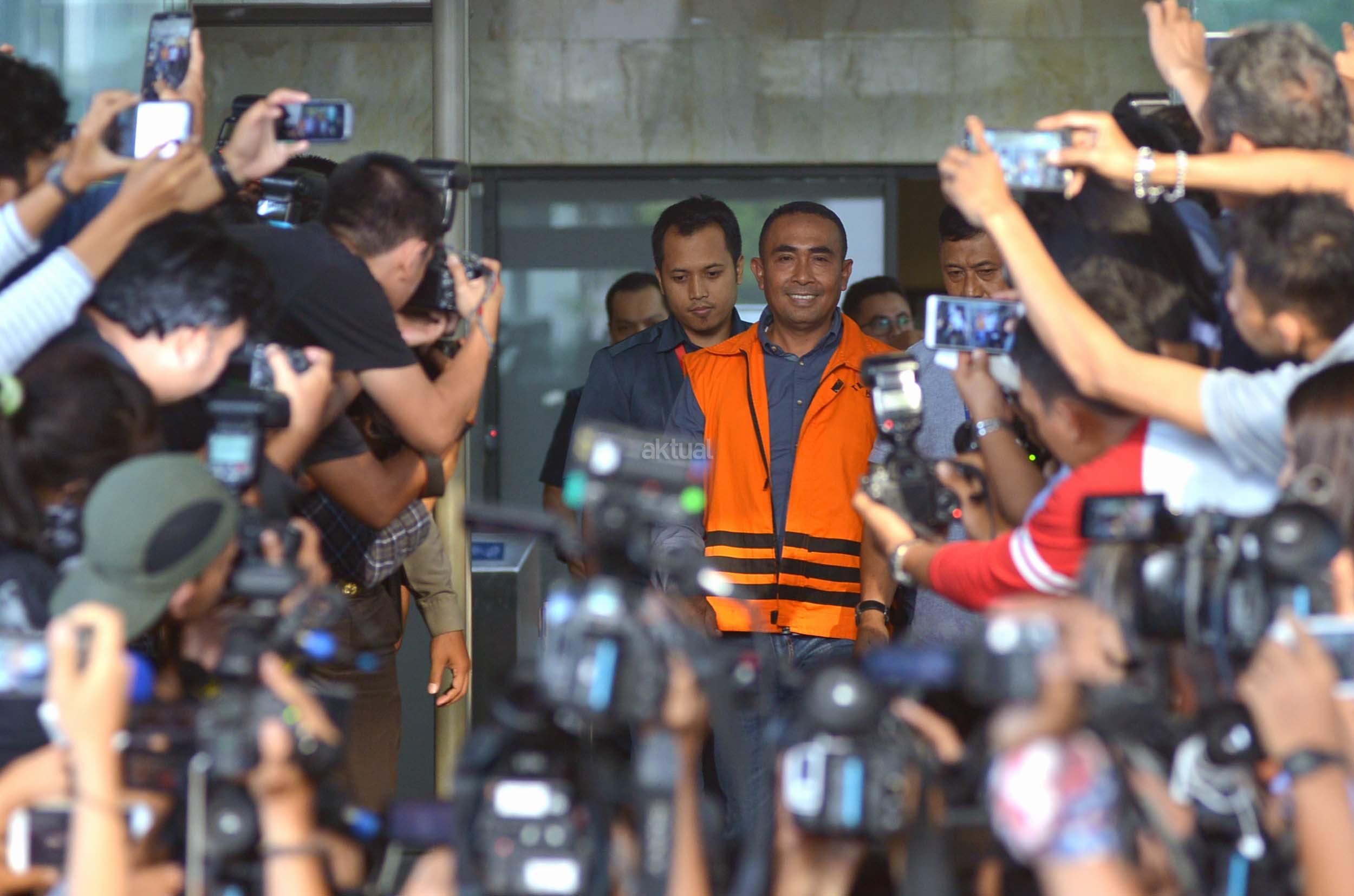 Bupati nonaktif Buton Samsu Umar Abdul Samiun mengenakan baju tahanan seusai menjalani pemeriksaan di gedung KPK, Jakarta, Kamis (26/1/2017). KPK menahan Samsu Umar Abdul Samiun setelah dijemput paksa karena mangkir dua kali pemeriksaan sebagai tersangka kasus dugaan suap kepada mantan Ketua Mahkamah Konstitusi (MK) Akil Mochtar terkait sengketa pemilukada Buton tahun 2011.