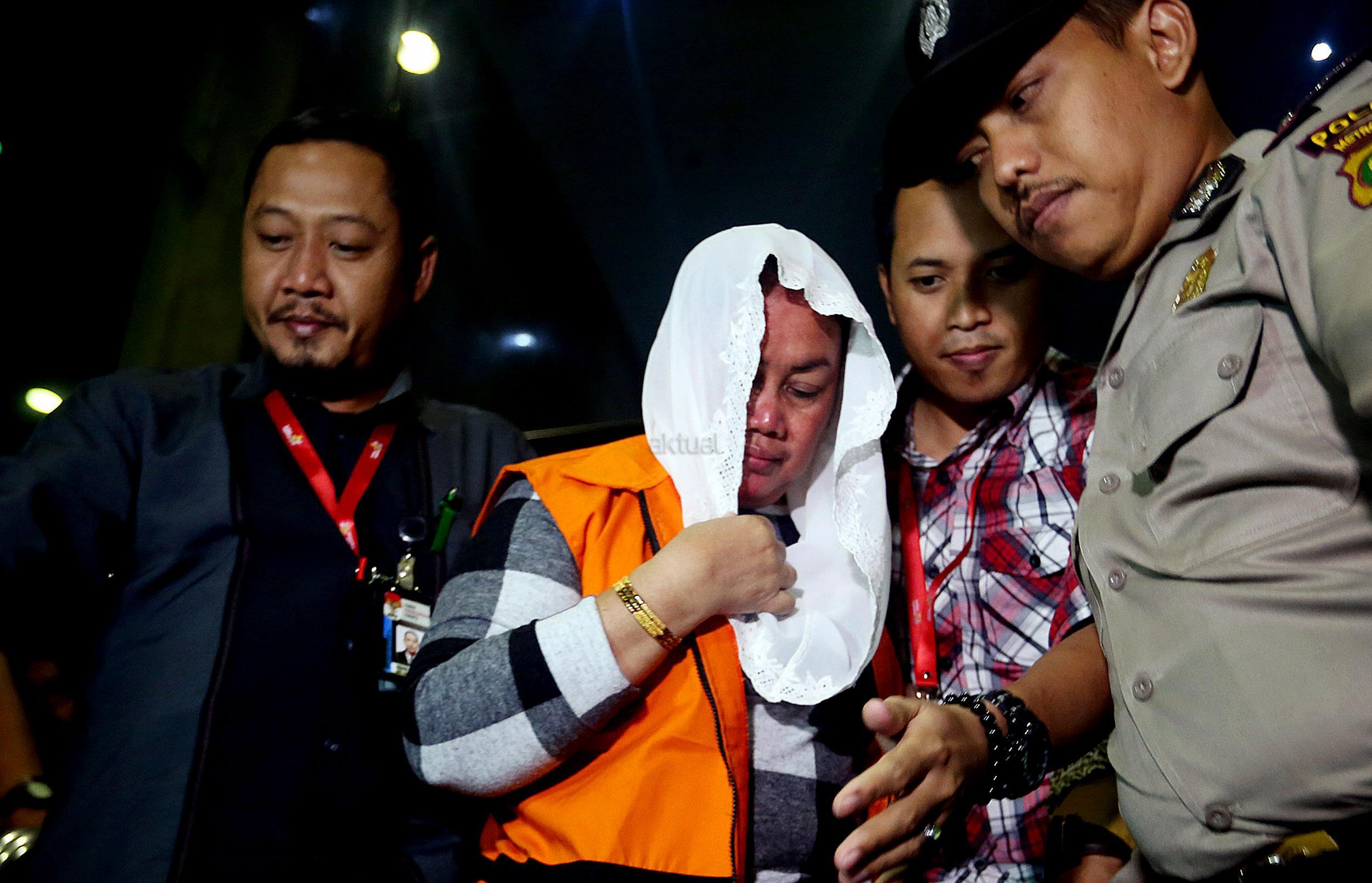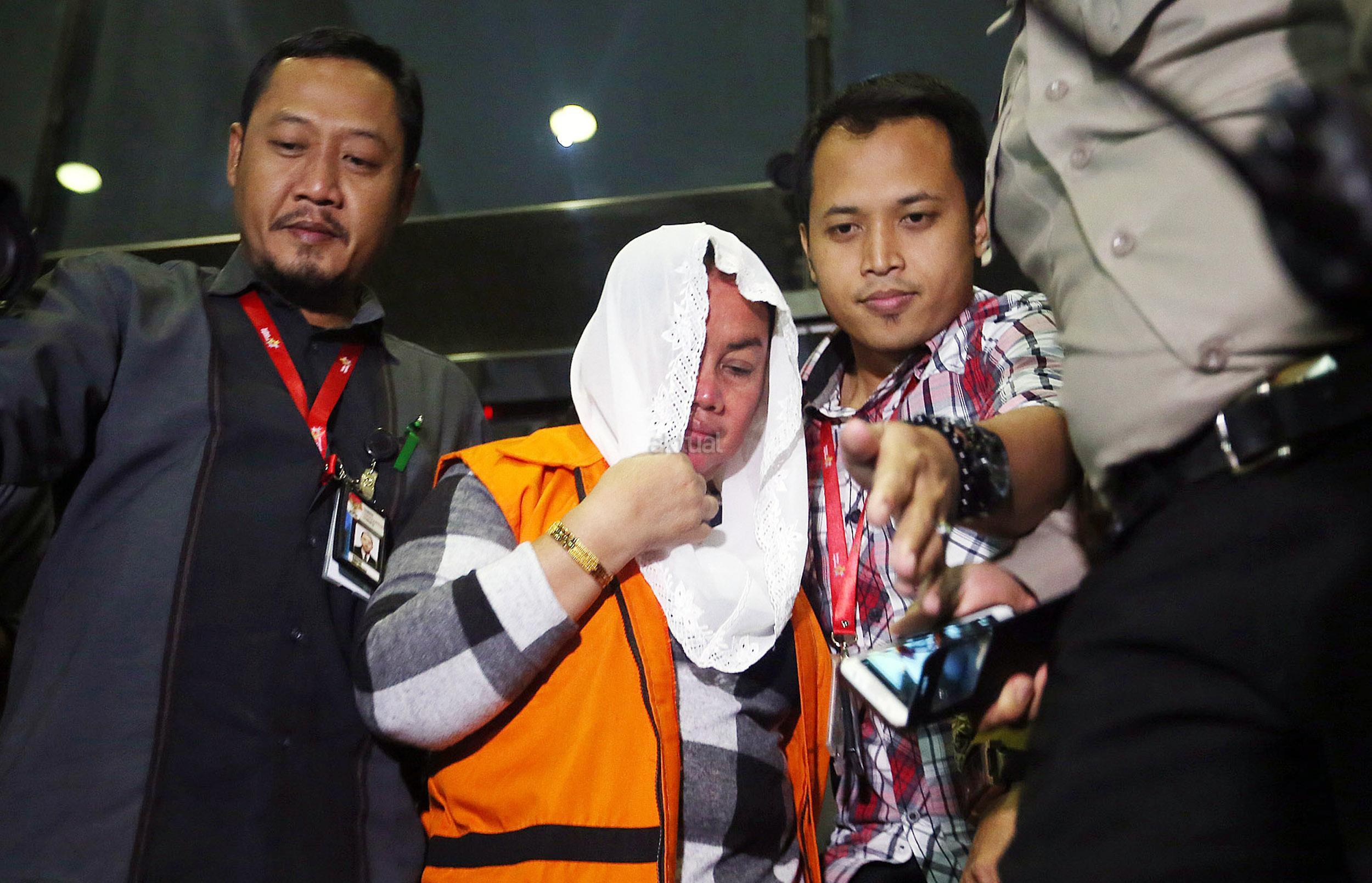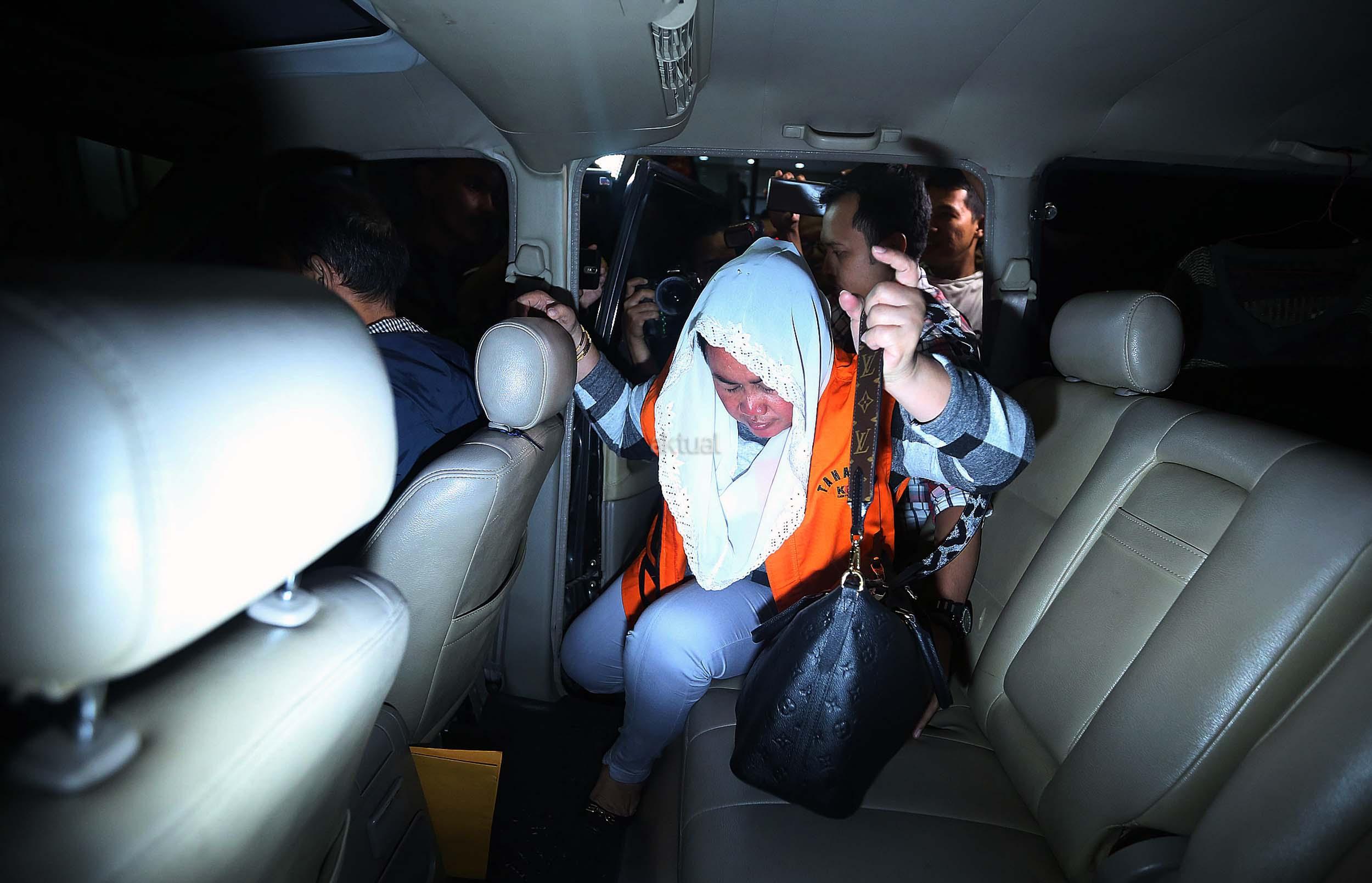 Bupati Klaten Sri Hartini masuk ke dalam mobil dengan menggunakan rompi tahanan usai menjalani pemeriksaan di Gedung KPK, Jakarta, Sabtu (31/12/2016). KPK telah menetapkan status tersangka dan menahan Bupati Klaten Sri Hartini dan Kepala Seksi Sekolah Menengah Pertama (SMP) Dinas Pendidikan Kabupaten Klaten Suramlan dalam kasus dugaan suap pengaturan jabatan di lingkungan Pemerintah Kabupaten Klaten dengan barang bukti uang Rp2 miliar.