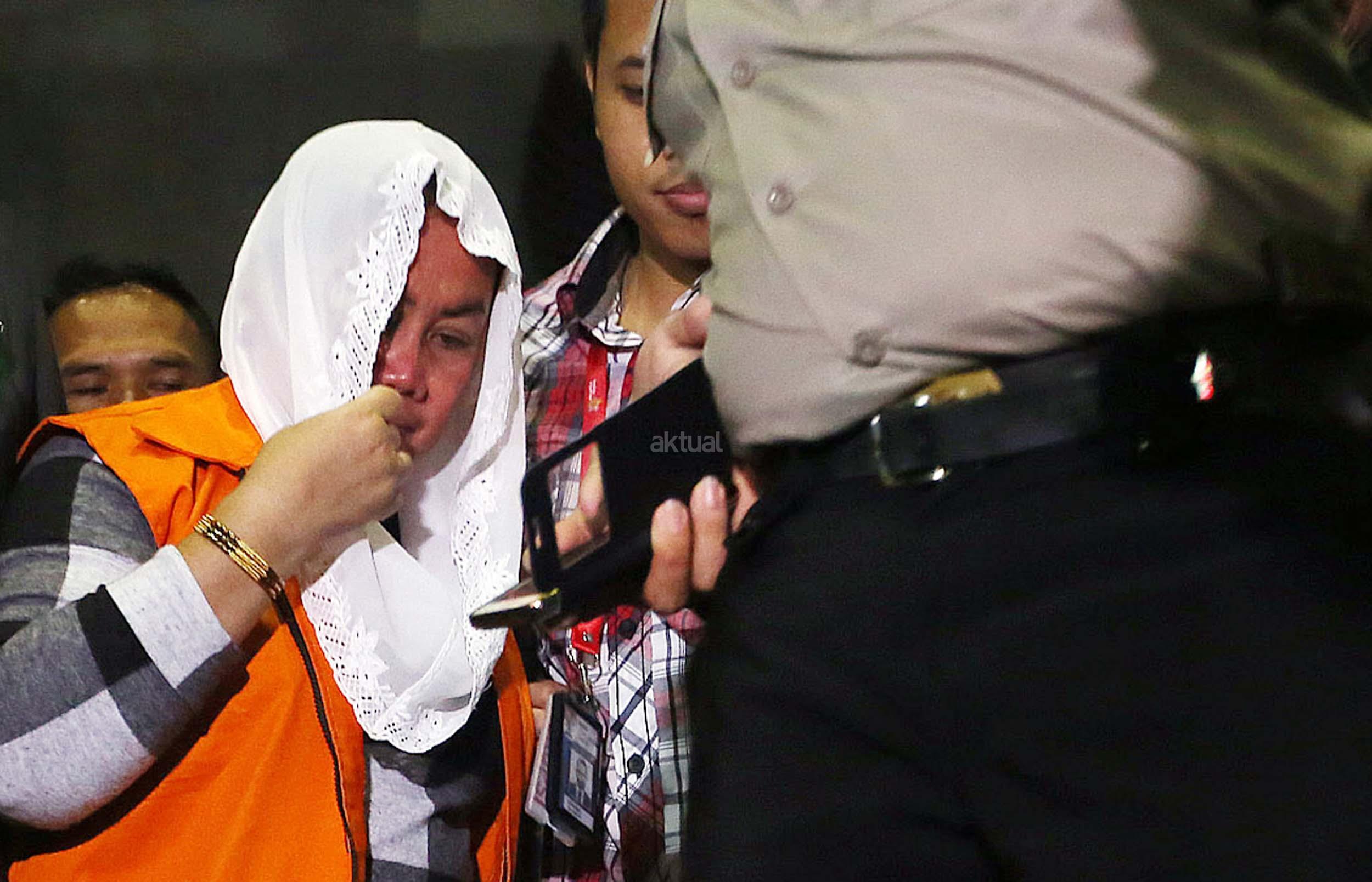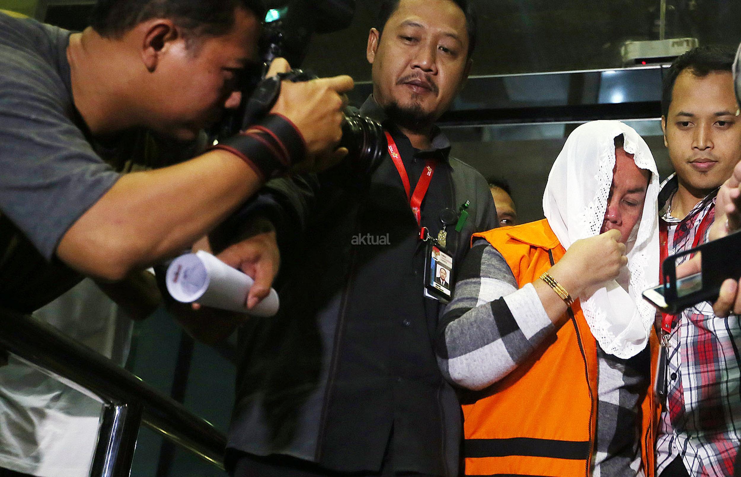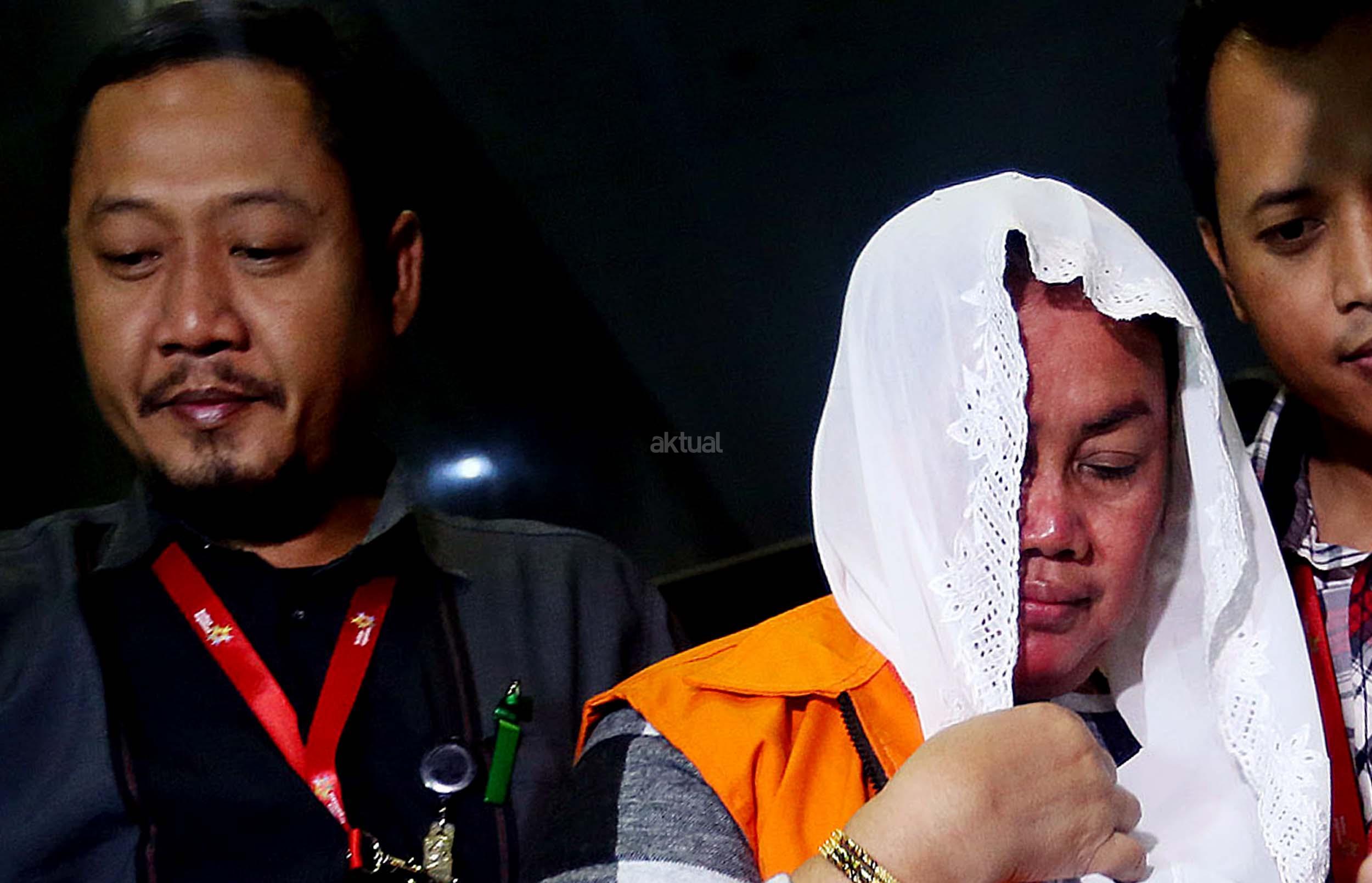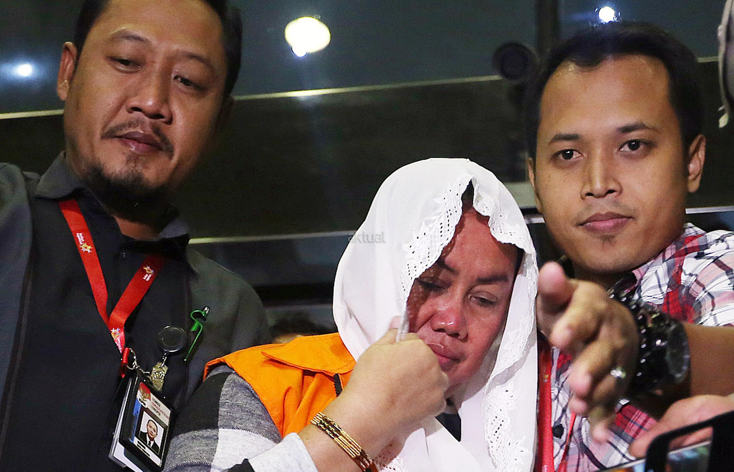 Bupati Klaten Sri Hartini masuk ke dalam mobil dengan menggunakan rompi tahanan usai menjalani pemeriksaan di Gedung KPK, Jakarta, Sabtu (31/12/2016). KPK telah menetapkan status tersangka dan menahan Bupati Klaten Sri Hartini dan Kepala Seksi Sekolah Menengah Pertama (SMP) Dinas Pendidikan Kabupaten Klaten Suramlan dalam kasus dugaan suap pengaturan jabatan di lingkungan Pemerintah Kabupaten Klaten dengan barang bukti uang Rp2 miliar.