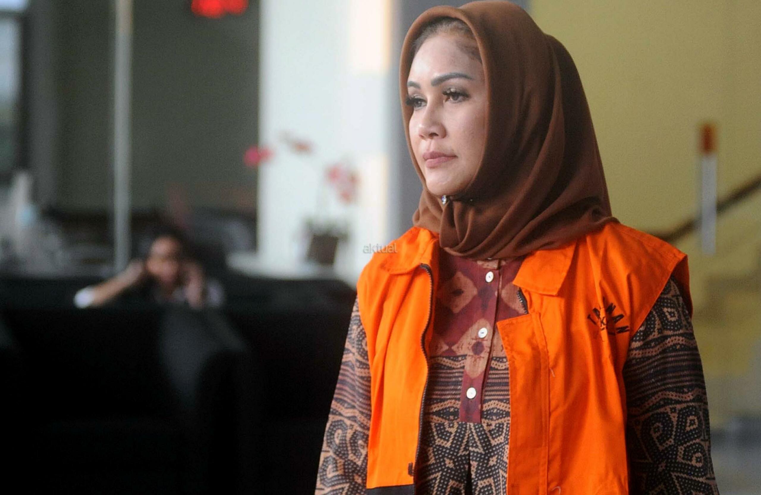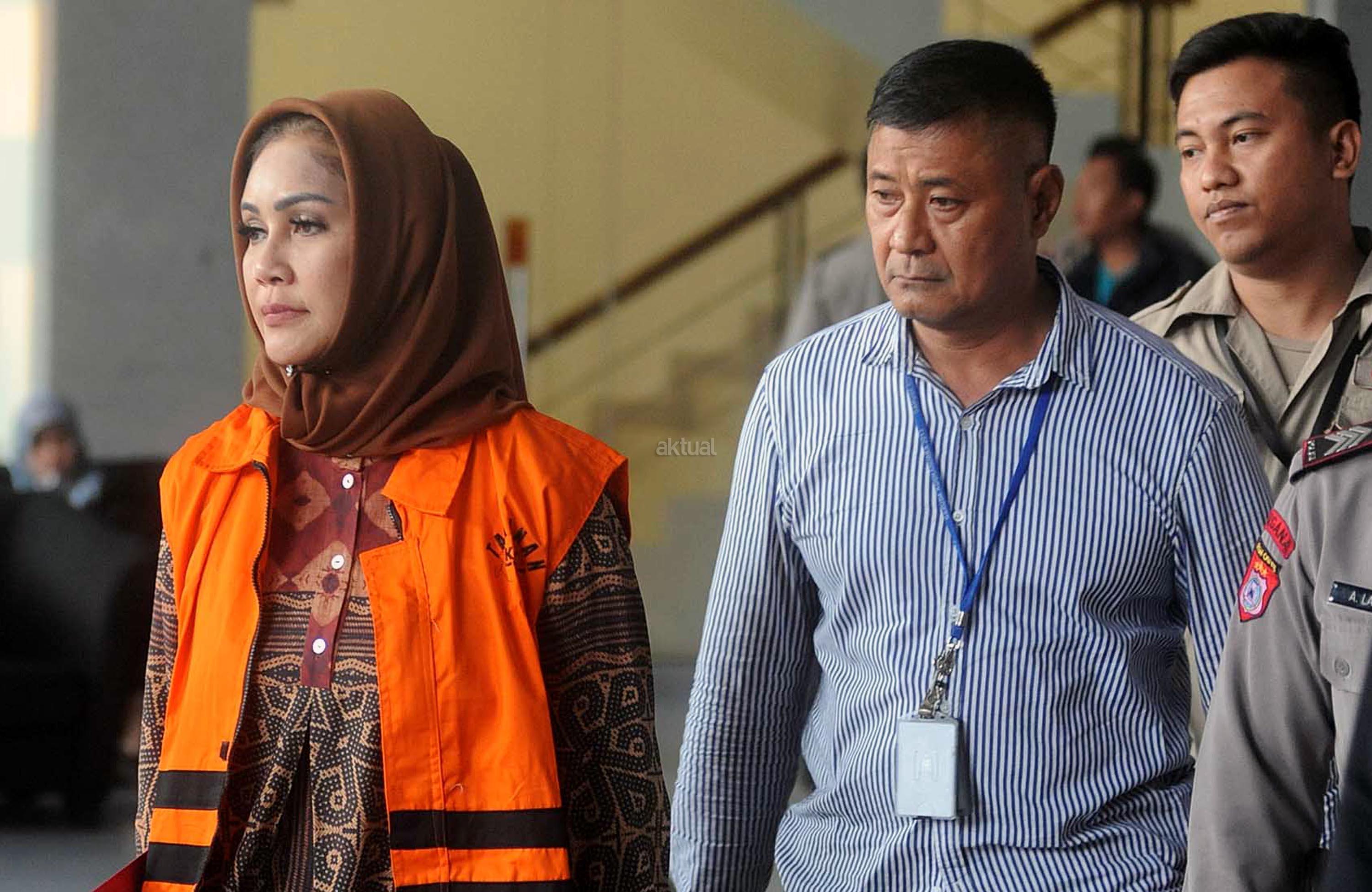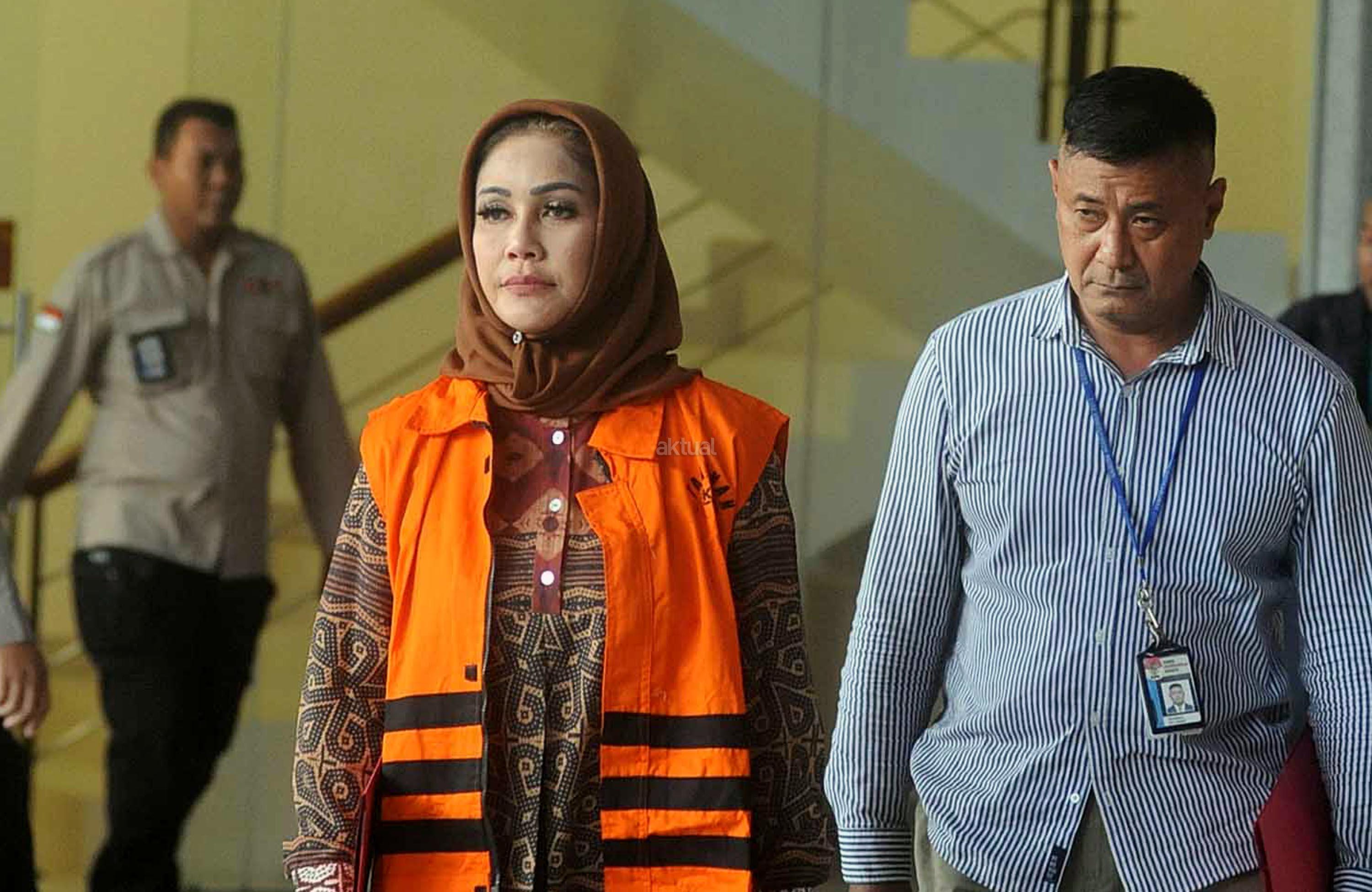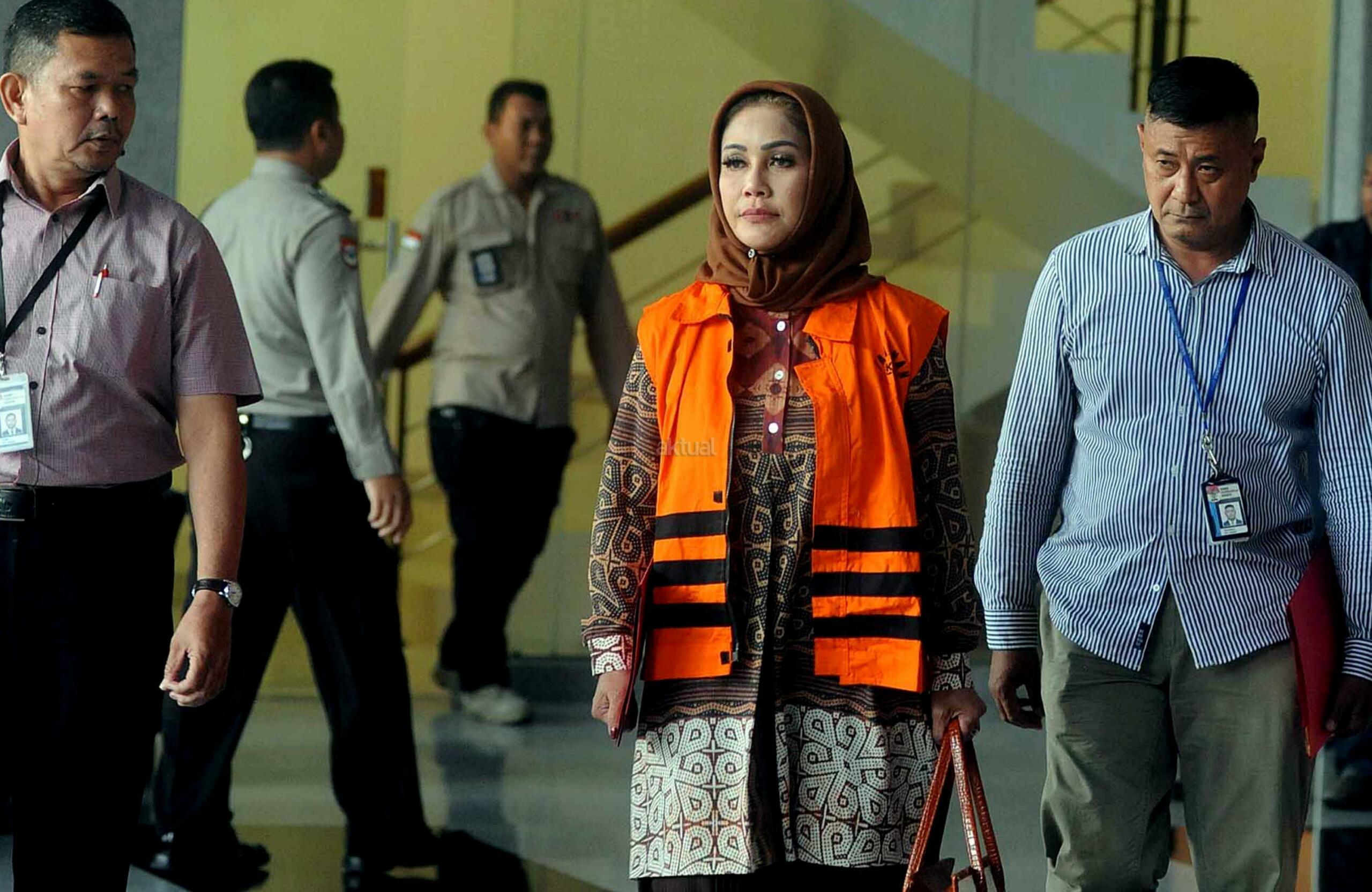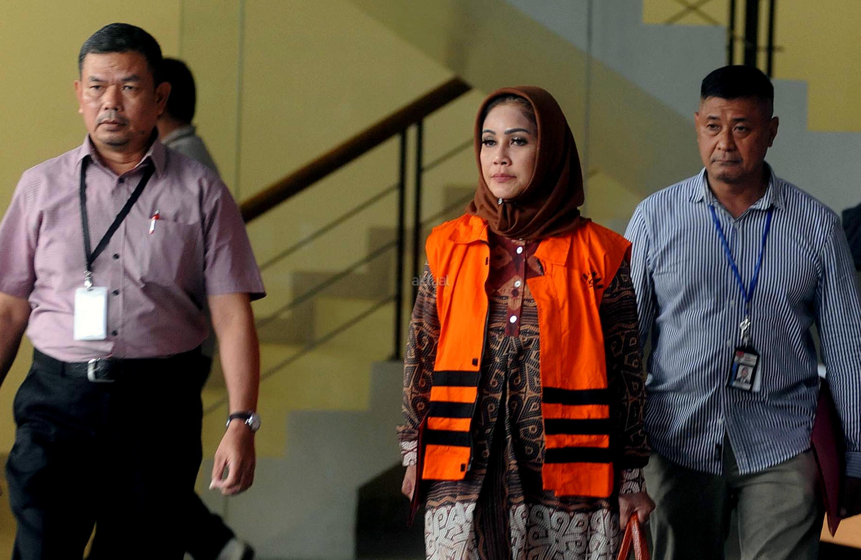 Wali Kota Tegal Siti Masitha Soeparno (tengah) mengenakan rompi tahanan seusai diperiksa di gedung KPK, Jakarta, Rabu (30/8/2017). KPK menahan Siti Masitha yang terjaring dalam operasi tangkap tangan di Tegal. AKTUAL/Munzir